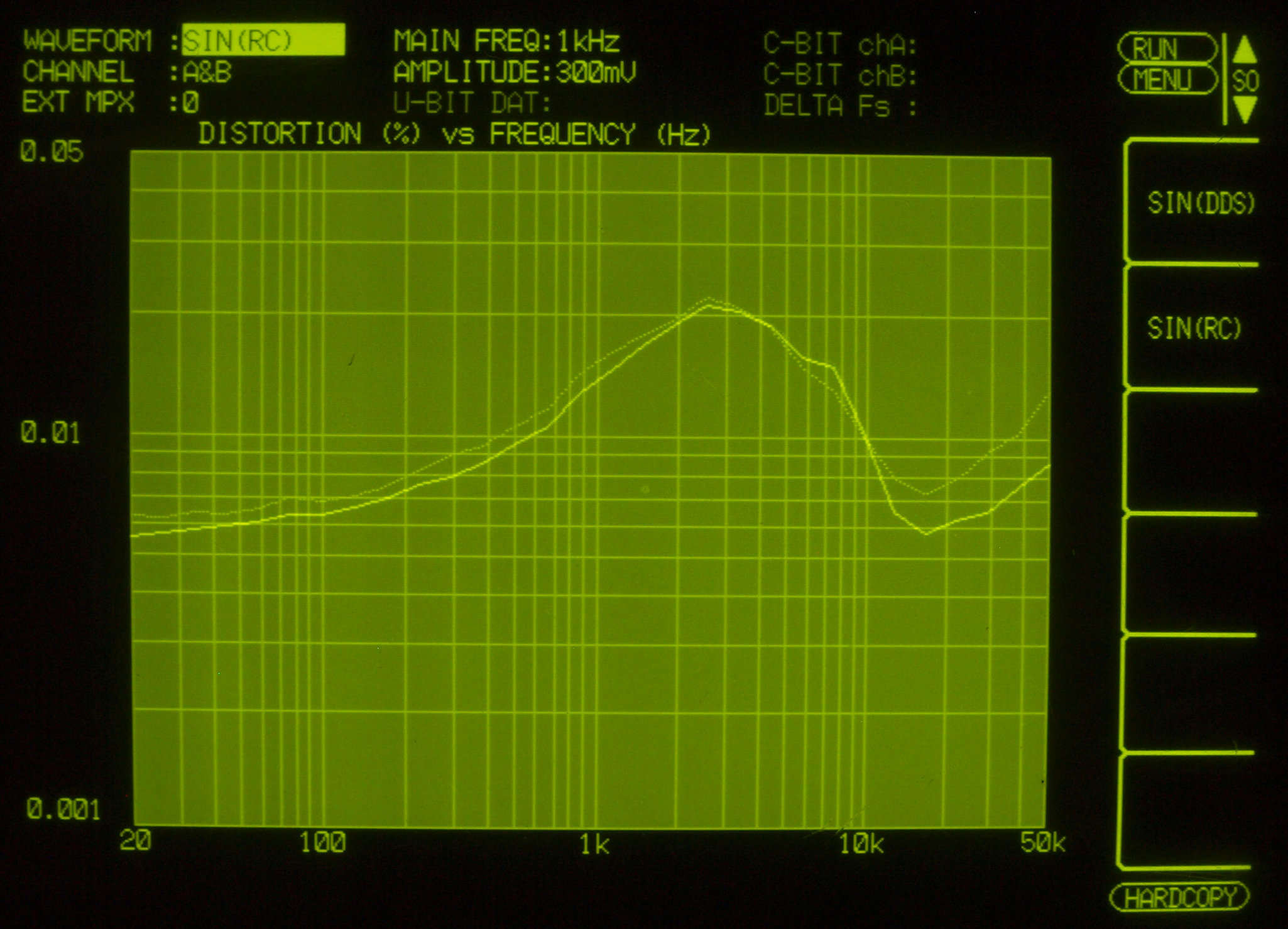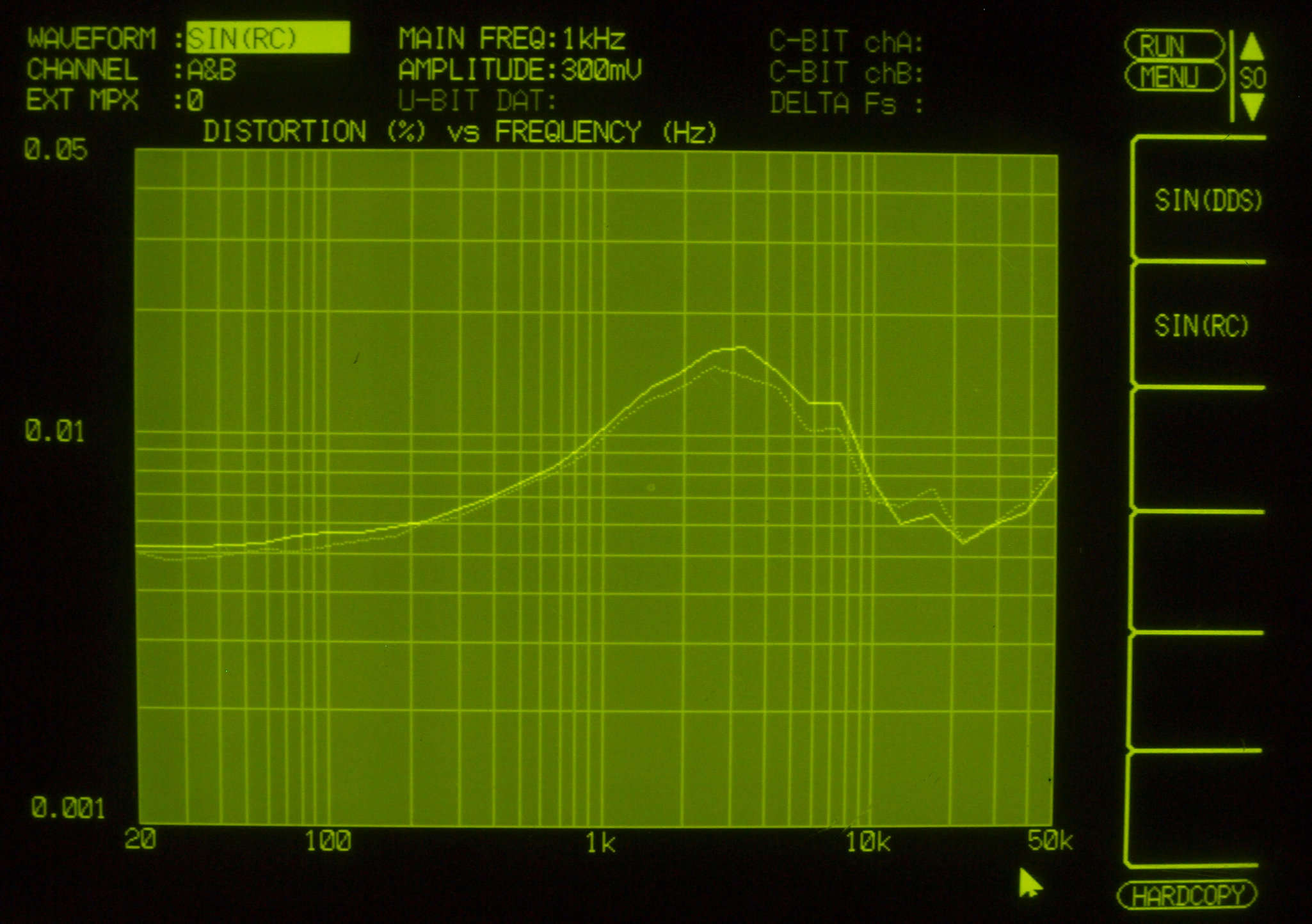 | F12. 歪み率特性測定(Line1入力、OUT1出力) Line1入力端子へ300mV一定入力 VRはmax。 左出力=薄(細い)色 右出力=濃い(太い)色 |