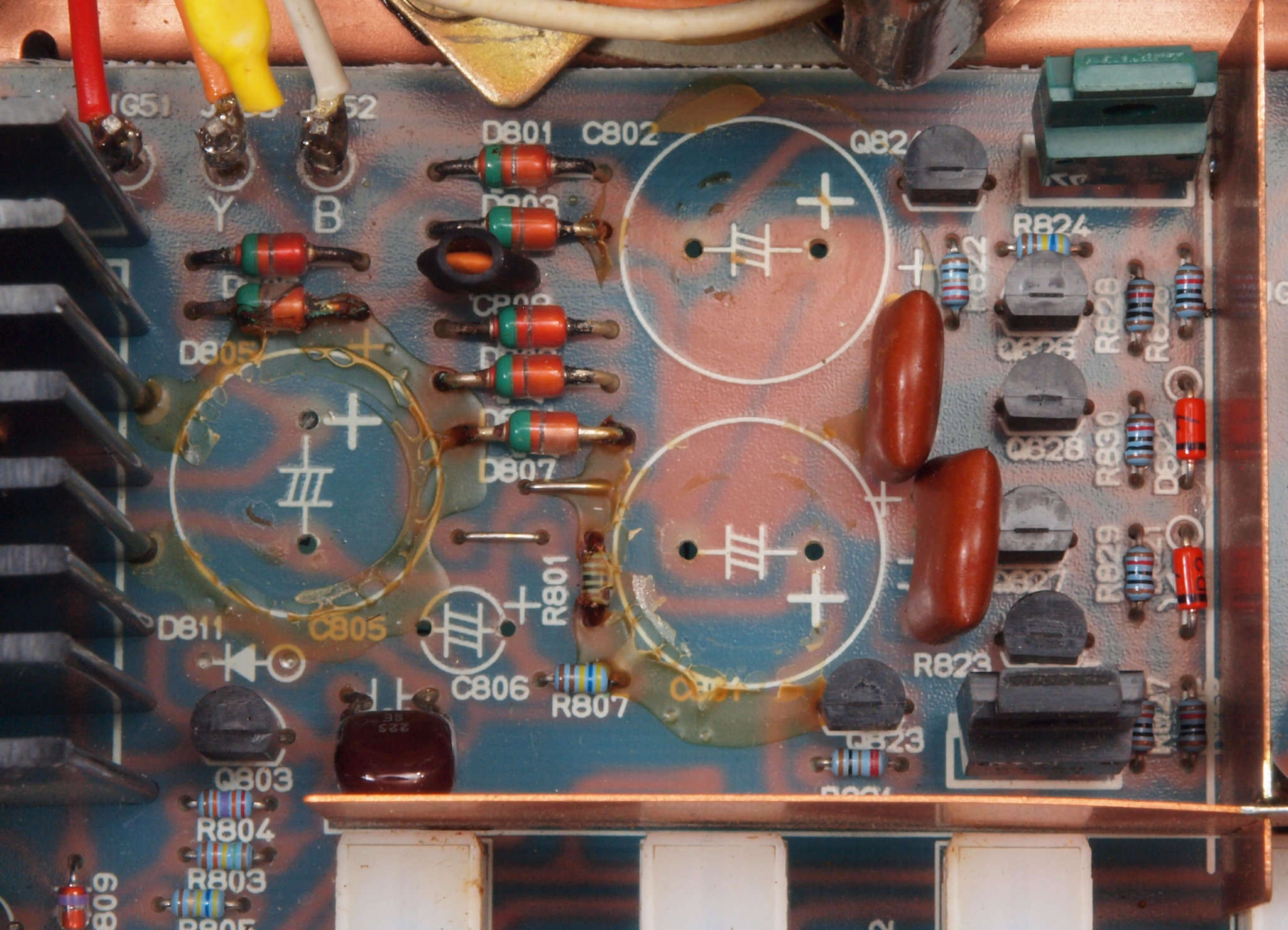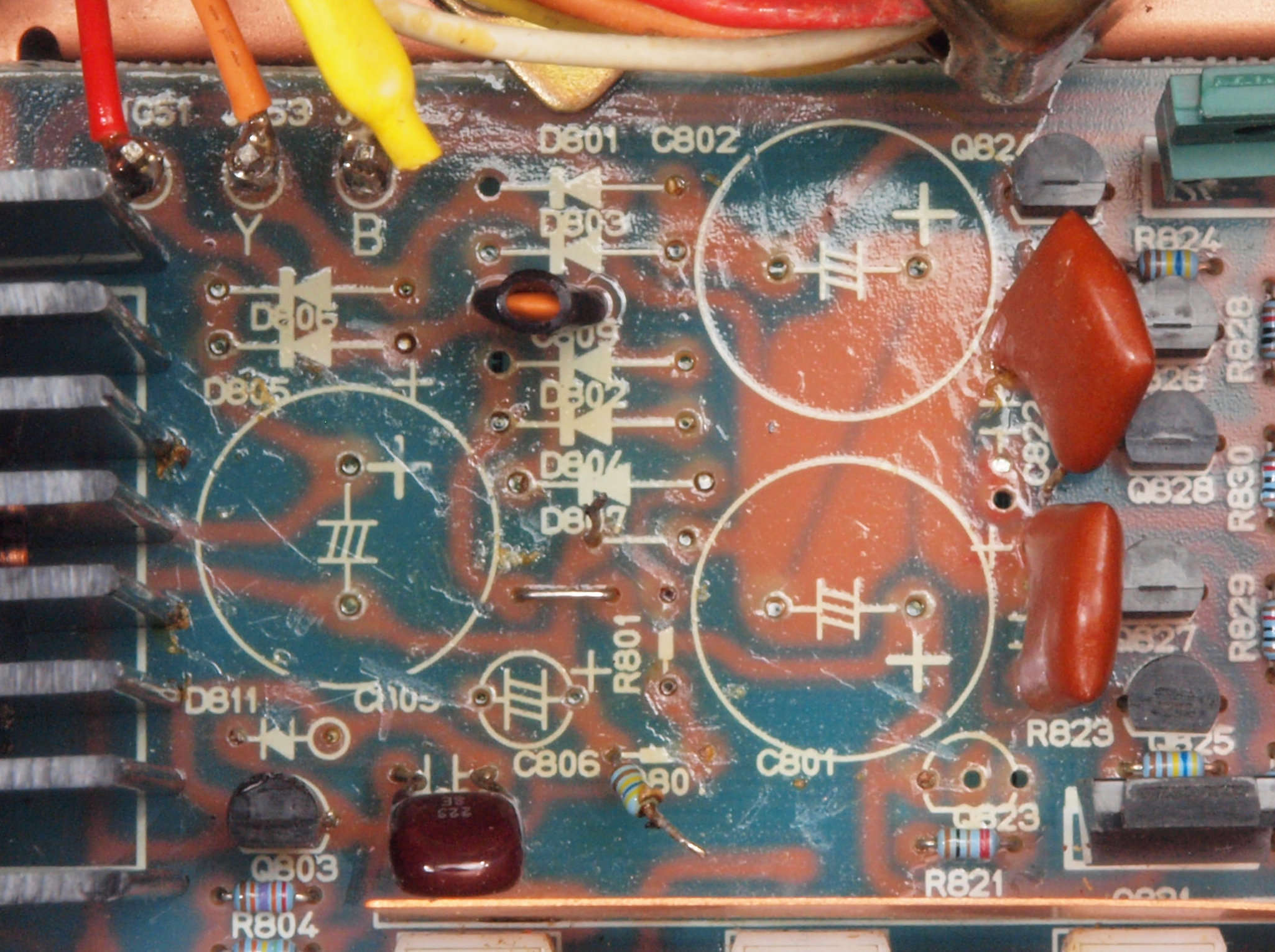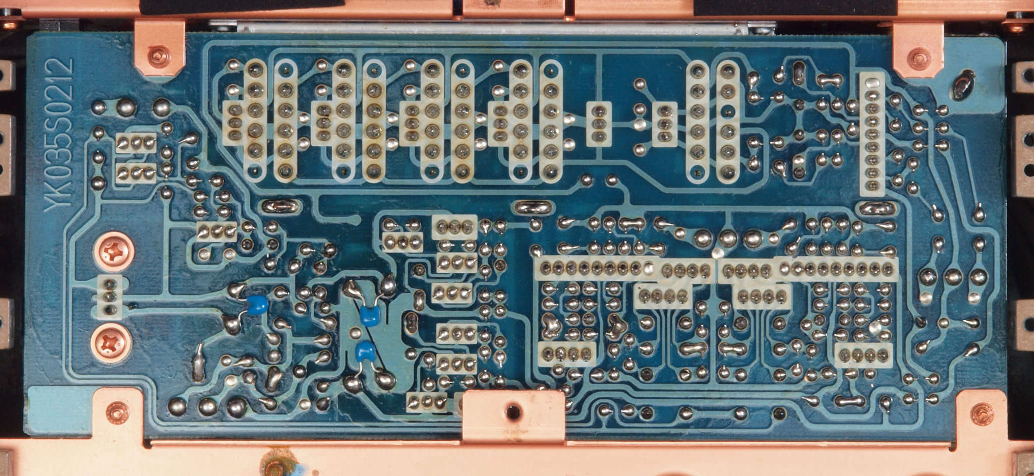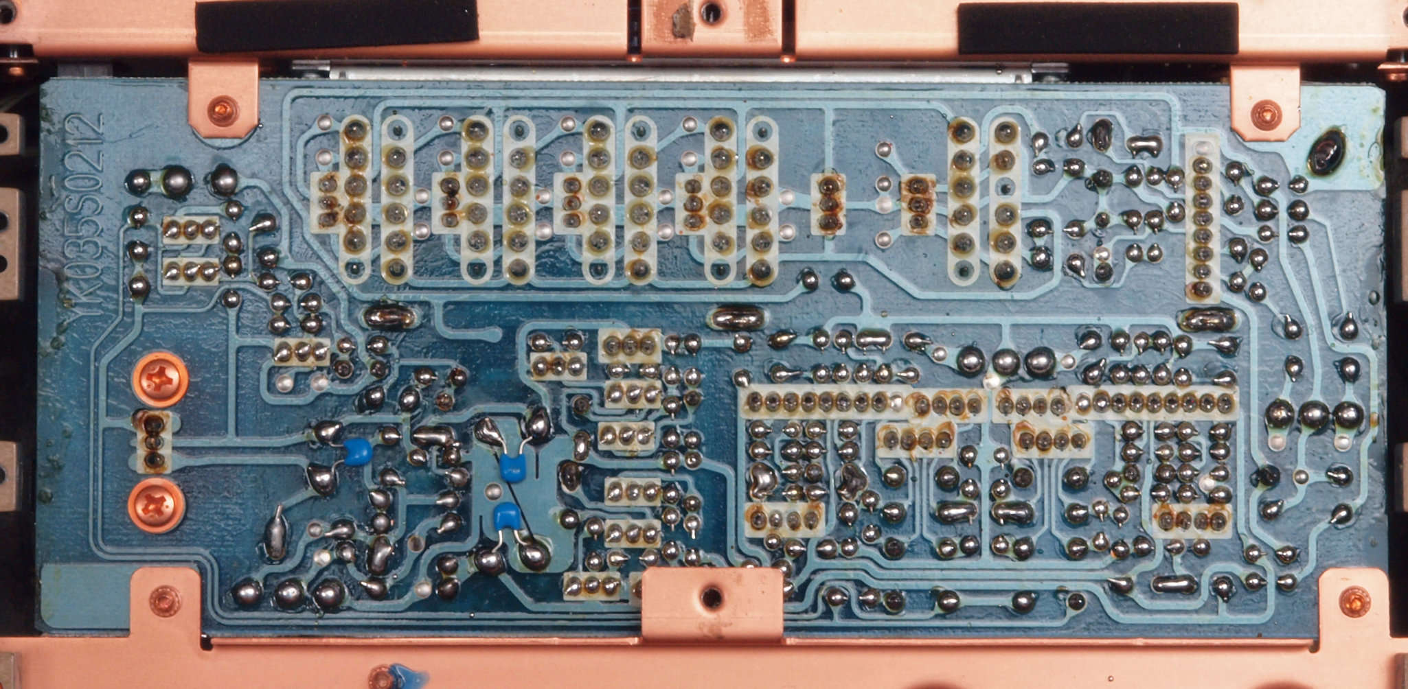 | C112. 修理中 基板。電解コンデンサー固定用の接着材、当時は溶媒にトルエンが使用されており、銅を腐食する。 | ||||||||||||||||||||||