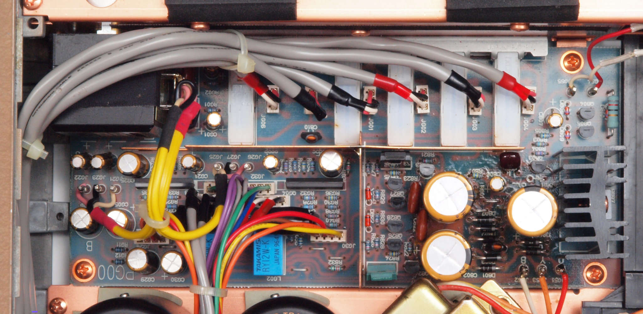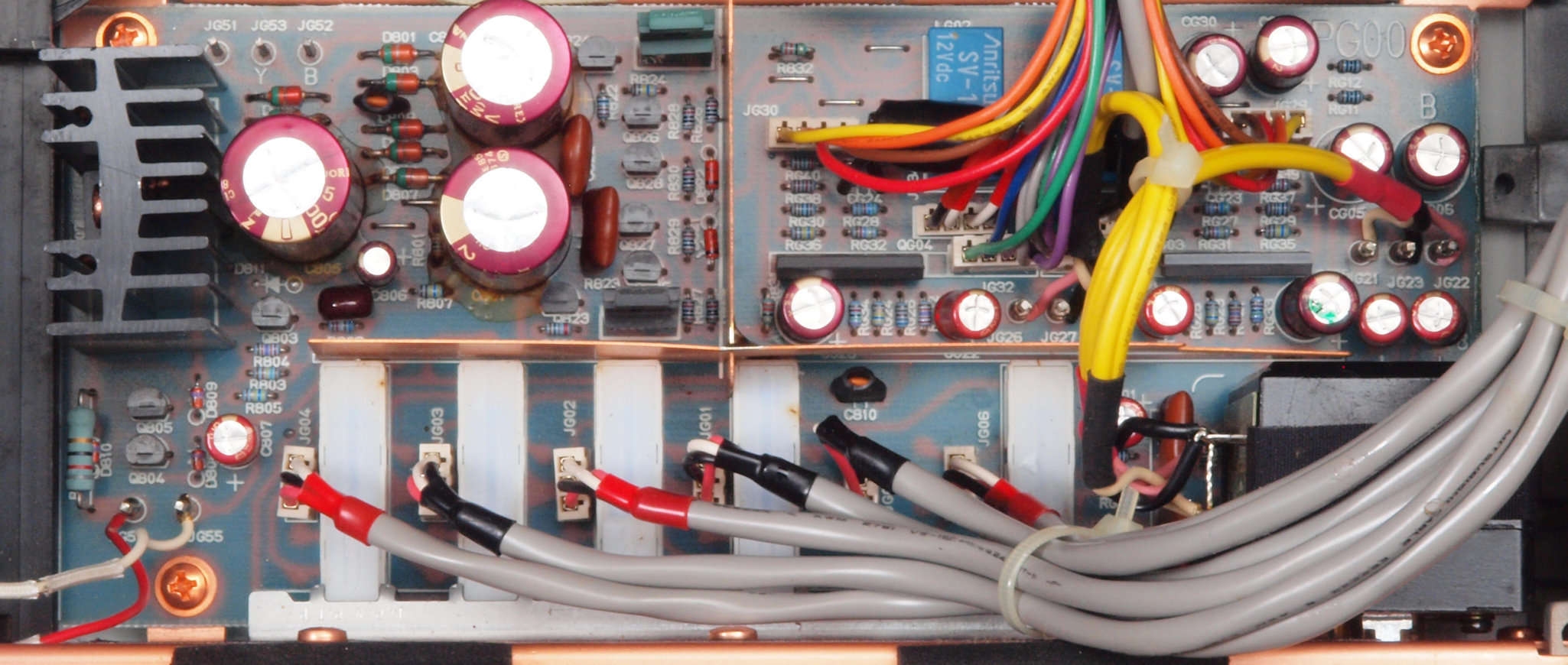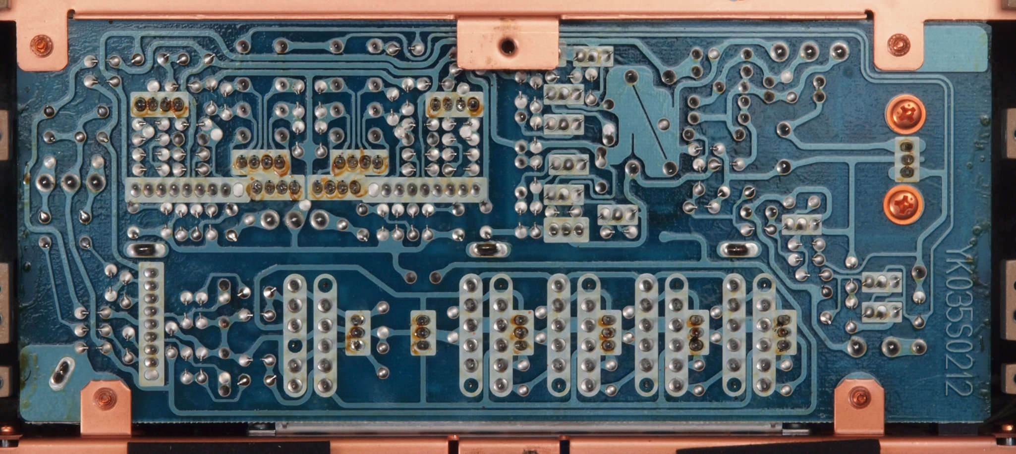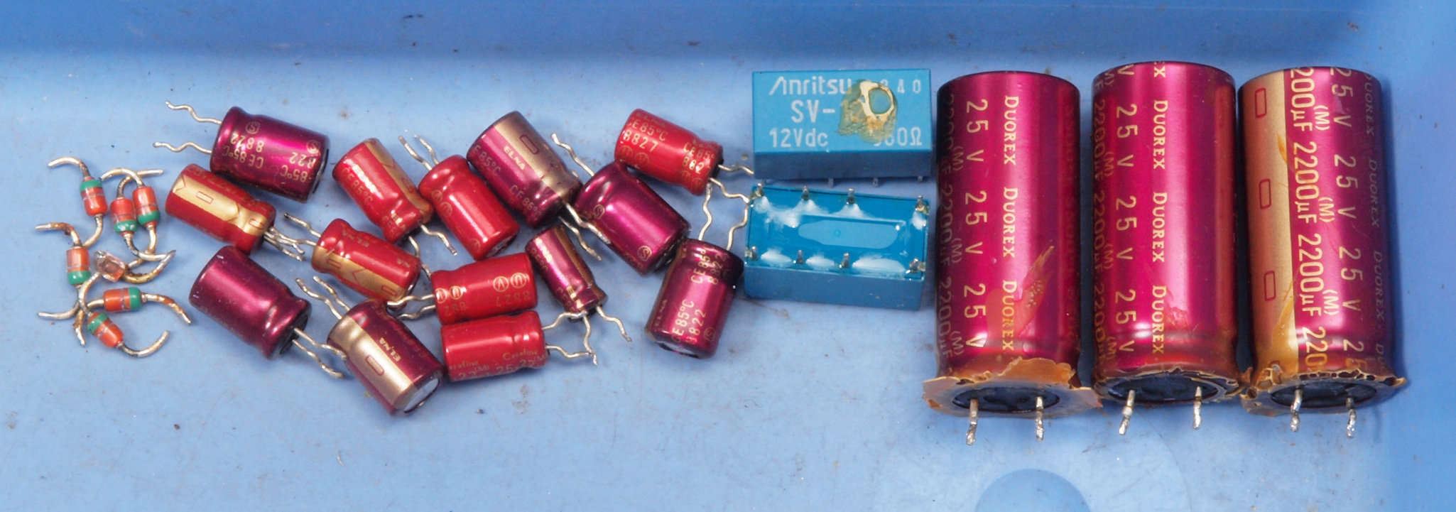 | C112. 修理中 基板。電解コンデンサー固定用の接着材、当時は溶媒にトルエンが使用されており、銅を腐食する。 | ||||||||||||||||||||||