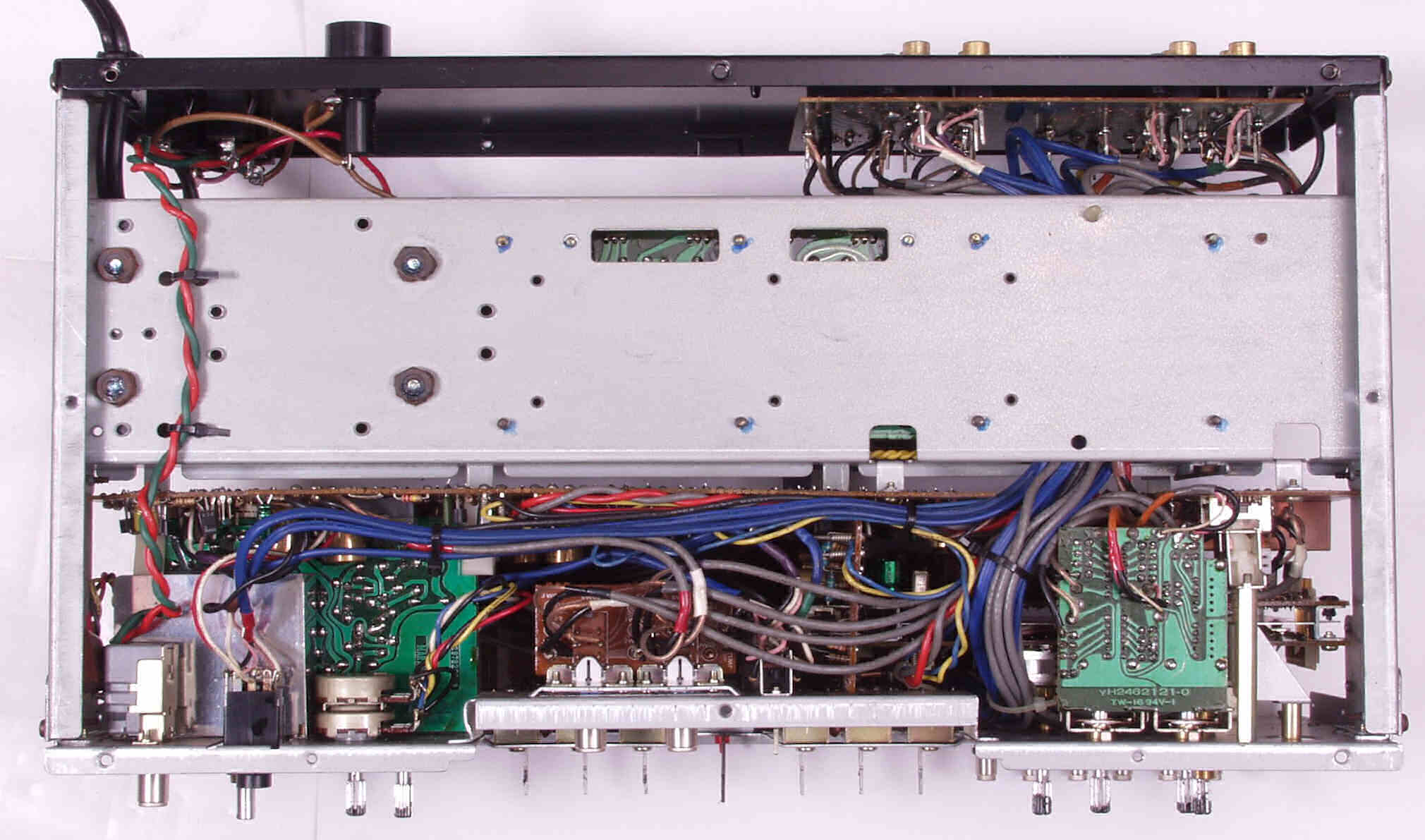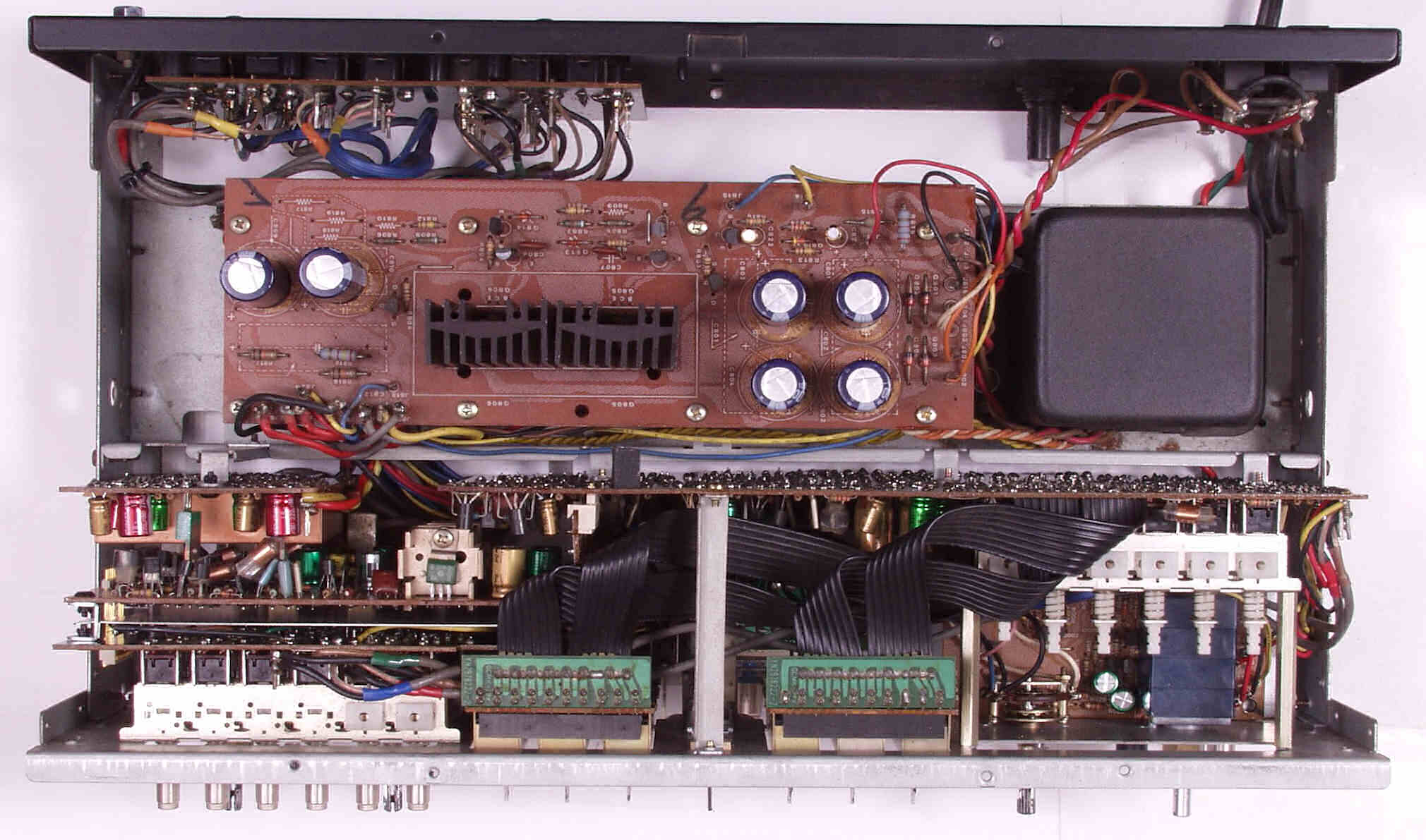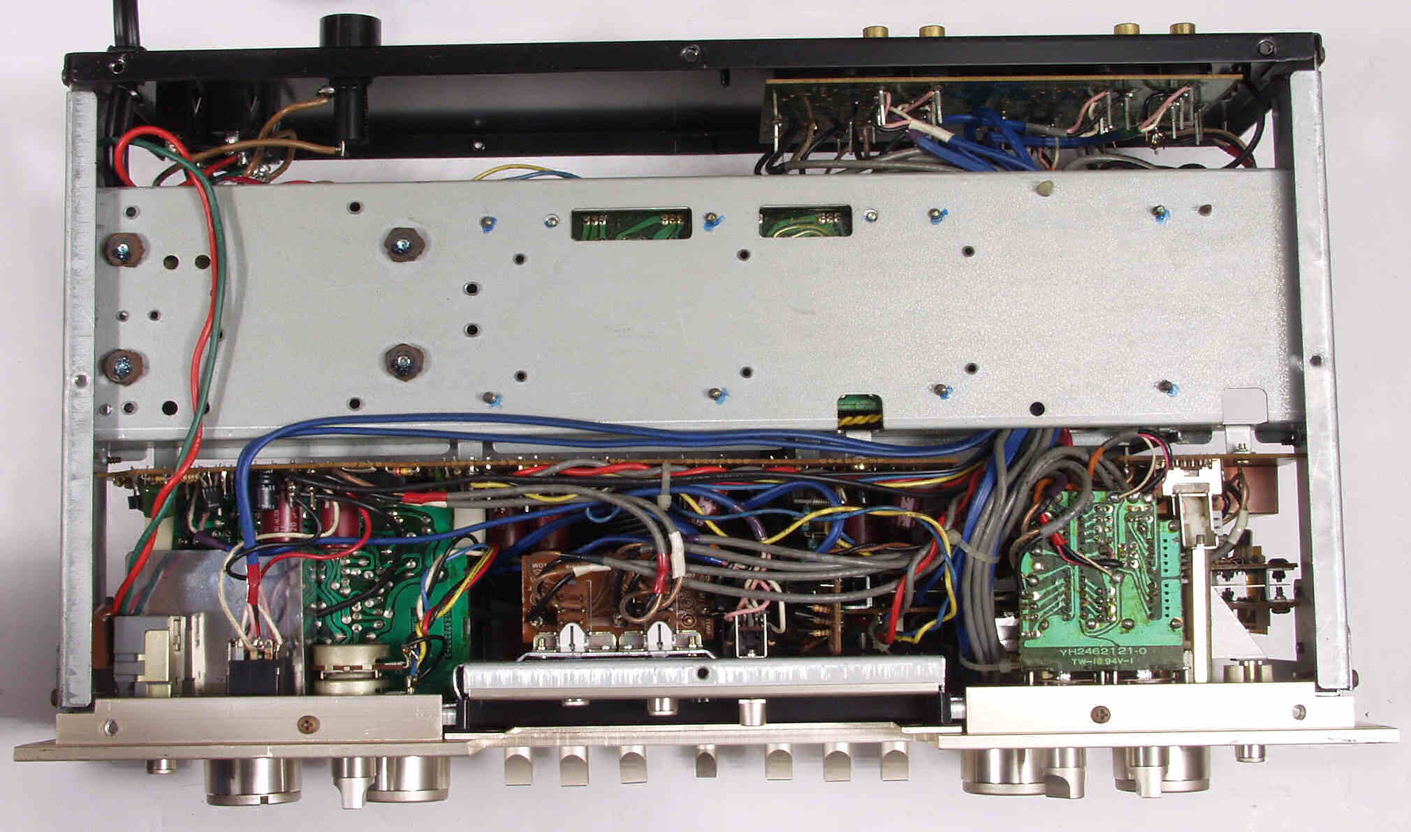 | A−4. 点検中 後シャーシを倒せる、電源は2段基板。RCA端子も補強が必要? | ||||||||||||||||||||