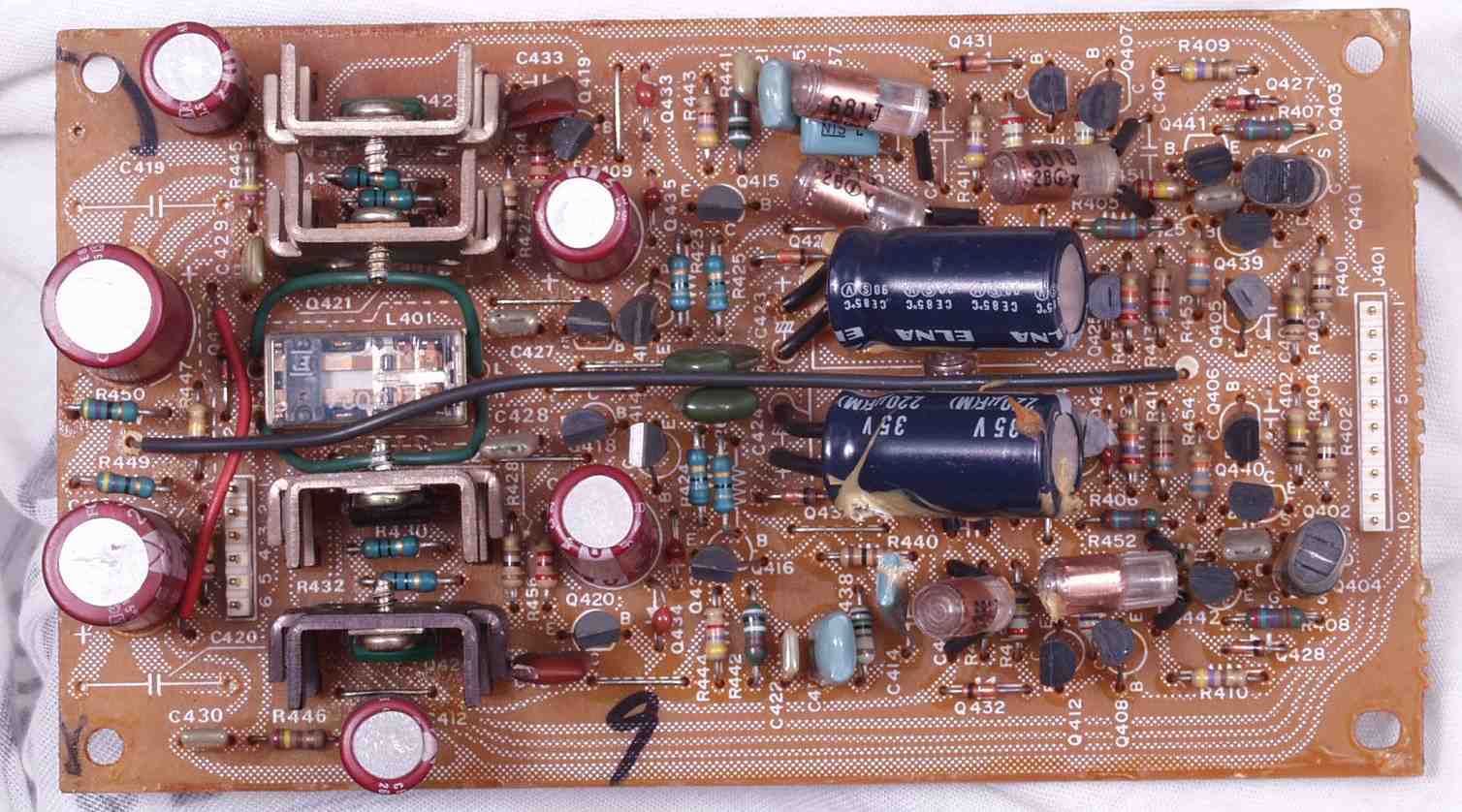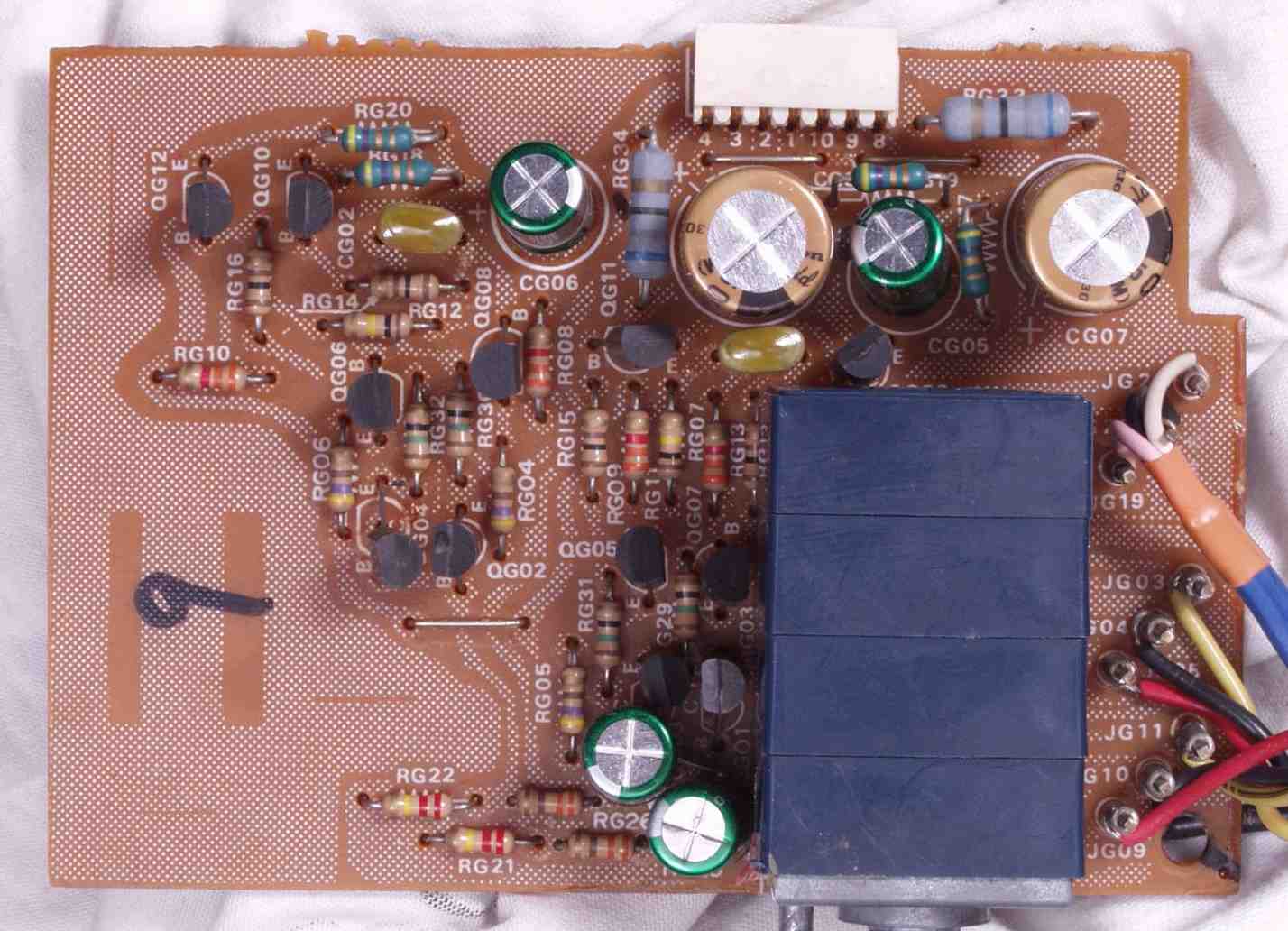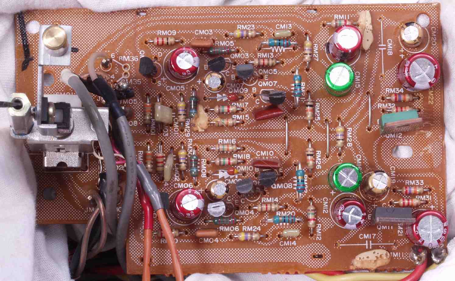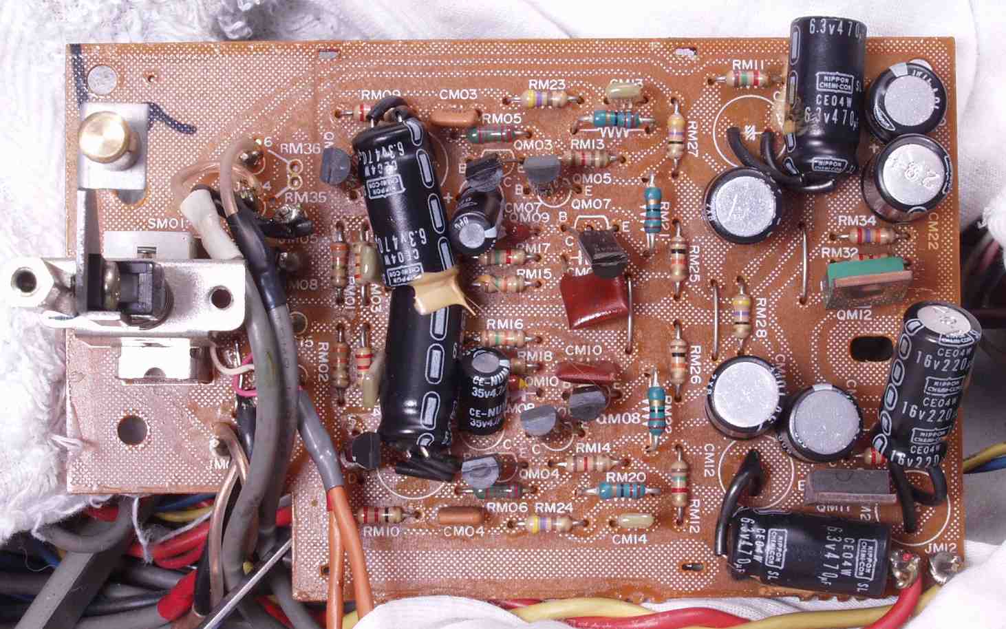 | C−7A. 修理前 MC−AMP基板 シールドケース内なので電解コンデンサーの頭のビニールの剥けが大きい | ||||||||||||||||||||