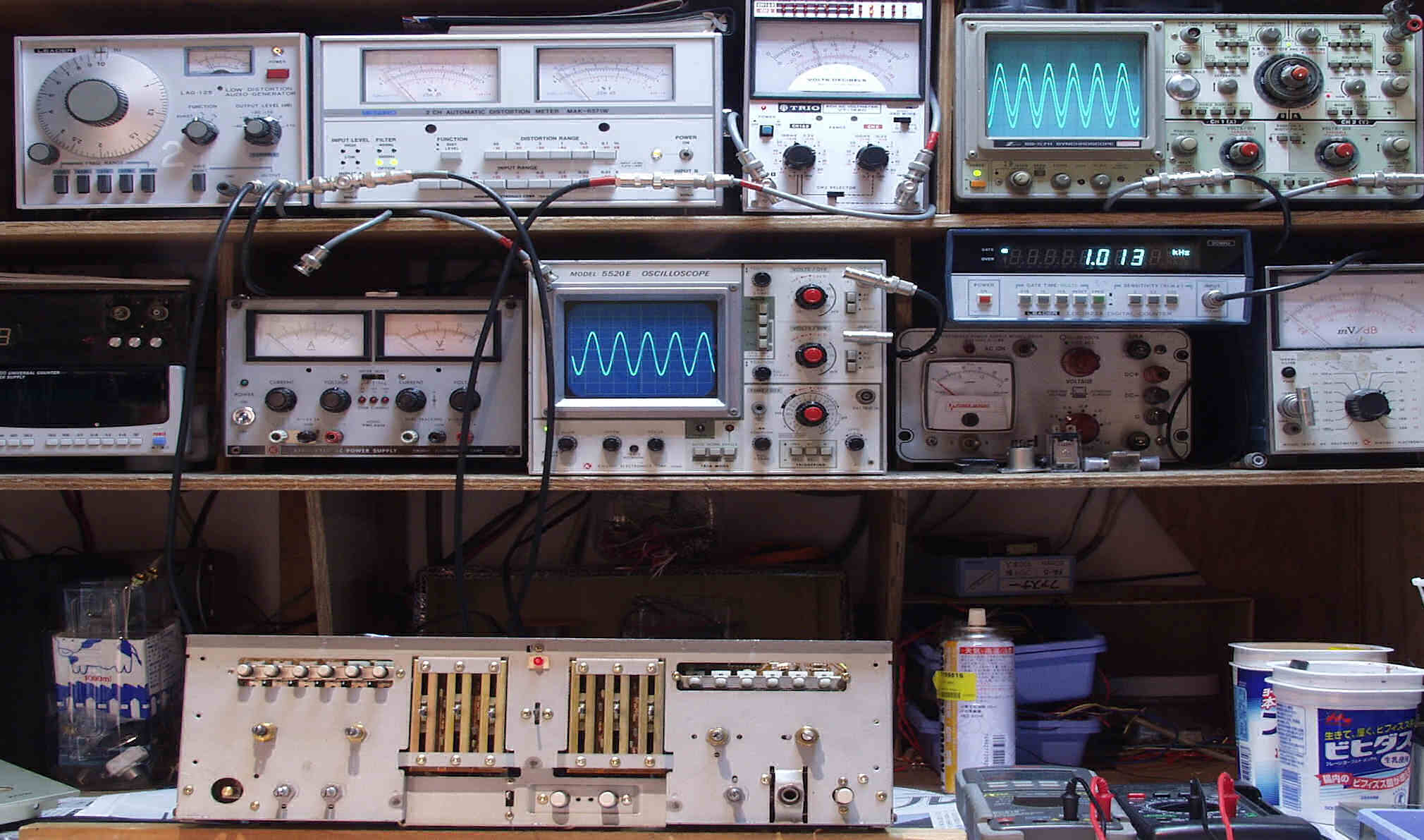 | E. 調整・測定 E−1. 出力/歪み率測定・調整 ケース(シールド)に入れていないので、実際はもう少し良い <見方> 上左オーディオ発振器より400HZ & 1KHZの信号を出す(歪み率=約0.003%)。 下中=入力波形(オーディオ発振器のTTLレベル)。 下右=周波数計。 上左=SP出力の歪み率測定。 左メータ=L出力。 右メータ=R出力。 上中=SP出力電圧測定器。 赤針=R出力。 黒針=L出力。 上右=SP出力波形オシロ。 上=R出力。 下=L出力(出力電圧測定器の出力)。 |