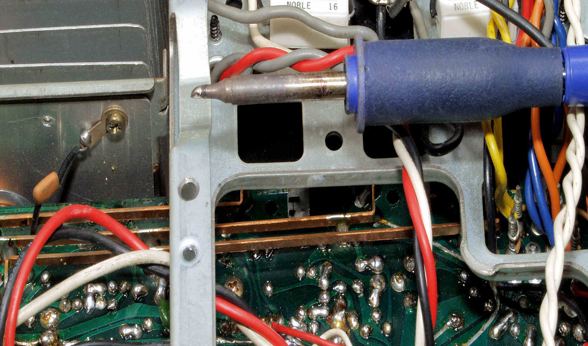 | C18. 修理(半田補正)中 終段基板裏、最近の半田コテはすごく優秀で、小型でも70Wと容量が大きいので、銅バー(板)も十分半田出来る。 | ||||||||||||||||||||||||||||||||||