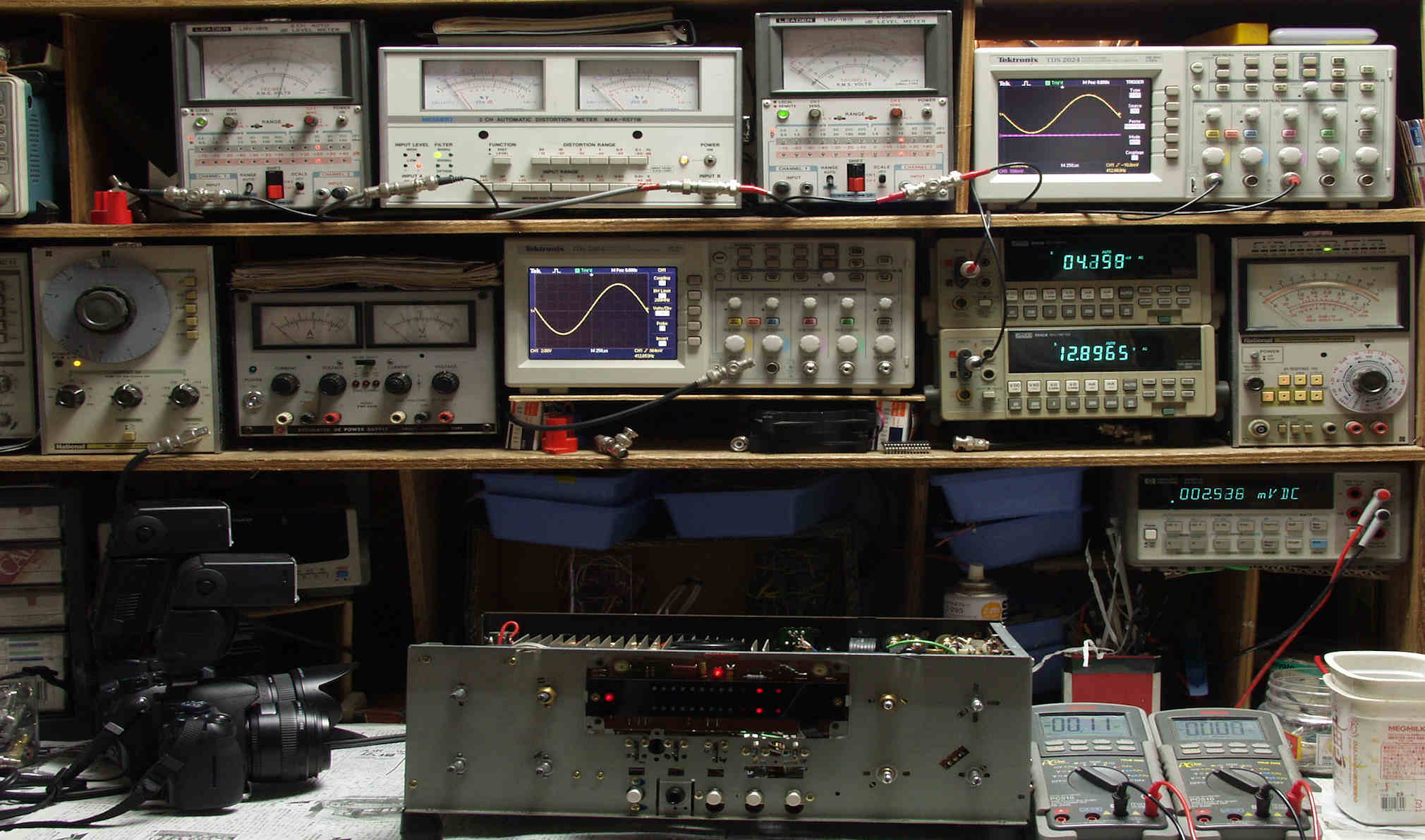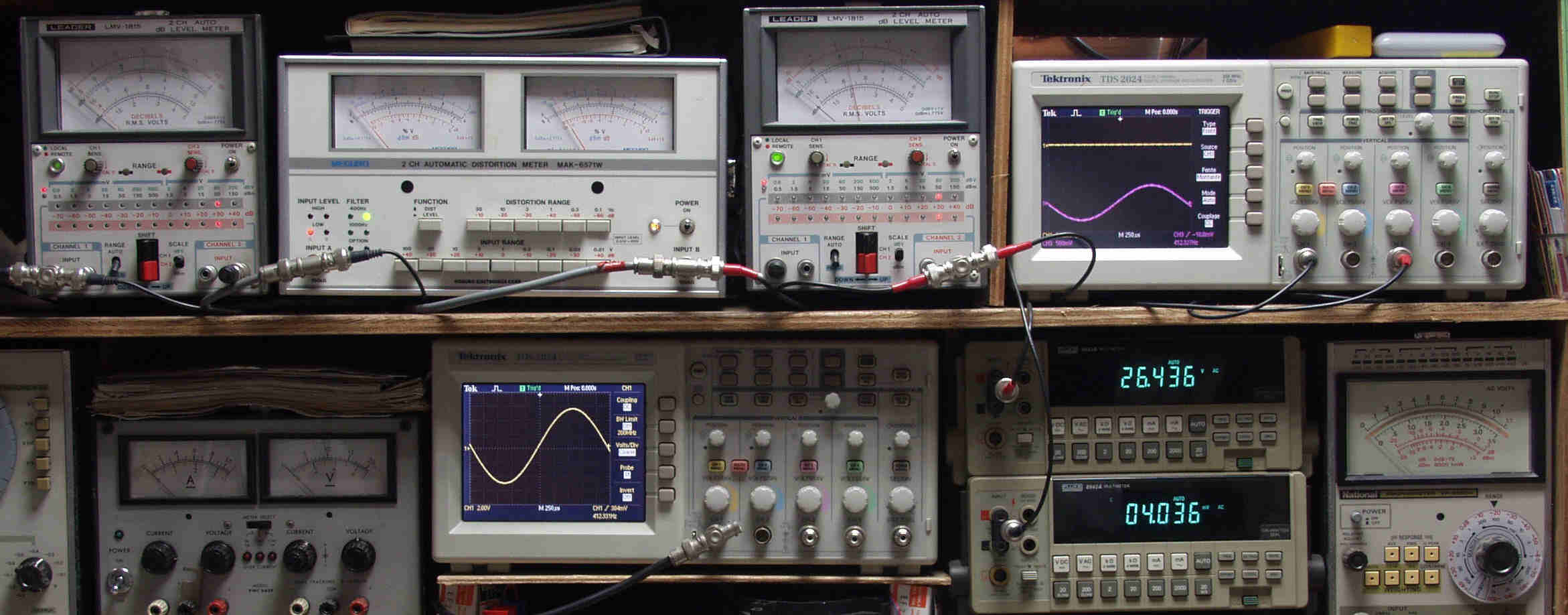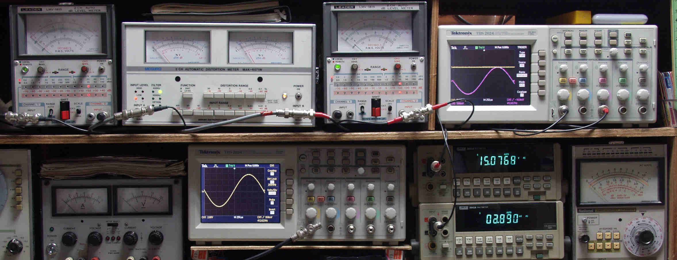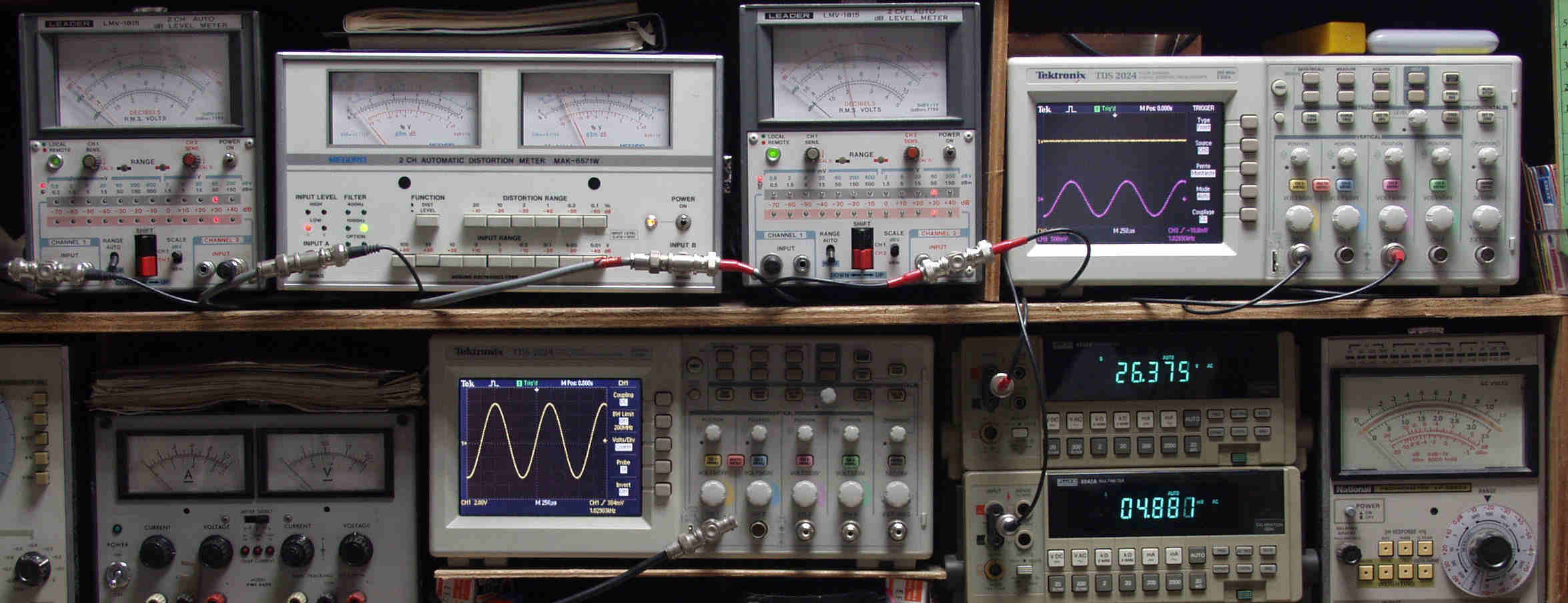 | E. 調整・測定 E1. 出力・歪み率測定。 <見方>。 下段左端 オーディオ発振器より400HZ・1KHZの信号を出し(歪み率=約0.003%)これをAMPに入力し、出力を測定。 下段中央 オシロ=入力波形(オーディオ発振器のTTLレベル表示)。 上段左端 交流電圧計=L側出力電圧測定、黒針のみ使用。 上段中左 歪み率計=出力の歪み率測定 左メータ=L出力、右メータ=R出力。 上段中右 交流電圧計=R側出力電圧測定、赤針のみ使用。 上段右端 オシロ=出力波形表示、 赤表示=R出力、黄色表示=L出力。(実際にはRL交流電圧計の出力「Max1V」を観測)。 下段中右上 デジタル電圧計=R出力電圧測定。 下段中右下 デジタル電圧計=L出力電圧測定。 |