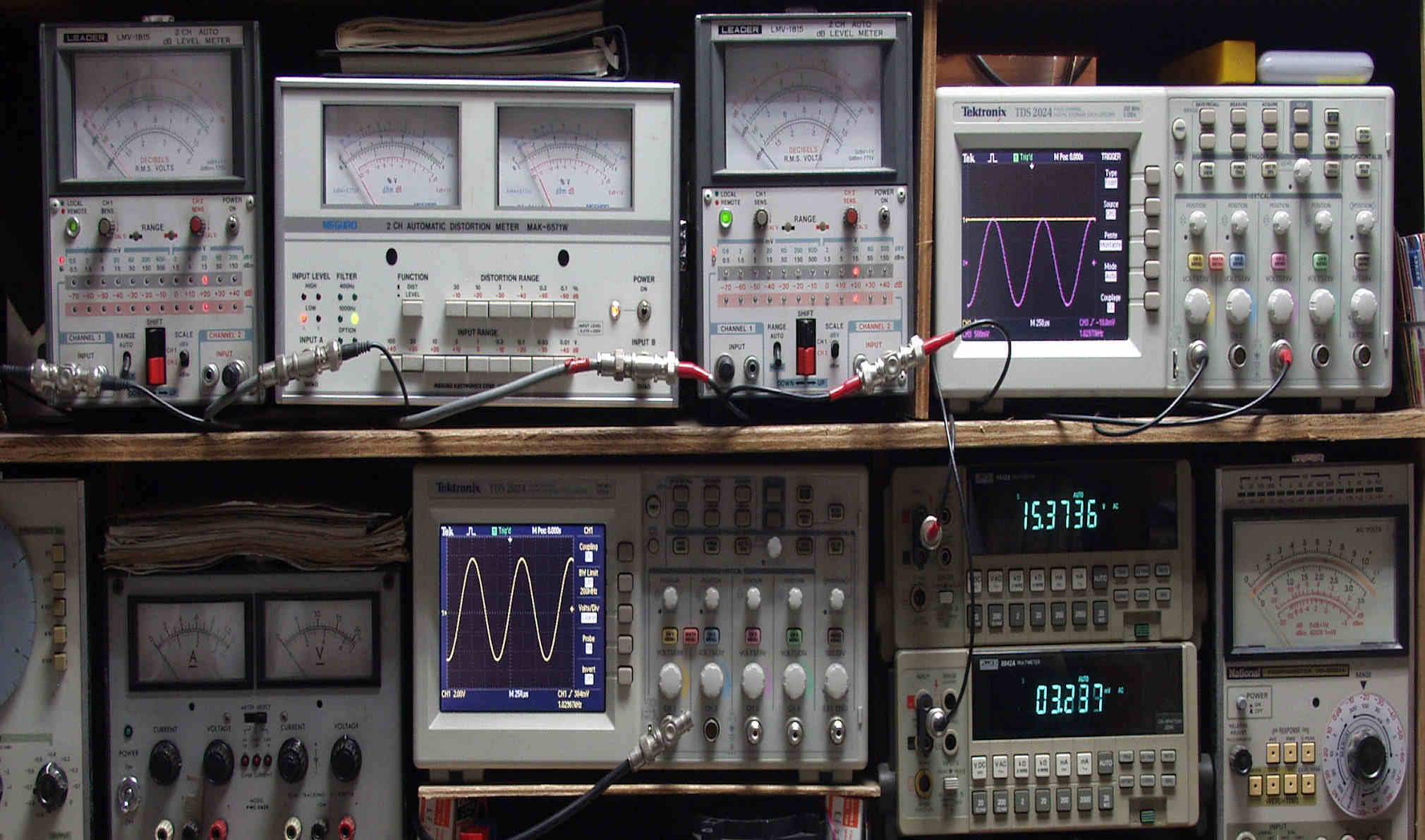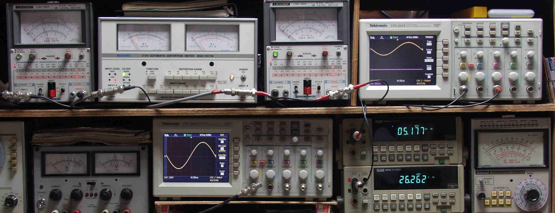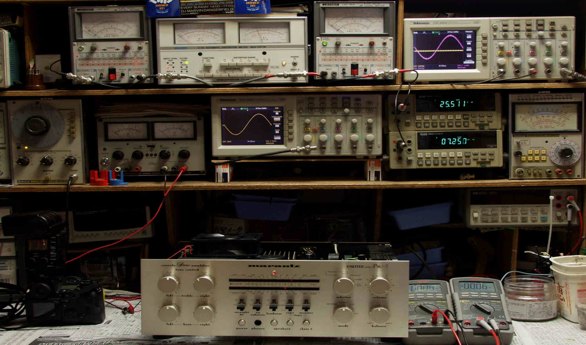 | H. バラック修理での測定 H1. 出力・歪み率測定。 <見方>。 下段左端 オーディオ発振器より400HZ・1KHZの信号を出し(歪み率=約0.003%)これをAMPに入力し、出力を測定。 下段中央 オシロ=入力波形(オーディオ発振器のTTLレベル表示)。 上段左端 交流電圧計=L側出力電圧測定、黒針のみ使用。 上段中左 歪み率計=出力の歪み率測定 左メータ=L出力、右メータ=R出力。 上段中右 交流電圧計=R側出力電圧測定、赤針のみ使用。 上段右端 オシロ=出力波形表示、 赤表示=R出力、黄色表示=L出力。(実際にはRL交流電圧計の出力「Max1V」を観測)。 下段中右上 デジタル電圧計=R出力電圧測定。 下段中右下 デジタル電圧計=L出力電圧測定。 |