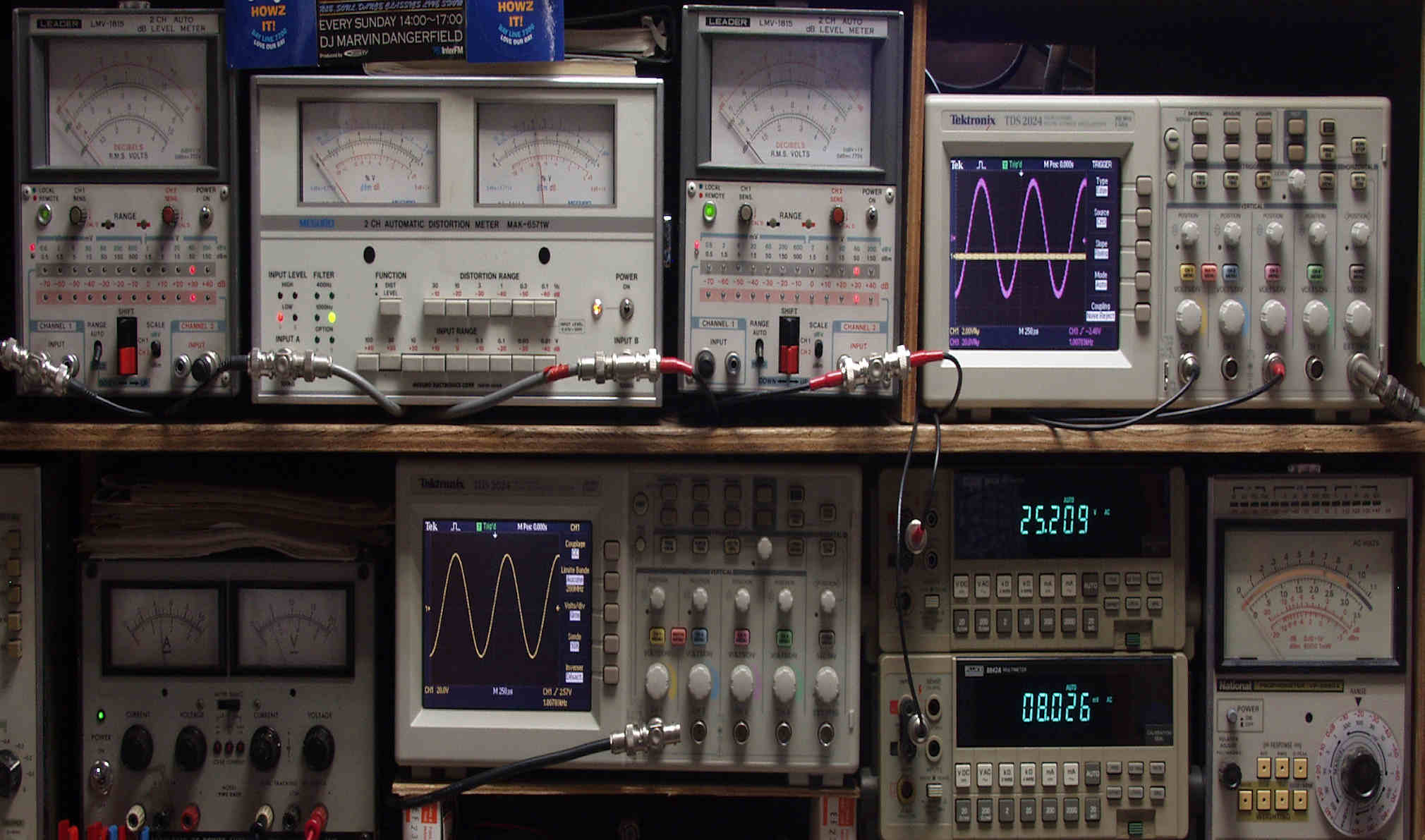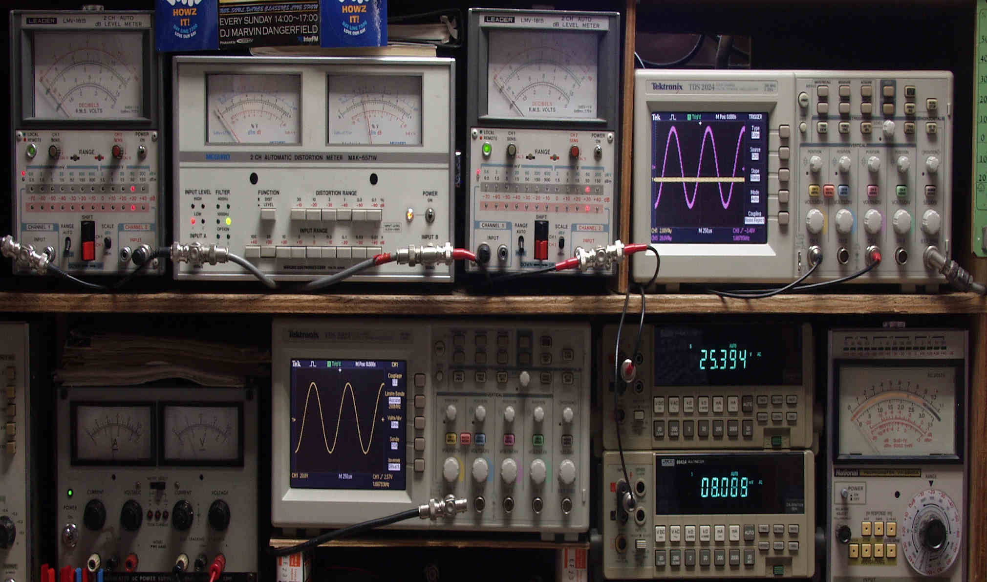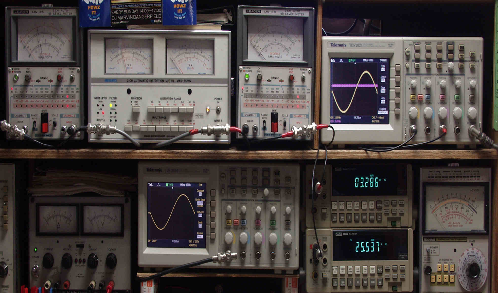 | H. バラック修理での測定 H1. 出力・歪み率測定。 <見方>。 下段左端 オーディオ発振器より400HZ・1KHZの信号を出し(歪み率=約0.003%)これをAMPに入力し、出力を測定。 下段中央 オシロ=入力波形(オーディオ発振器のTTLレベル表示)。 上段左端 交流電圧計=L側出力電圧測定、黒針のみ使用。 上段中左 歪み率計=出力の歪み率測定 左メータ=L出力、右メータ=R出力。 上段中右 交流電圧計=R側出力電圧測定、赤針のみ使用。 上段右端 オシロ=出力波形表示、 赤表示=R出力、黄色表示=L出力。(実際にはRL交流電圧計の出力「Max1V」を観測)。 下段中右上 デジタル電圧計=R出力電圧測定。 下段中右下 デジタル電圧計=L出力電圧測定。 |