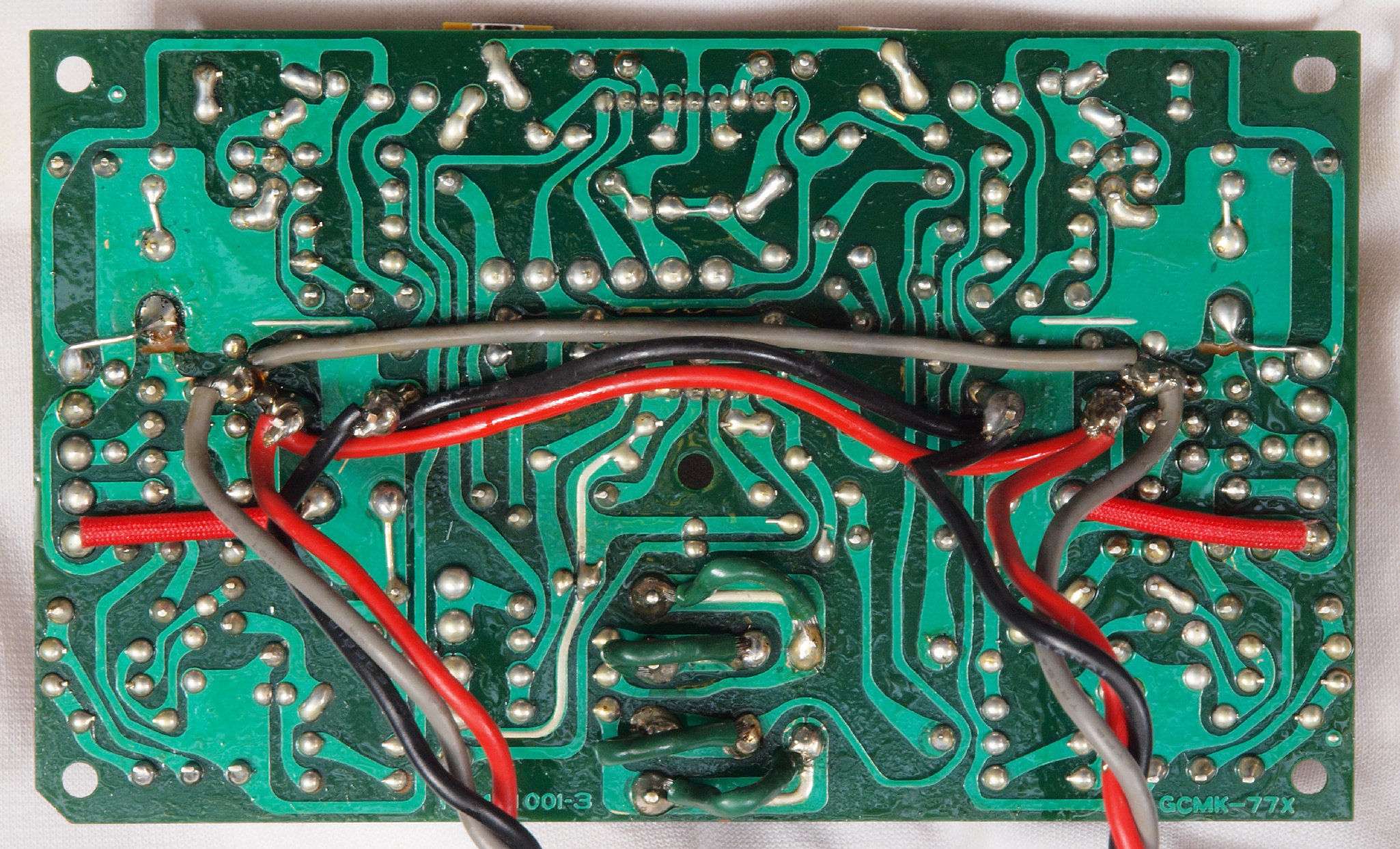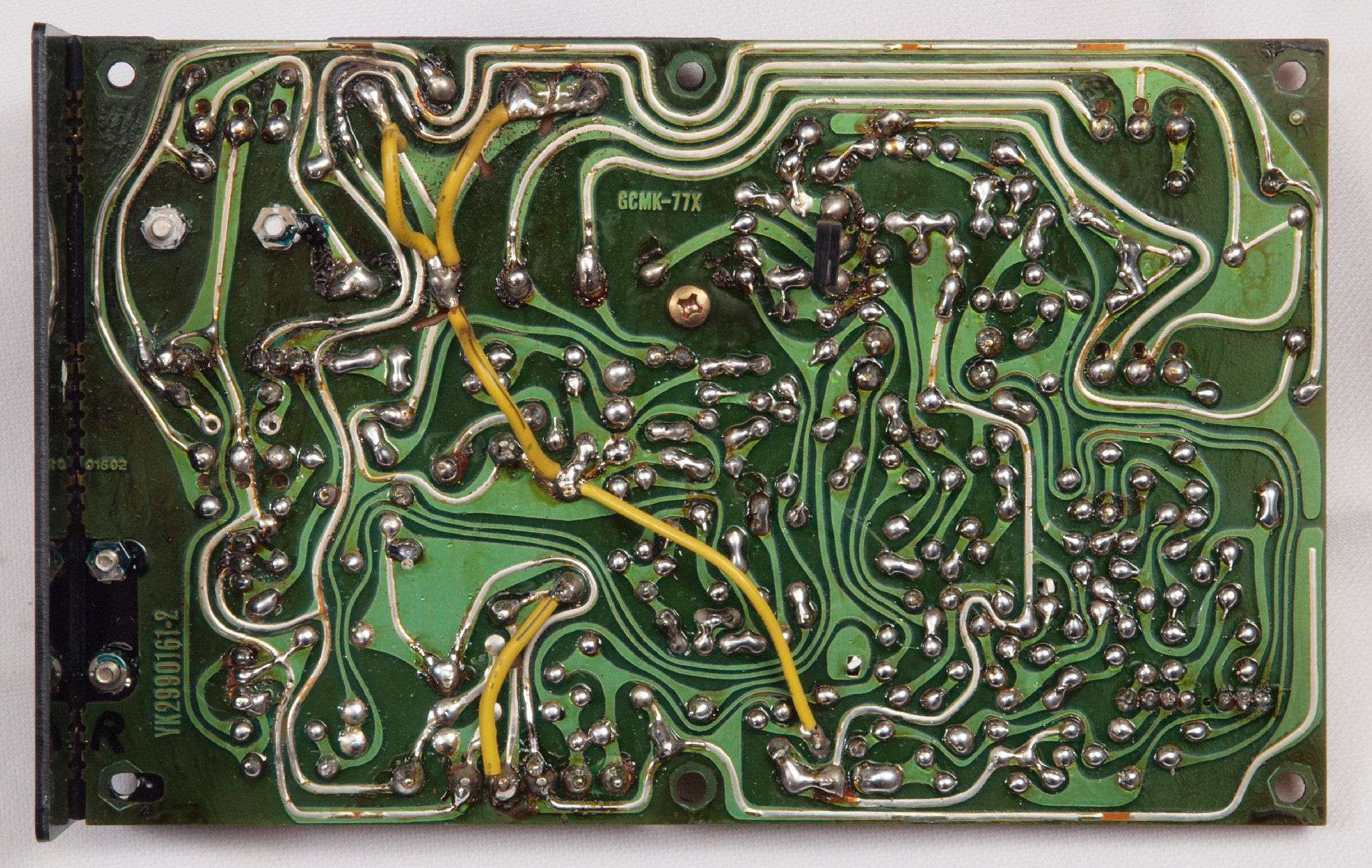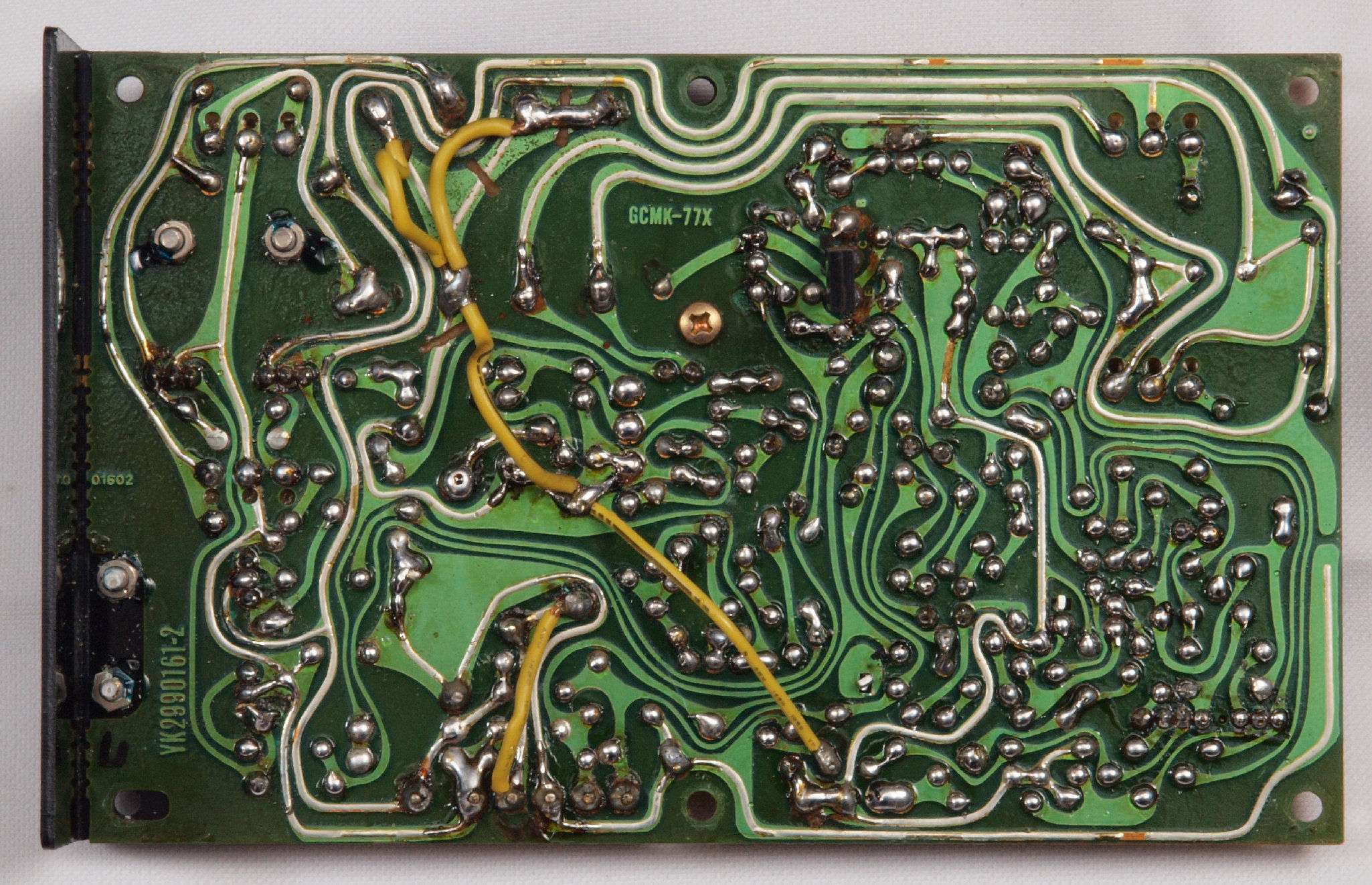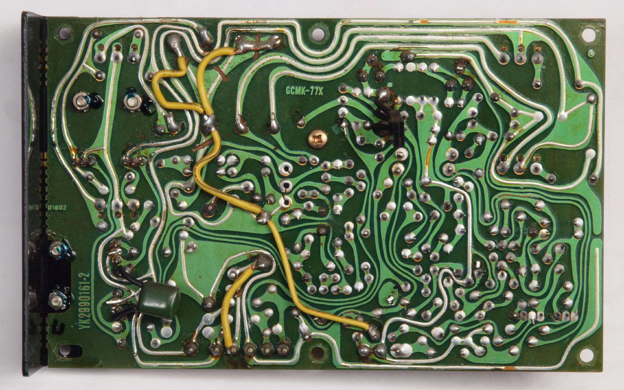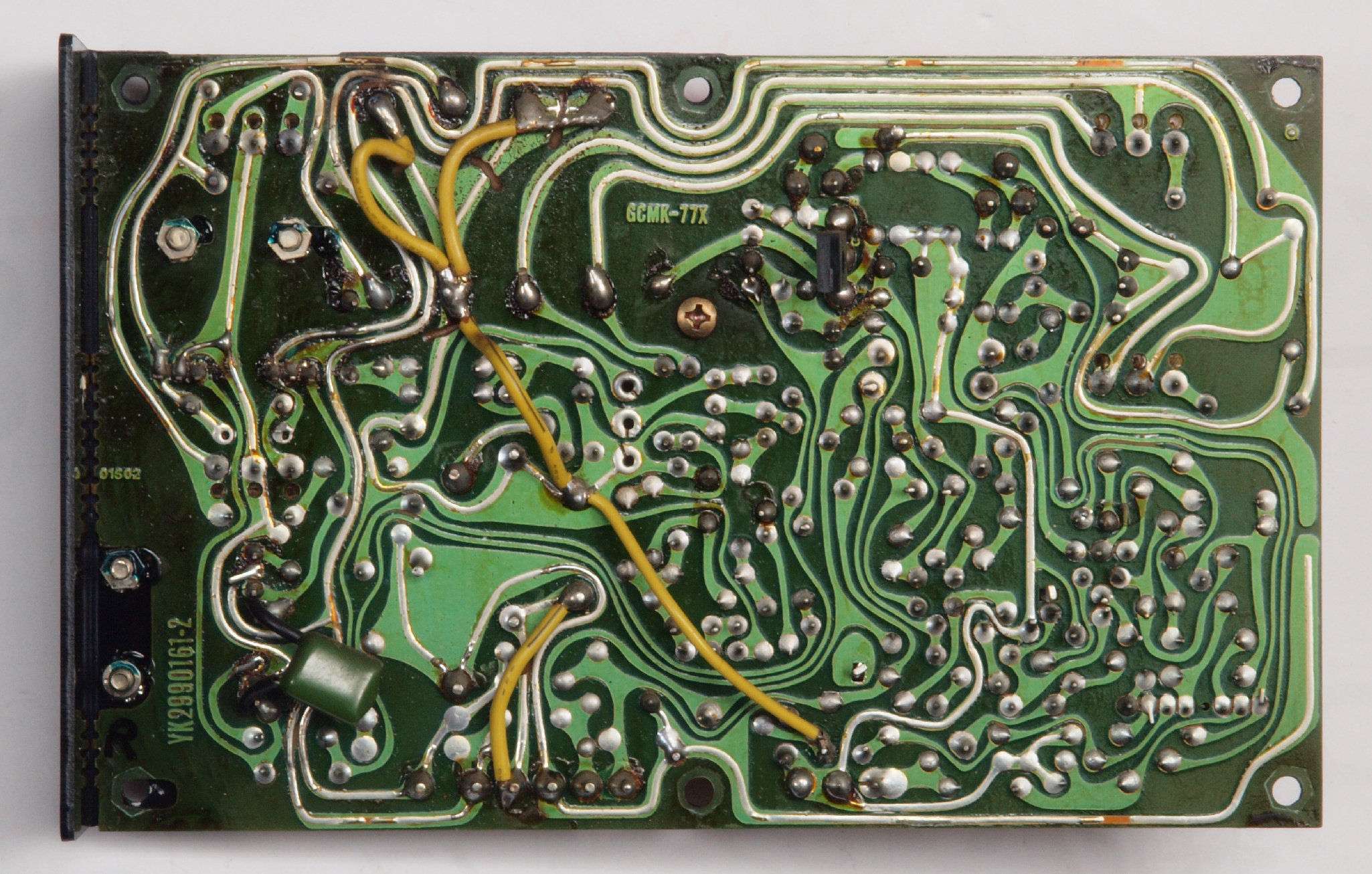 | C432. 修理前 L側終段基板裏。終段TR(トランジスター)が短絡したので、短絡電流で焼き切れた銅箔。 | ||||||||||||||||||||||||