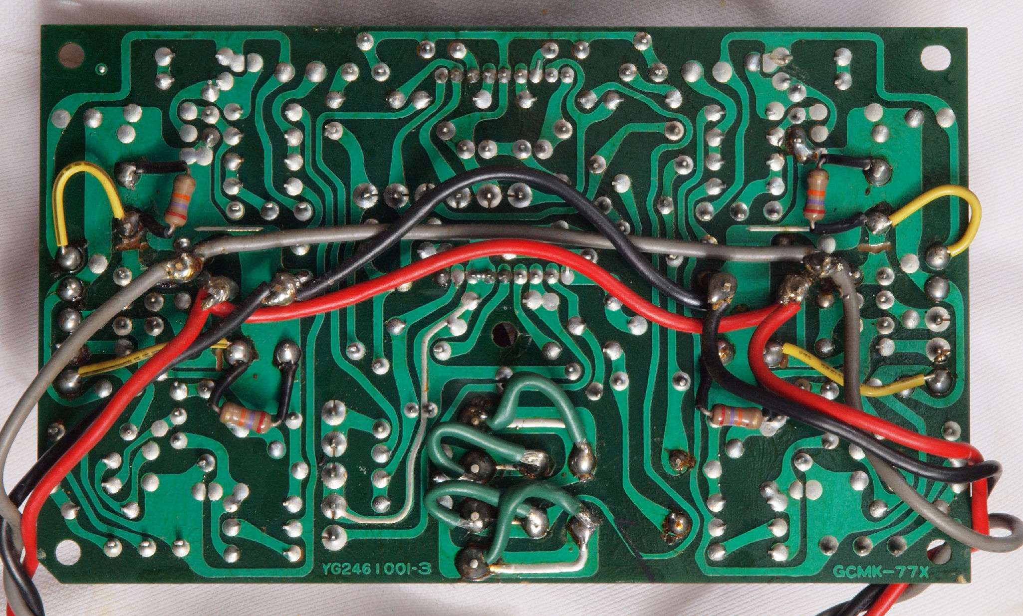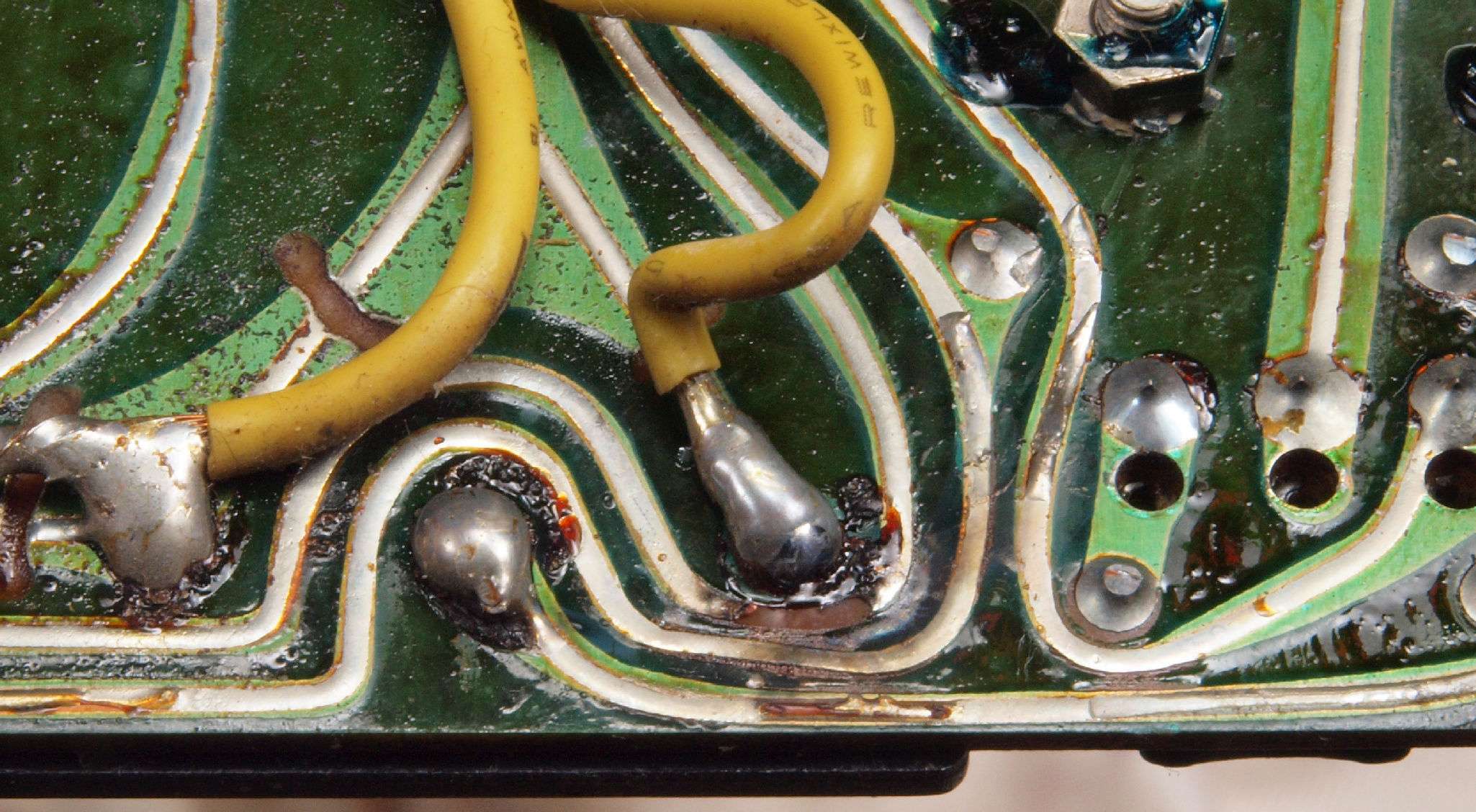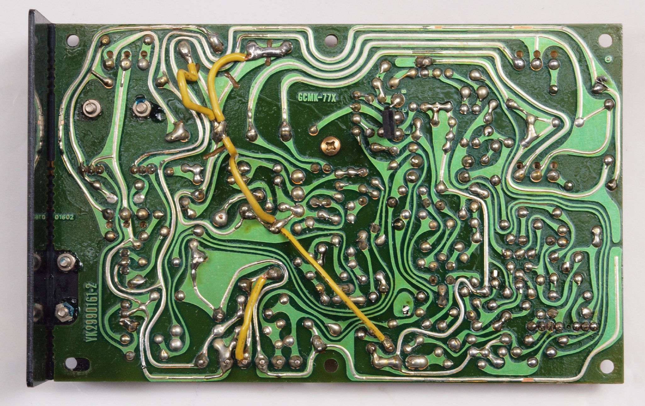 | C512. 修理中 定電圧・プロテクト基板。電解コンデンサー固定用の接着材、当時は溶媒にトルエンが使用されており、銅を腐食する。 | ||||||||||||||||||||||||