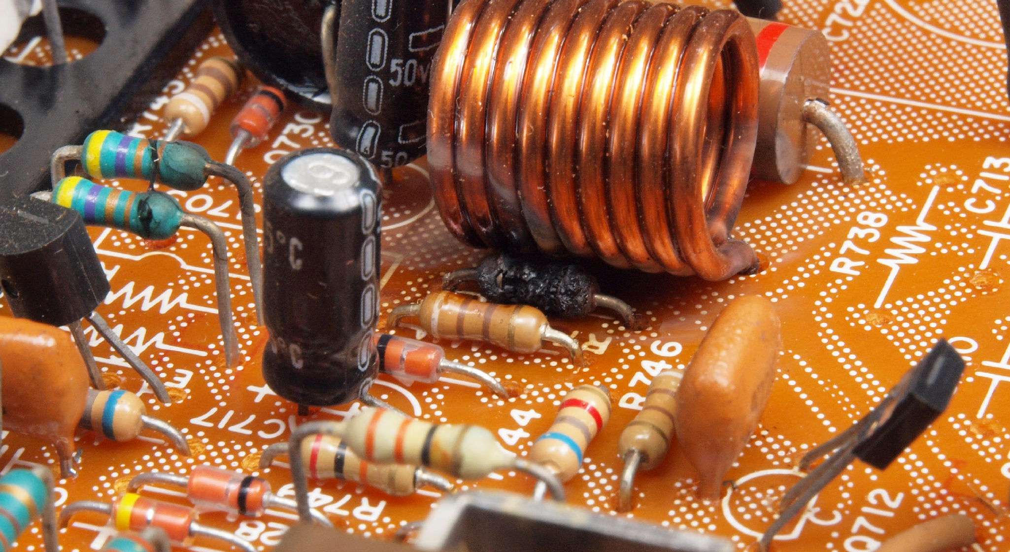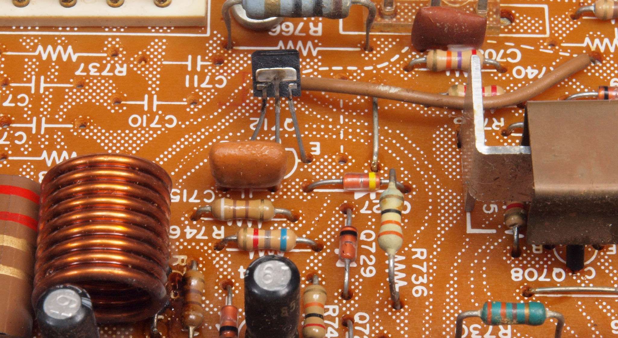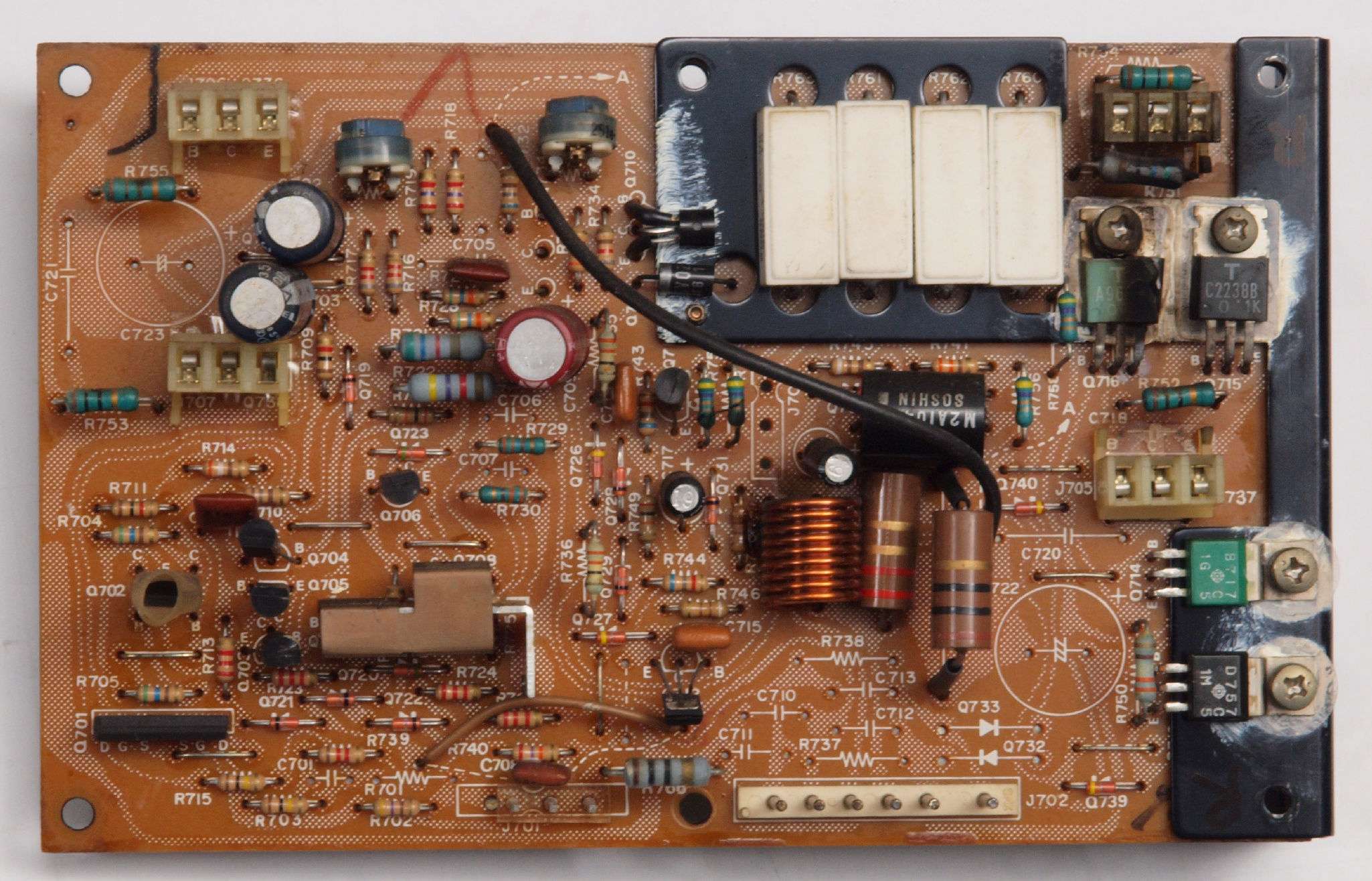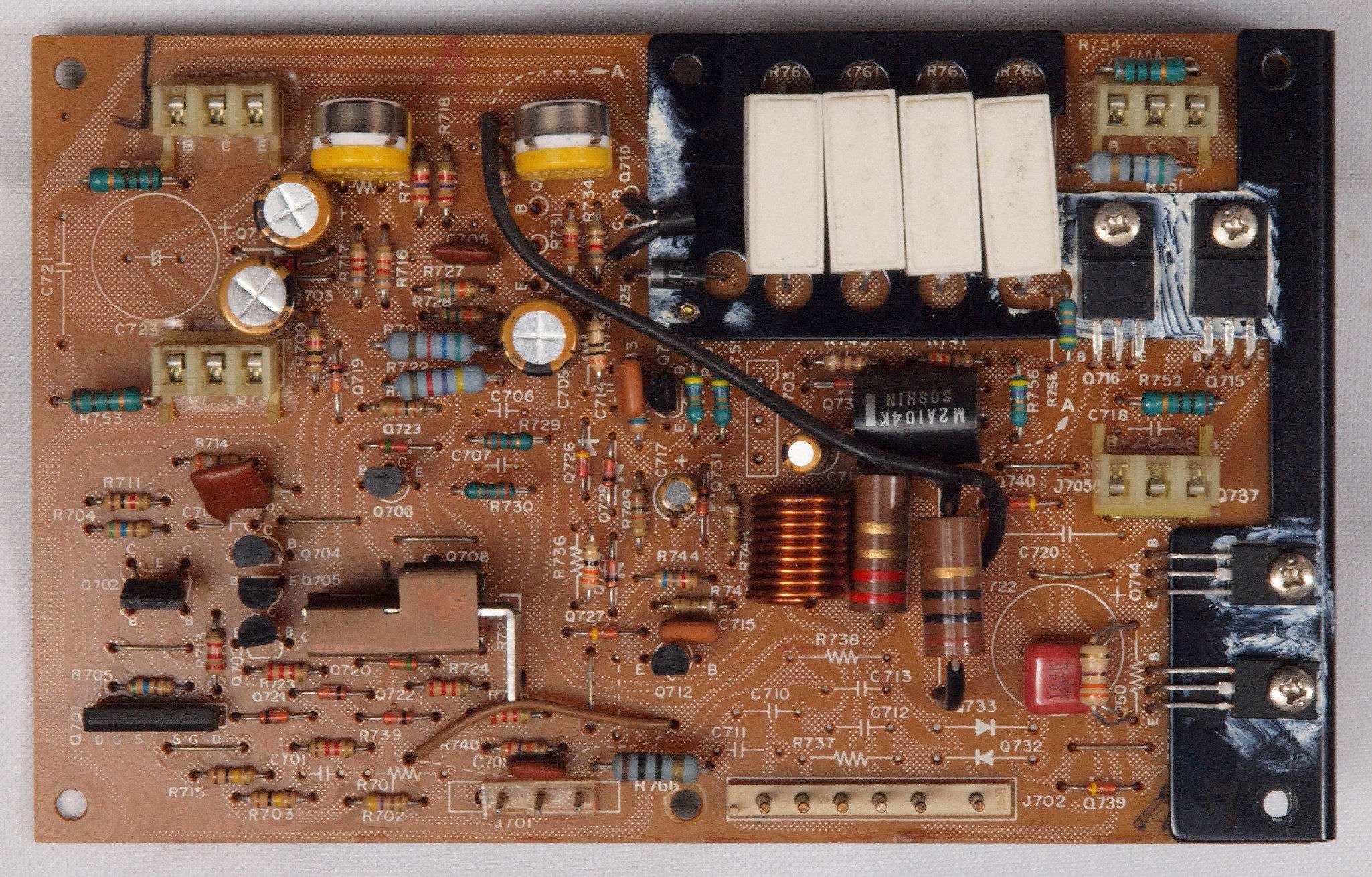 | C512. 修理中 定電圧・プロテクト基板。電解コンデンサー固定用の接着材、当時は溶媒にトルエンが使用されており、銅を腐食する。 | ||||||||||||||||||||||||