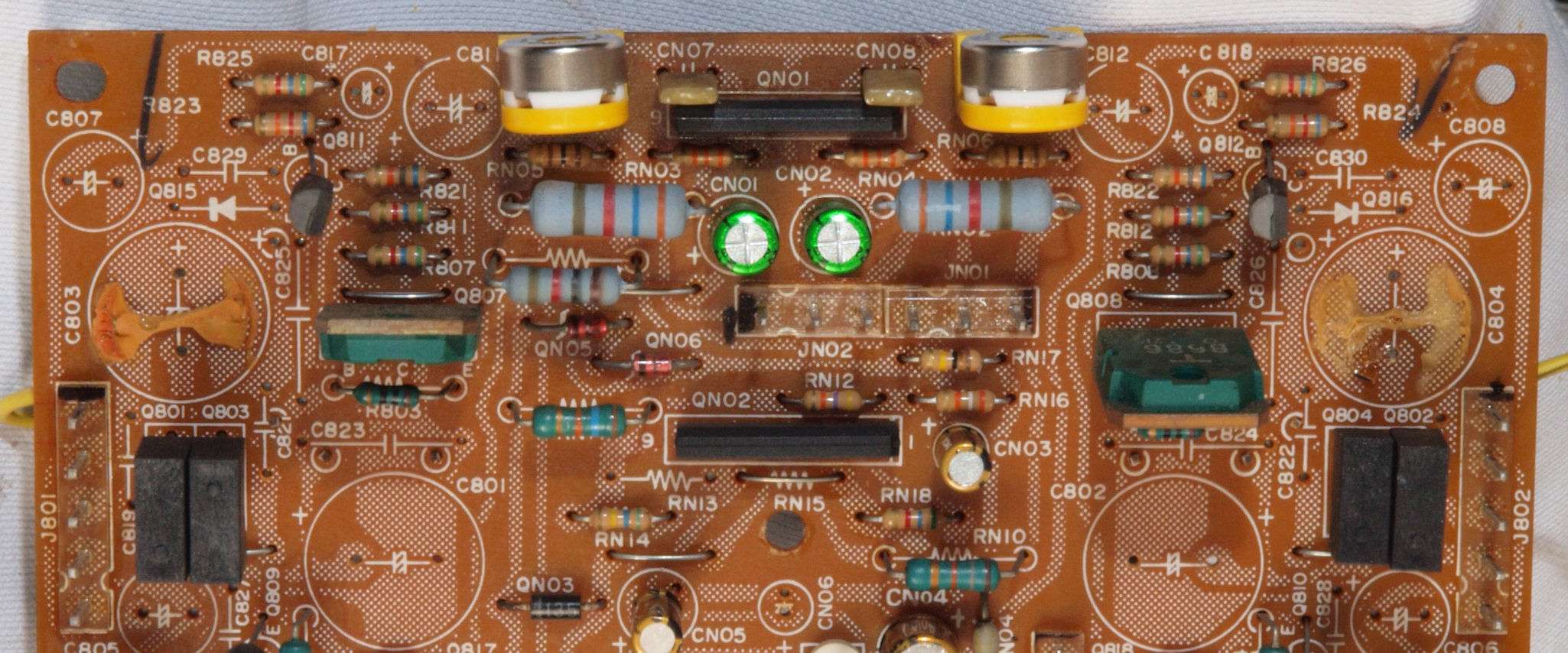 | C214. 修理中 R側終段基板。 焼損した抵抗。 | ||||||||||||||||||||||||