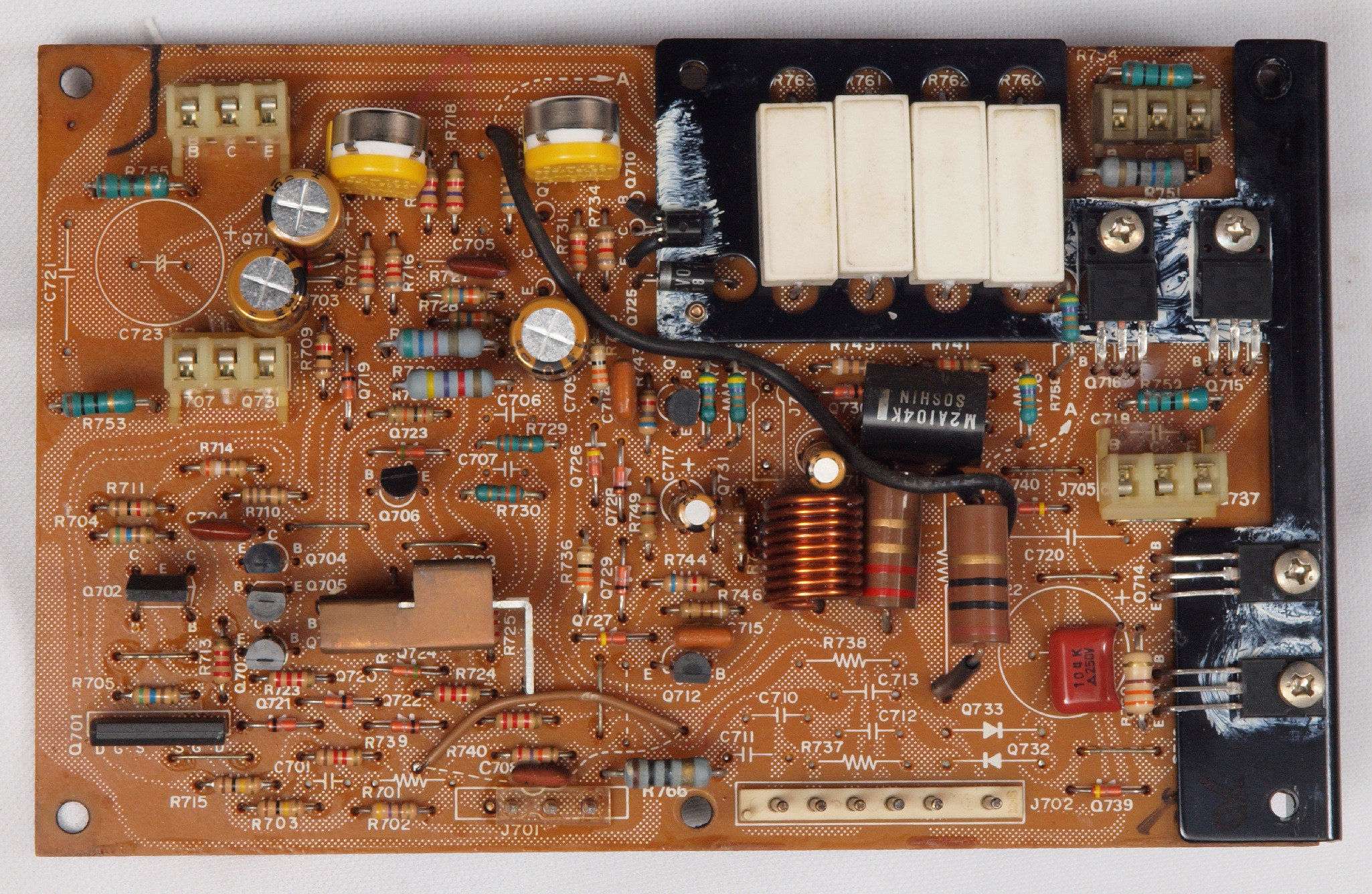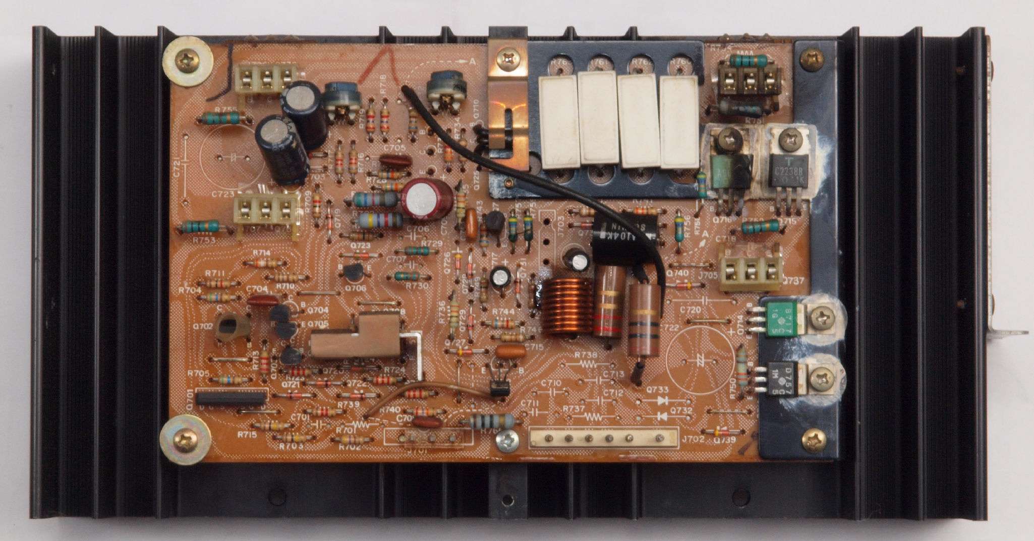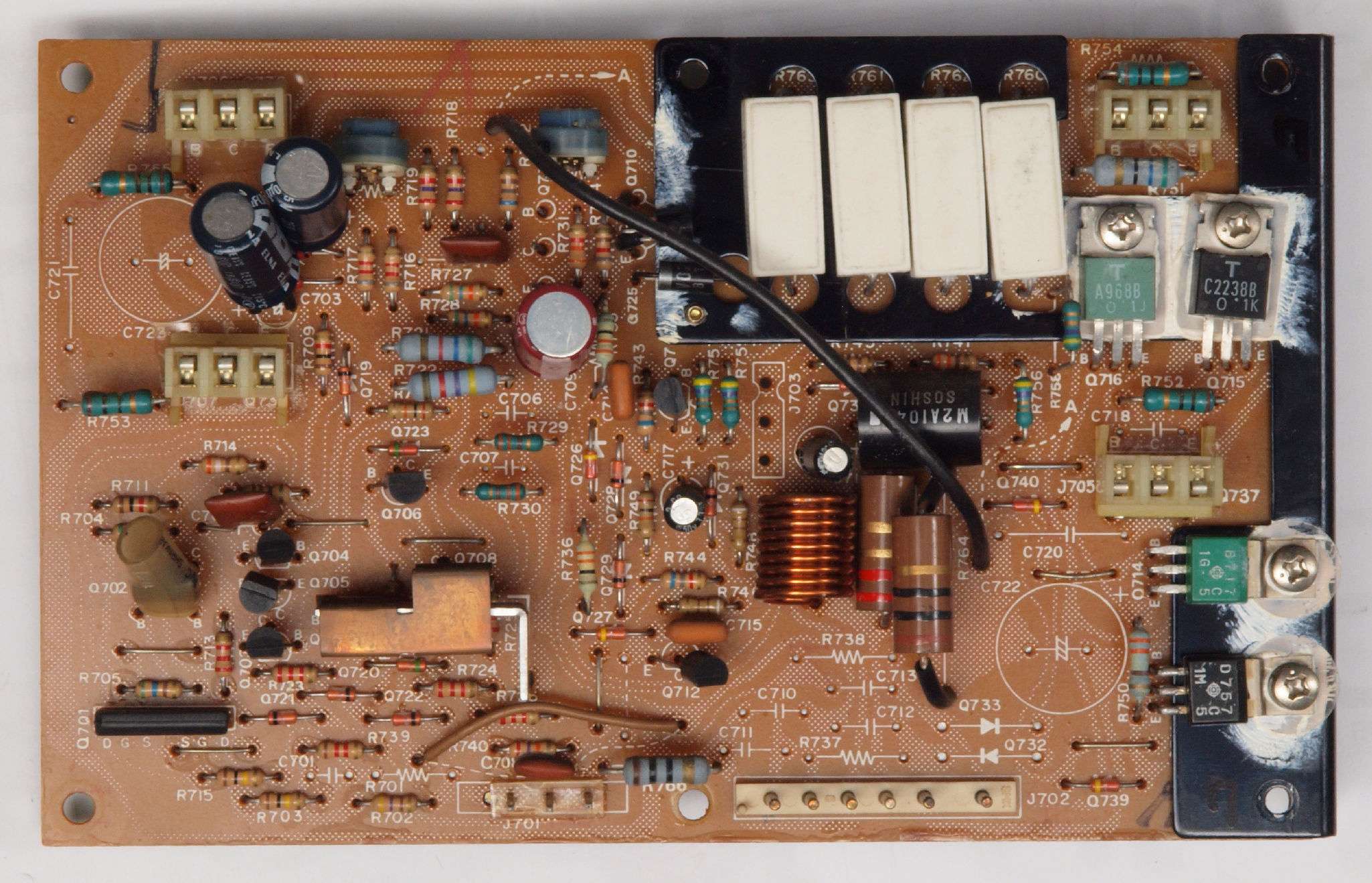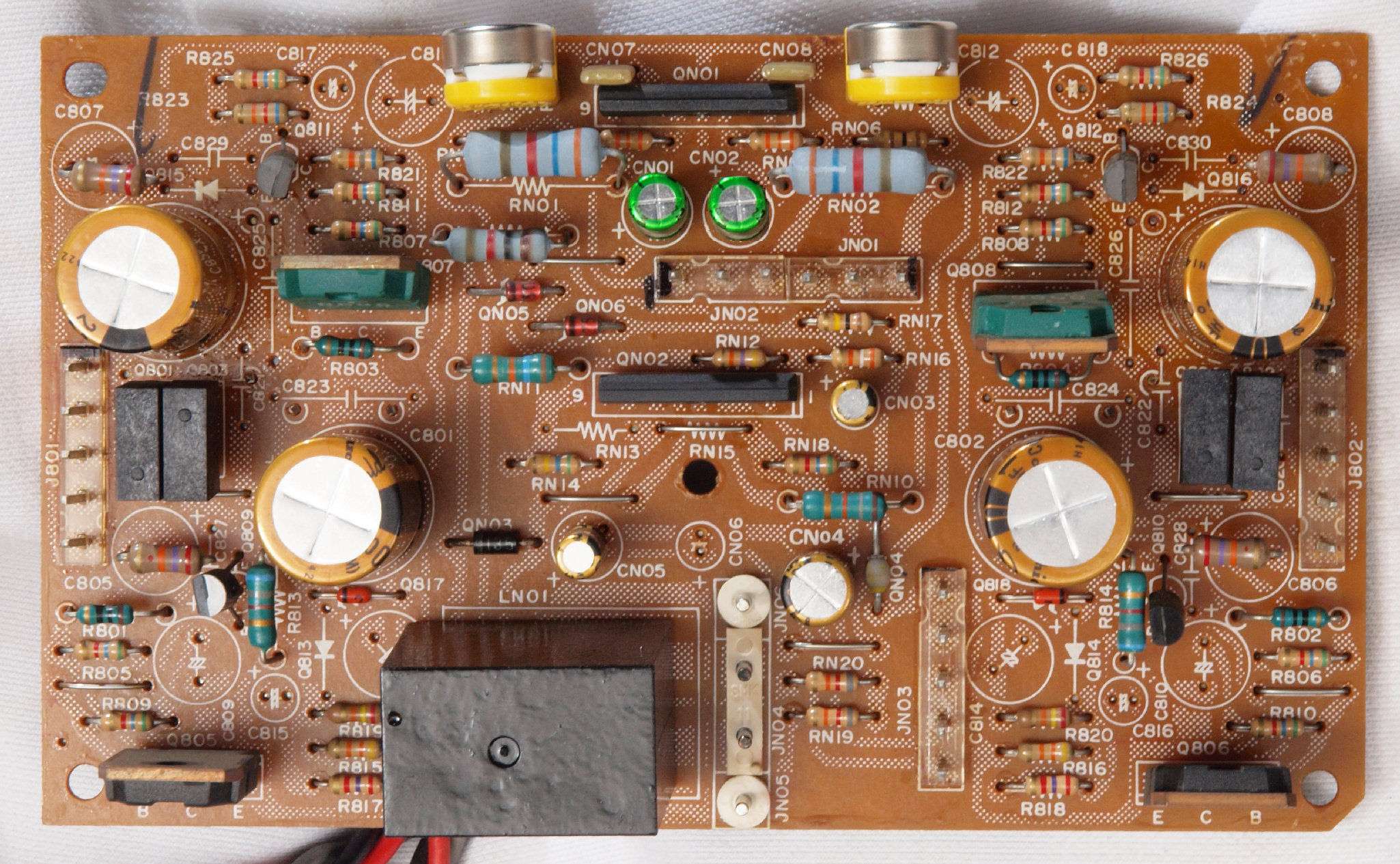 | C42. 修理後 L側終段基板 FET(電解トランジスター)1個、TR(トランジスター)11個、電解コンンサー5個、半固定VR2個、抵抗3個交換 | ||||||||||||||||||||||||