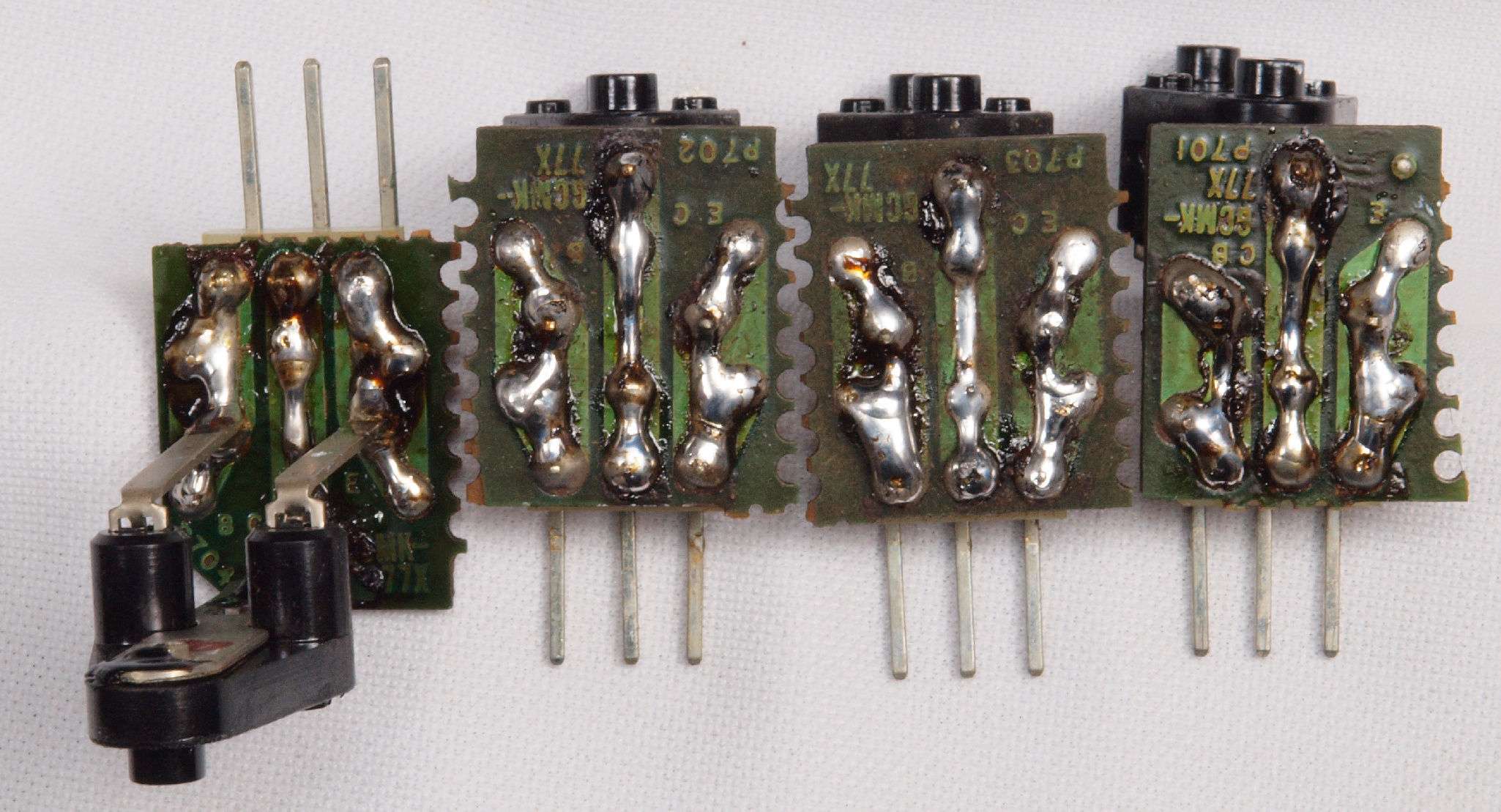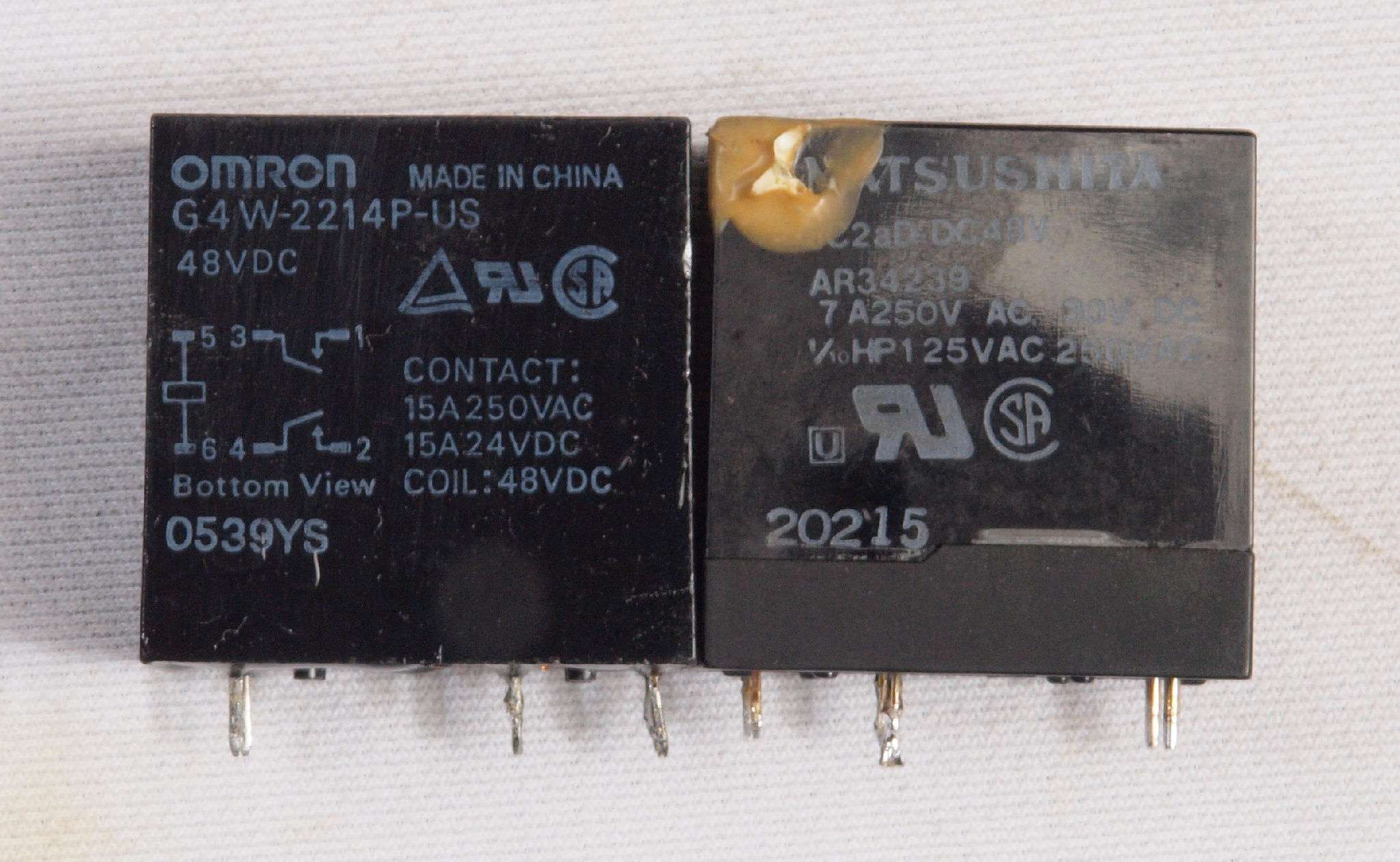 | CC2. 交換部品、SP接続リレー。左=交換した物 15A/250V、右=付いていた物 7A/250V。 | ||||||||||||||||||||||||