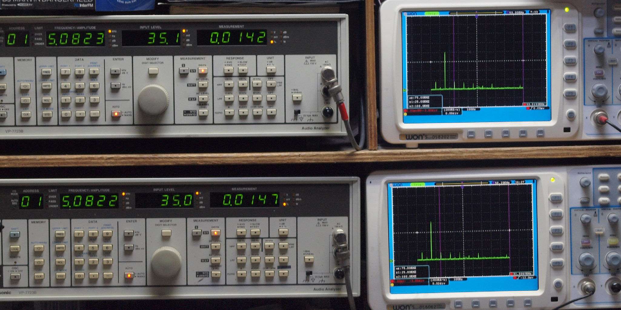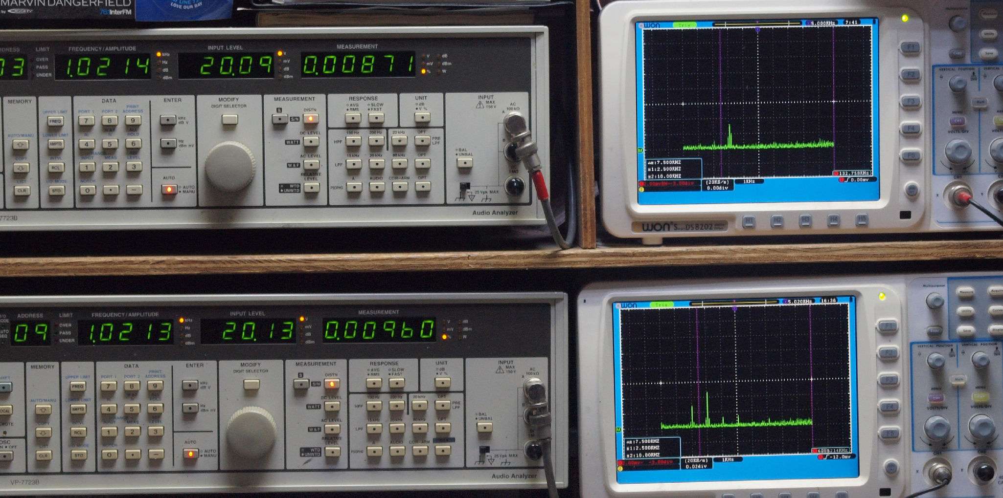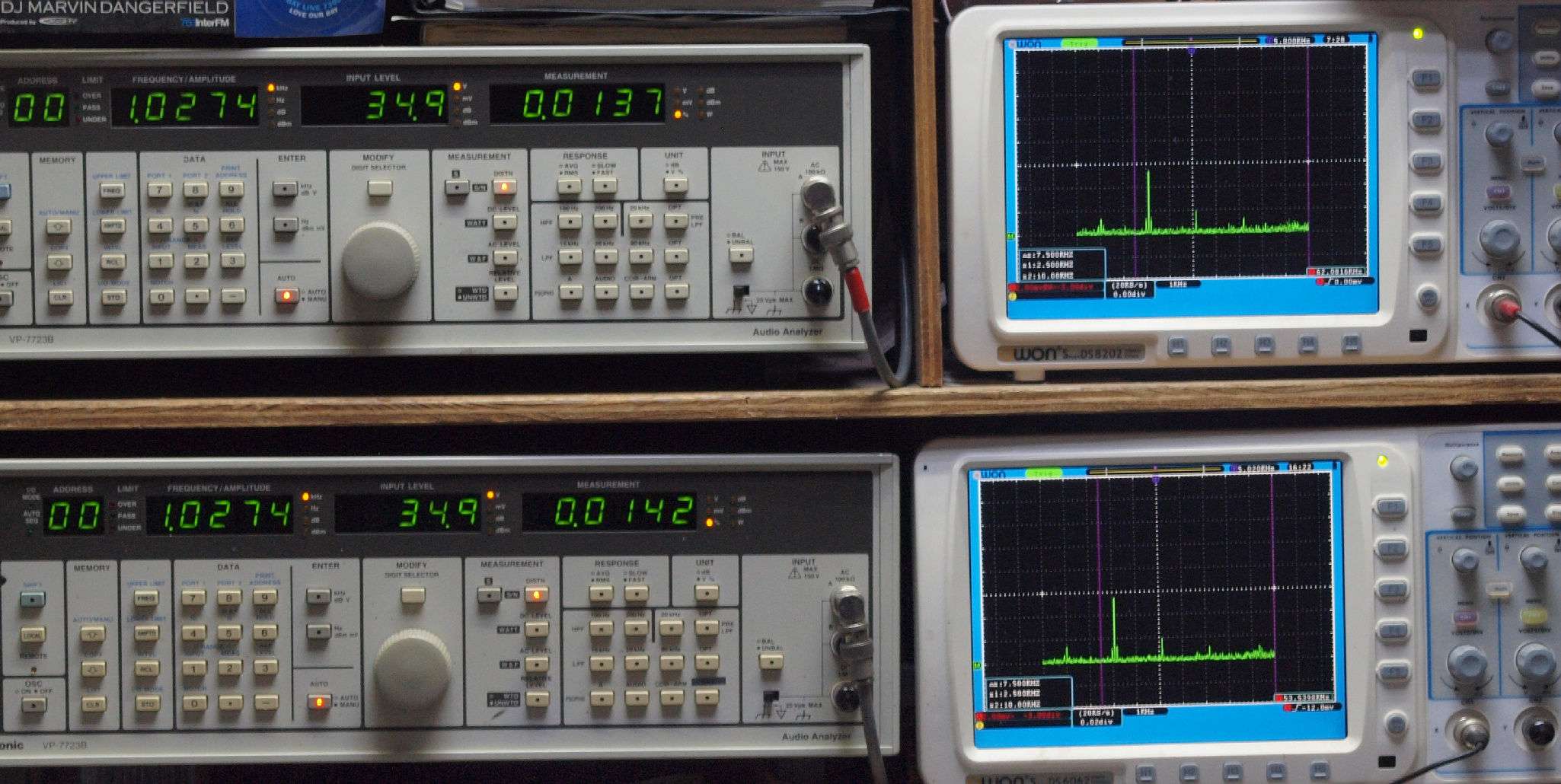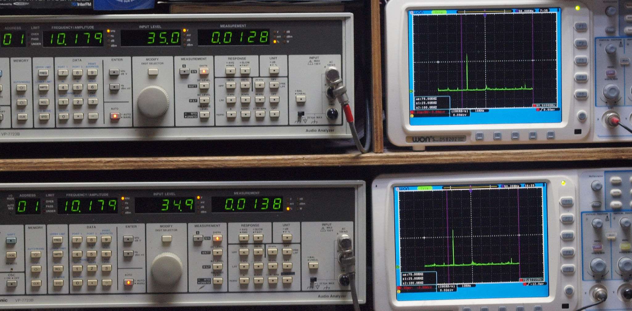 | E. 調整・測定。 画像をクリックすると、大きく(横幅2050ドット)表示されます。 E0. 出力・歪み率測定・調整。 「見方」。 上段中 右側SP出力を「Audio Analyzer Panasonic VP−7723B」により測定。 表示LED、 左端=メモリーNo、 中左=周波数測定、 中右=出力電圧測定、 右端=歪み率測定。 上段右端 VP−7723Bの基本波除去出力を「owon SDS8202(200MHZ)」で「FFT分析」表示。 下段中 左側SP出力を「Audio Analyzer Panasonic VP−7723B」により測定。 表示LED、 左端=メモリーNo、 中左=周波数測定、 中右=出力電圧測定、 右端=歪み率測定。 下段右端 VP−7723Bの基本波除去出力を「owon SDS6062(200MHZ)」で「FFT分析」表示。 下段左端 オーディオ発振器 VP−7201A より50Hz〜100kHzの信号を出し(歪み率=約0.003%)、ATT+分配器を通し、AMPに入力。 よって、ダイアル設定出力レベルより低くなります。測定機器の仕様や整備の様子はこちら、「VP−7723B」「VP−7201A」。 FFT画面の見方はこちら。 |