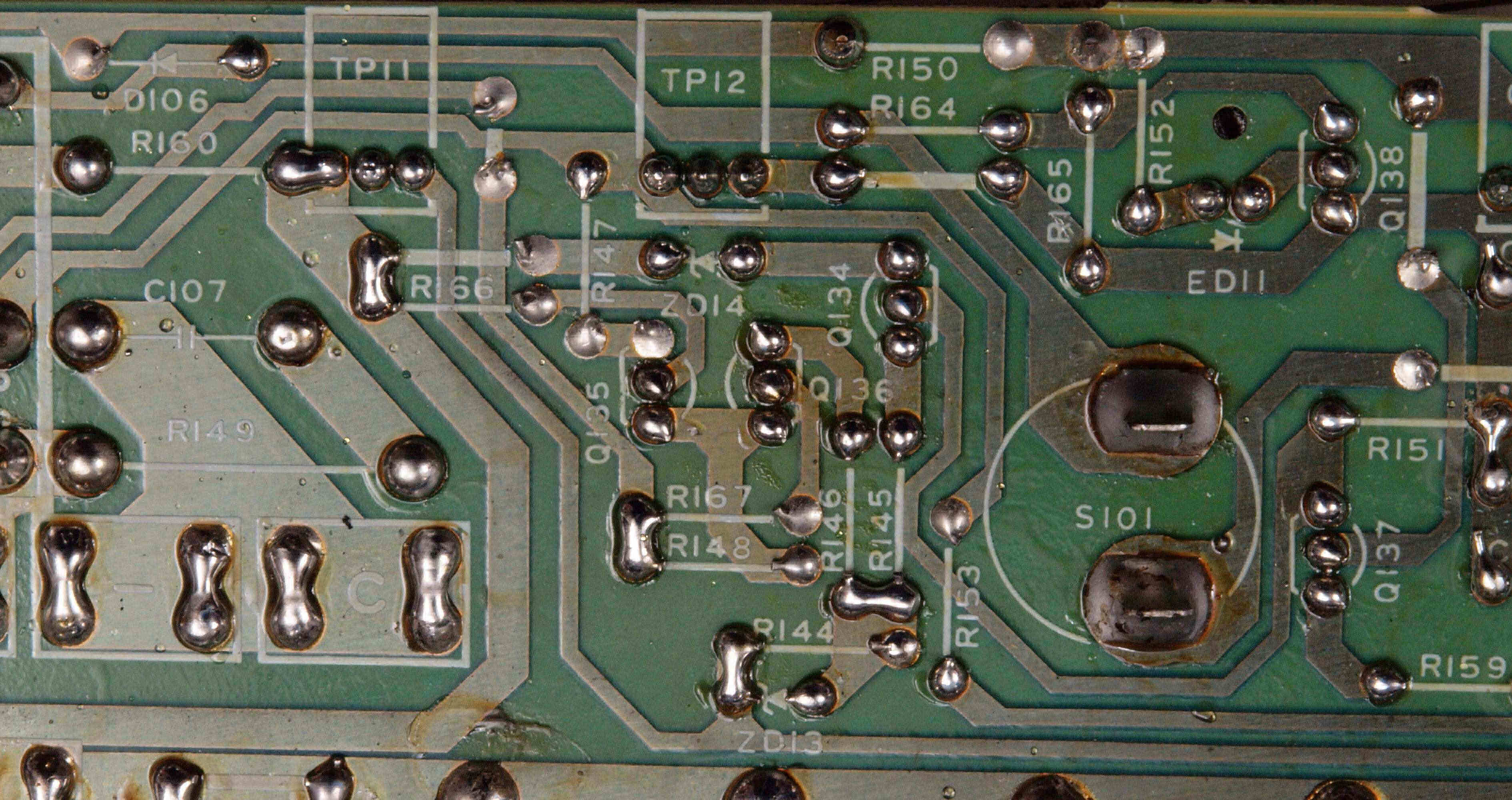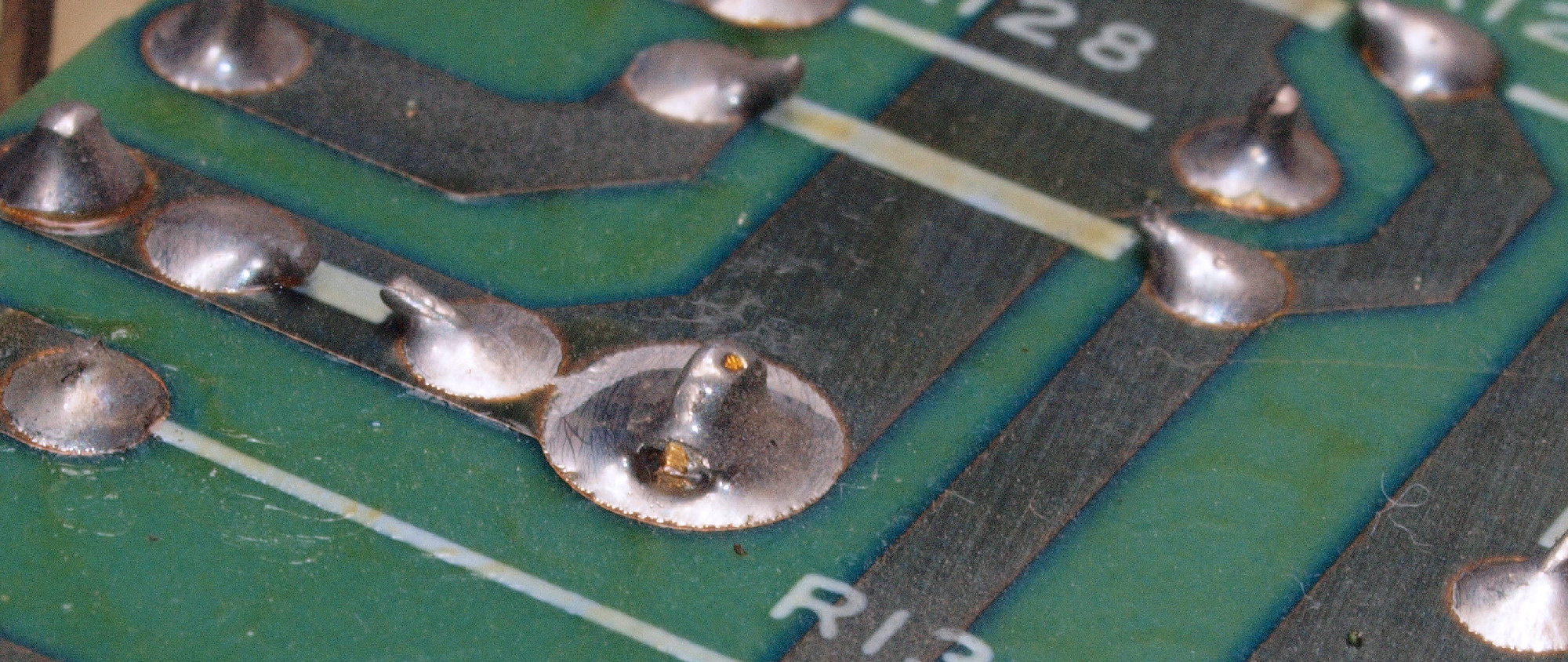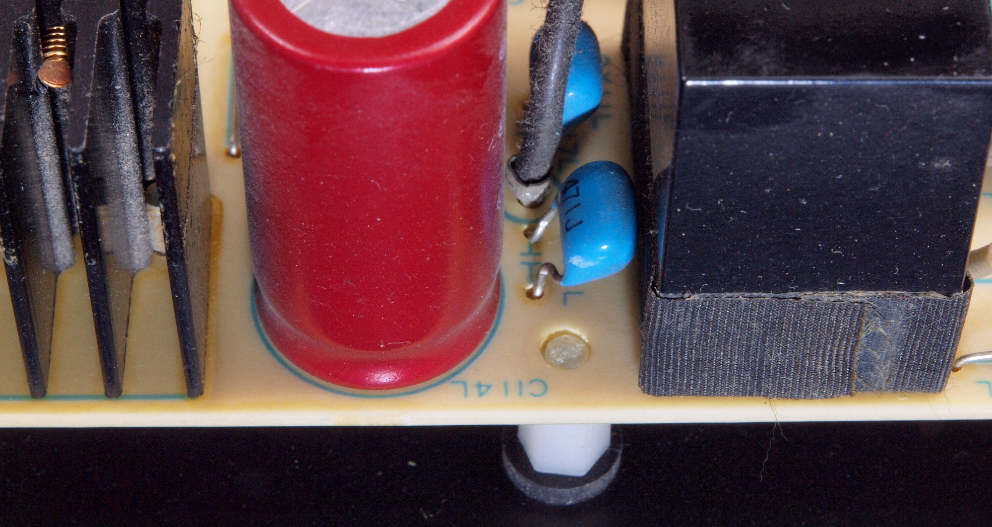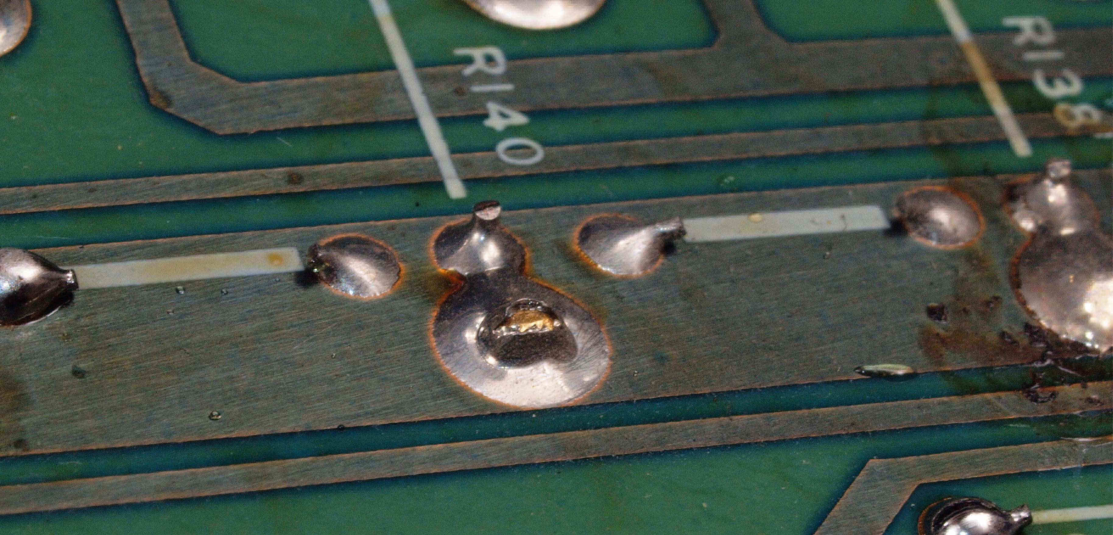 | A32. 点検中 電源電解コンデンサーの端子にかろうじて付着している半田球(屑)。 | ||||||||||||||||||||||||||||||||||||||||||