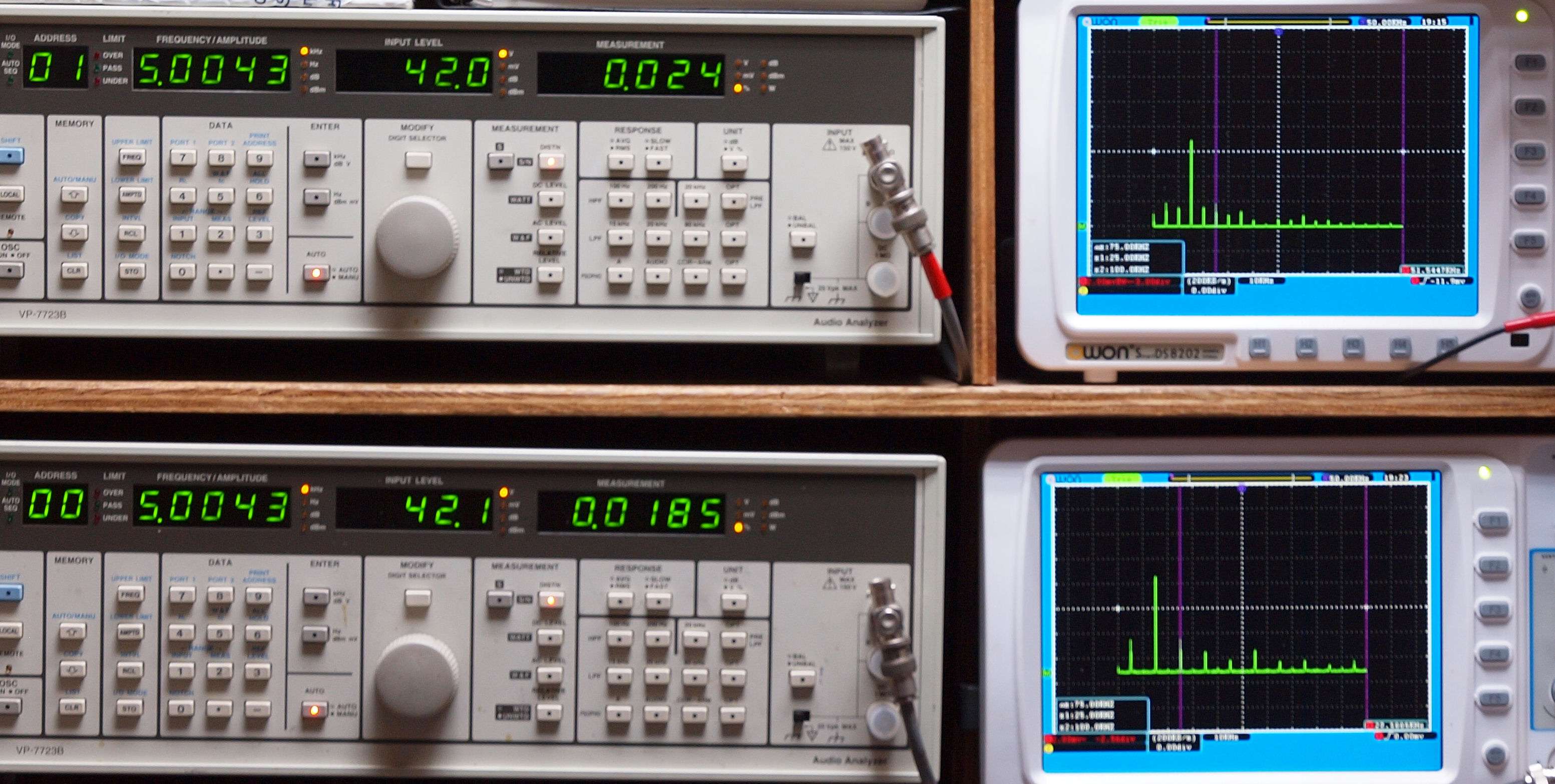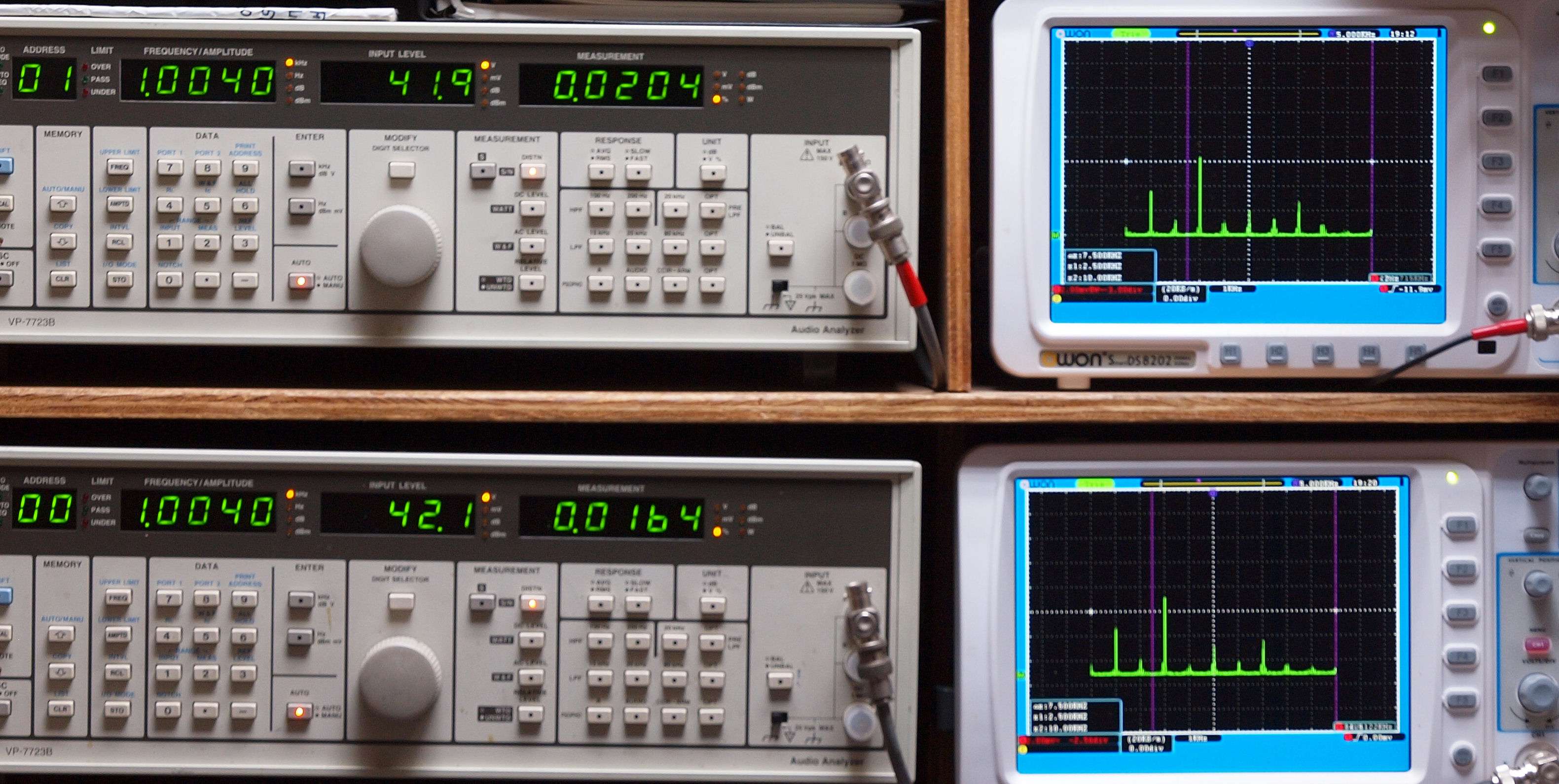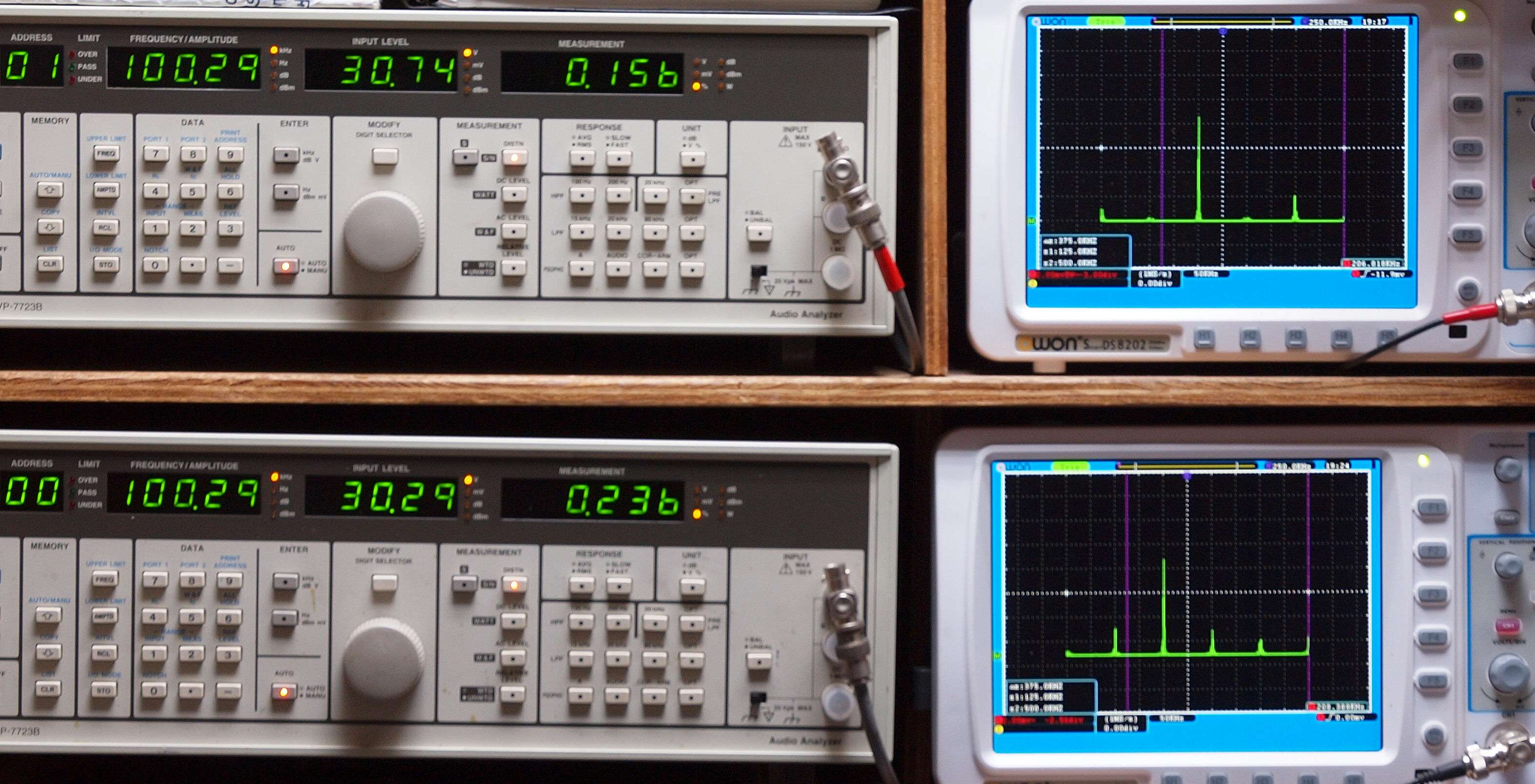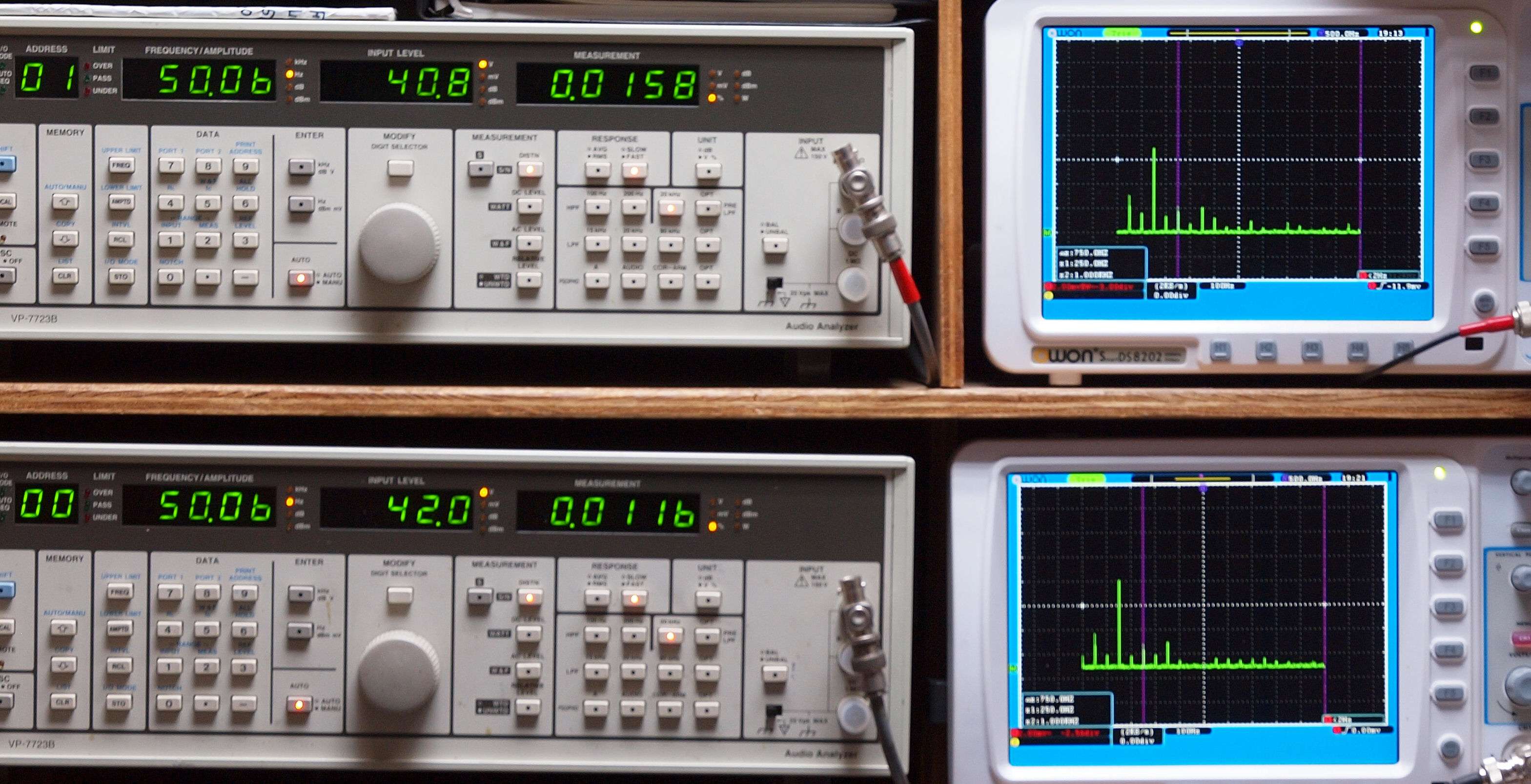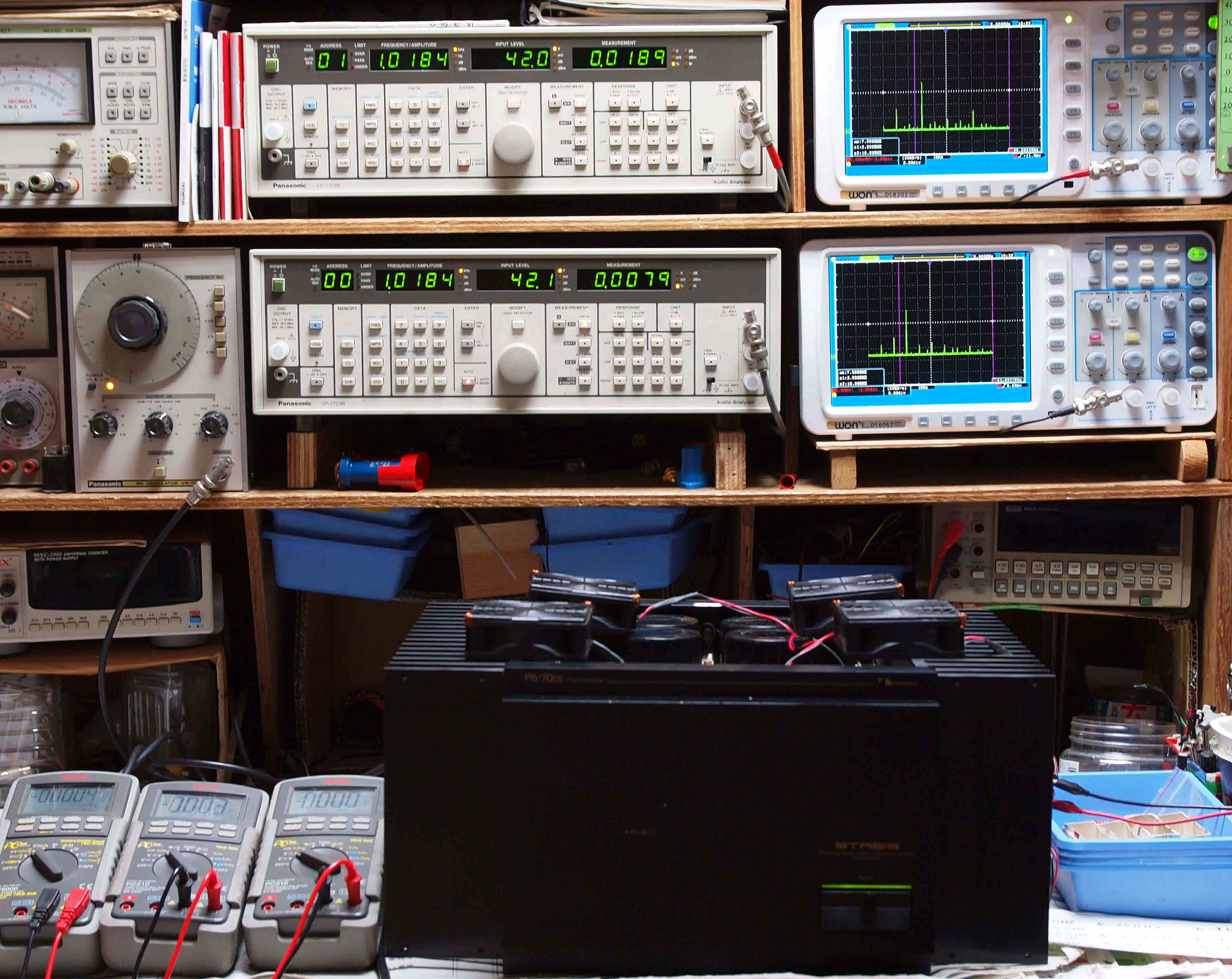 | E. 測定・調整 E1. 出力・歪み率測定・調整 「見方」。 上段中 右側SP出力を「Audio Analyzer Panasonic VP−7723B」により測定。 表示LED、 左端=メモリーNo、 中左=周波数測定、 中右=出力電圧測定、 右端=歪み率測定。 上段右端 VP−7723Bの基本波除去出力を「owon SDS8202(200MHZ)」で「FFT分析」表示。 下段中 左側SP出力を「Audio Analyzer Panasonic VP−7723B」により測定。 表示LED、 左端=メモリーNo、 中左=周波数測定、 中右=出力電圧測定、 右端=歪み率測定。 下段右端 VP−7723Bの基本波除去出力を「owon SDS6062(200MHZ)」で「FFT分析」表示。 下段左端 オーディオ発振器 VP−7201A より50Hz〜100kHzの信号を出し(歪み率=約0.003%)、ATT+分配器を通し、AMPに入力。 よって、ダイアル設定出力レベルより低くなります。測定機器の仕様や整備の様子はこちら、「VP−7723B」「VP−7201A」。 FFT画面の見方はこちら。 |