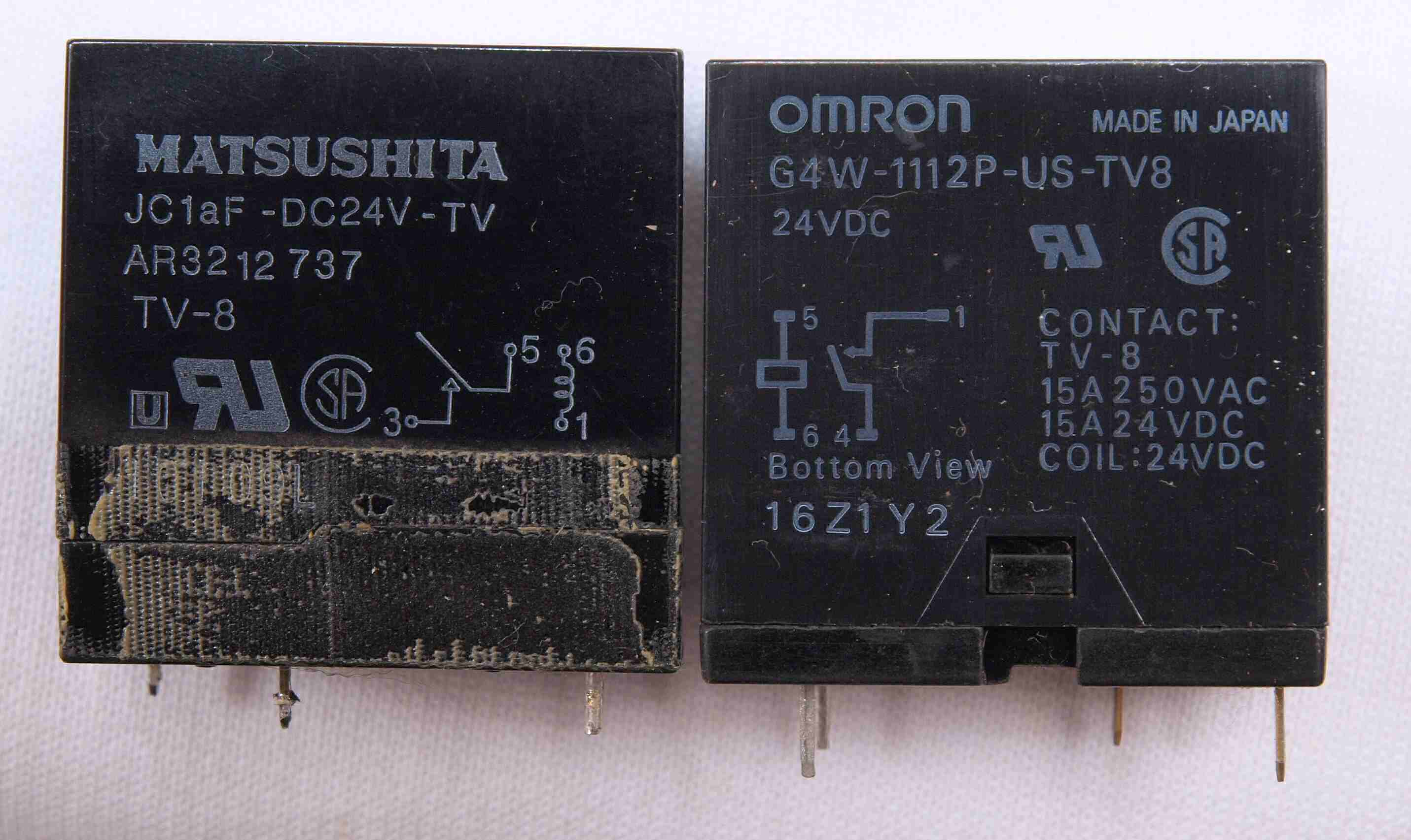 | A41. 点検中 電源投入リレー比較 左=付いていた接点容量10A定格、 右=交換する接点容量15A定格。 | ||||||||||||||||||||||||||||||||||||||||||