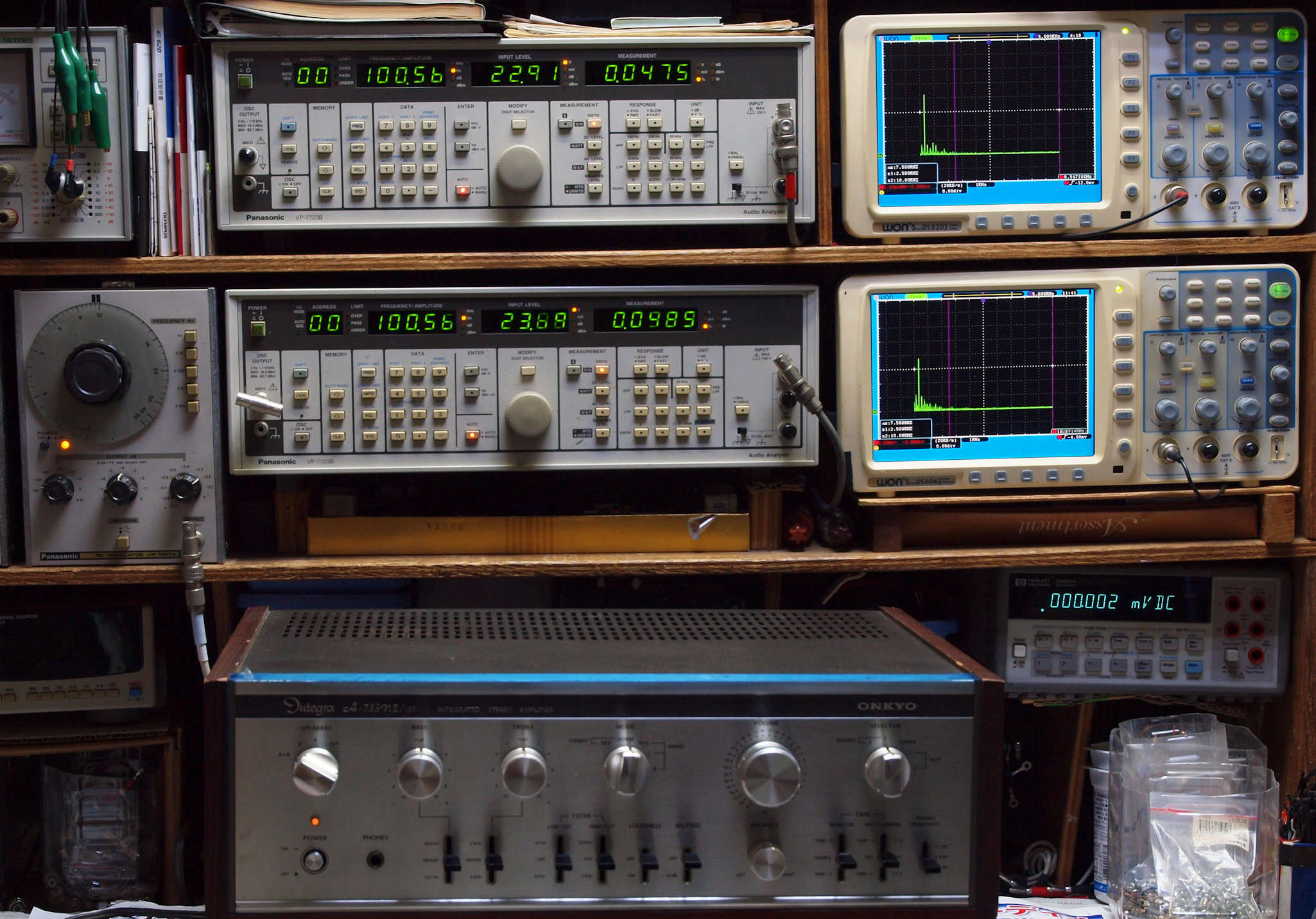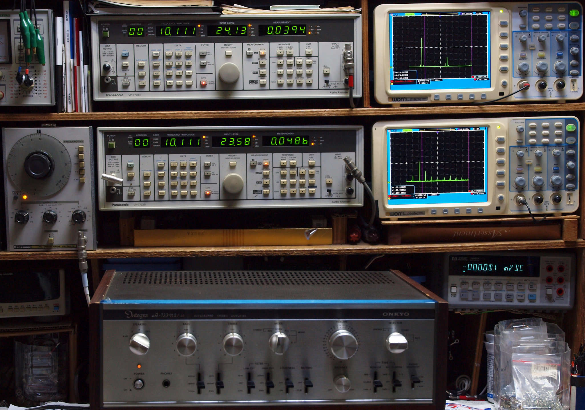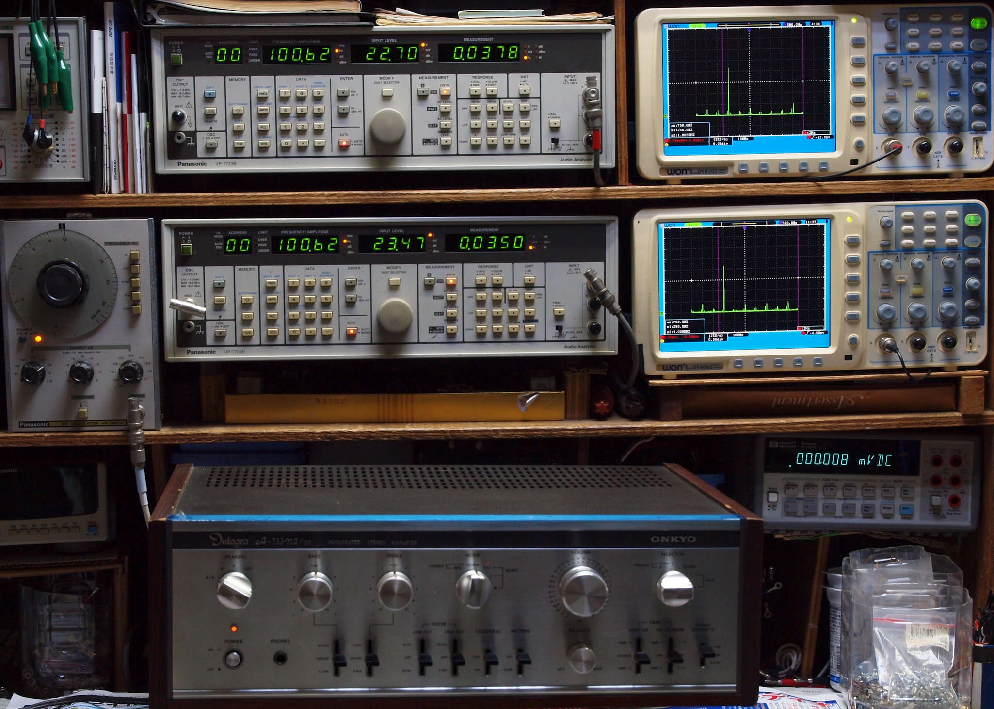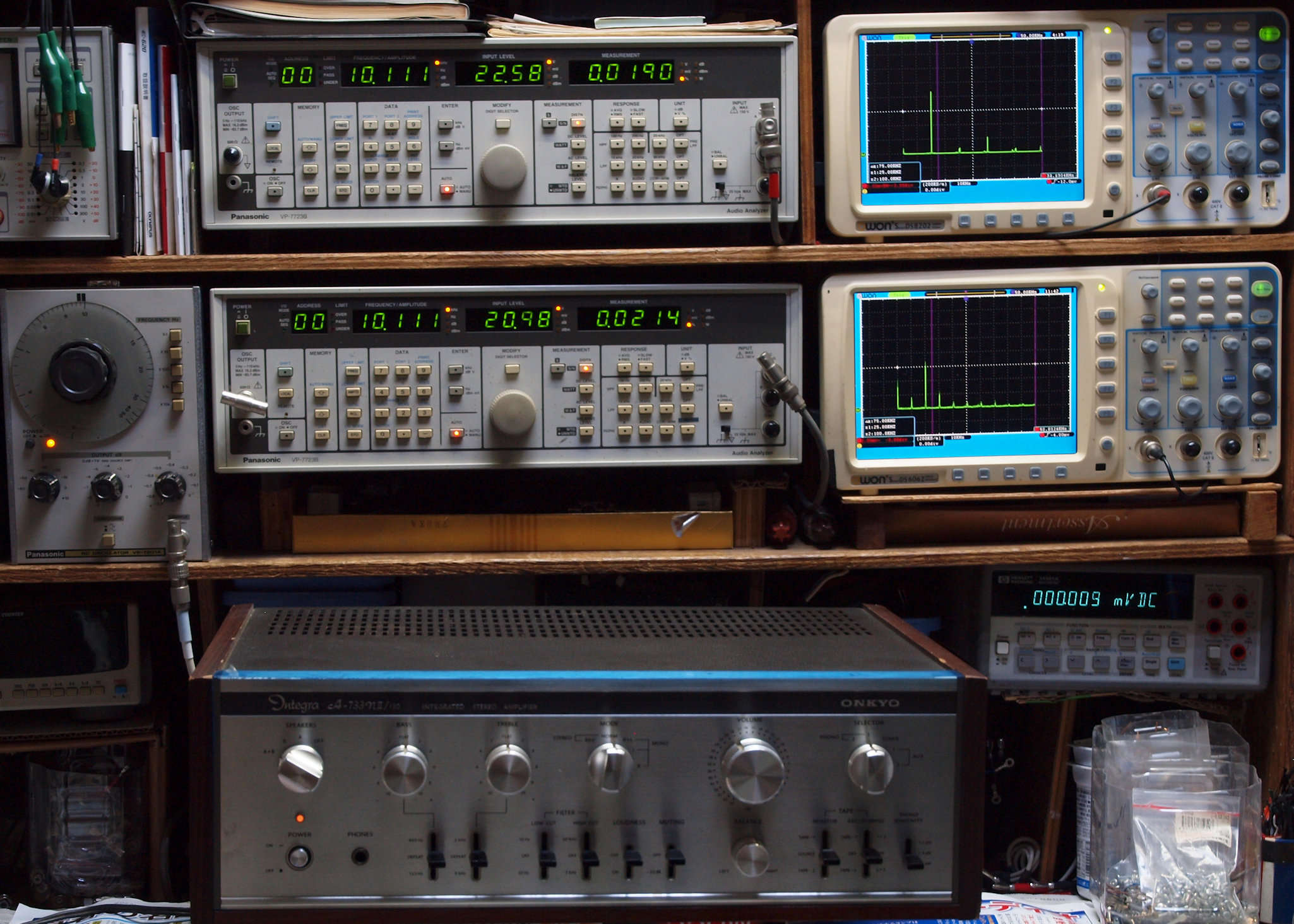 | E. 調整・測定。 E0. 出力・歪み率測定・調整。 「見方」。 上段中 右側SP出力を「Audio Analyzer Panasonic VP−7723B」により測定。 表示LED、 左端=メモリーNo、 中左=周波数測定、 中右=出力電圧測定、 右端=歪み率測定。 下段中 左側SP出力を「Audio Analyzer Panasonic VP−7723B」により測定。 表示LED、 左端=メモリーNo、 中左=周波数測定、 中右=出力電圧測定、 右端=歪み率測定。 下段左端 オーディオ発振器 VP−7201A より50Hz〜100kHzの信号を出し(歪み率=約0.003%)、ATT+分配器を通し、AMPに入力。 よって、ダイアル設定出力レベルより低くなります。測定機器の仕様や整備の様子はこちら、「VP−7723B」「VP−7201A」。 FFT画面の見方はこちら。 |