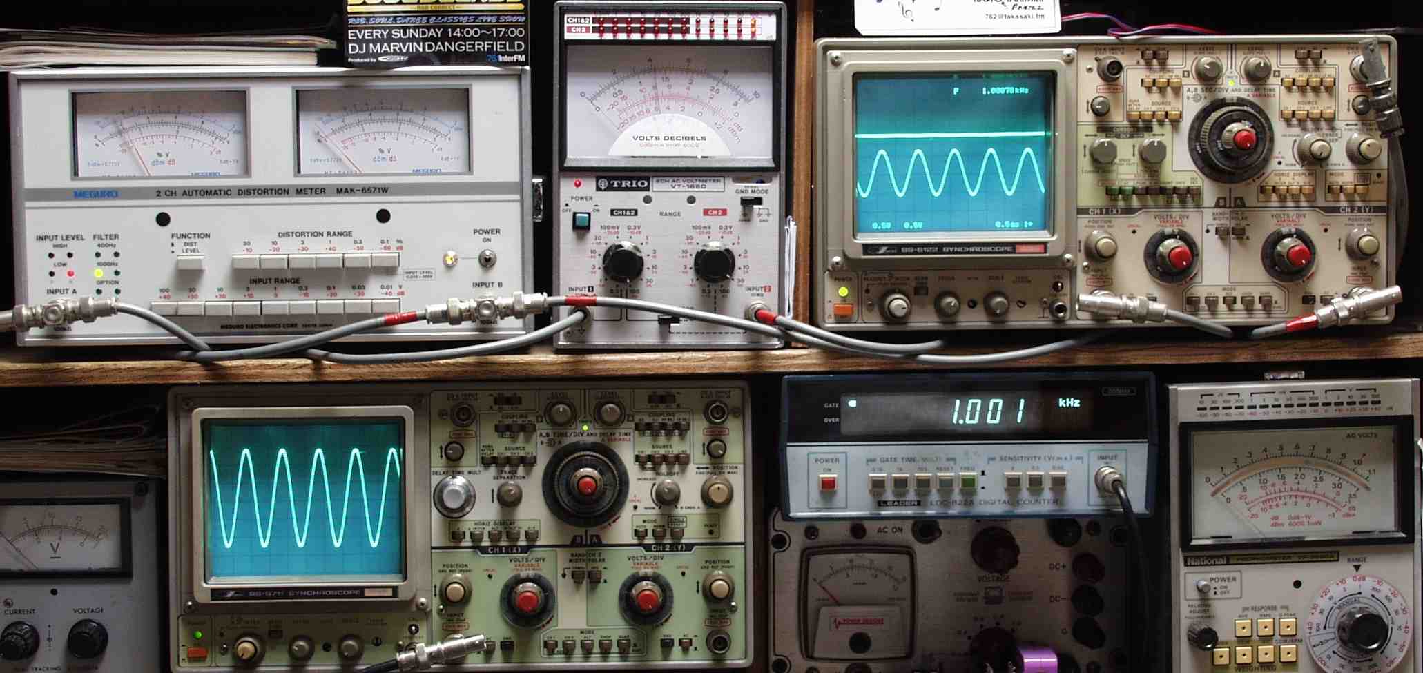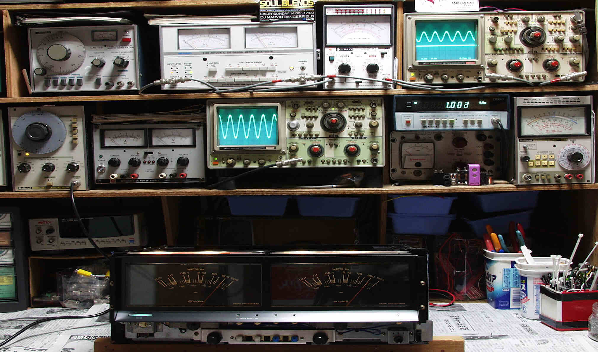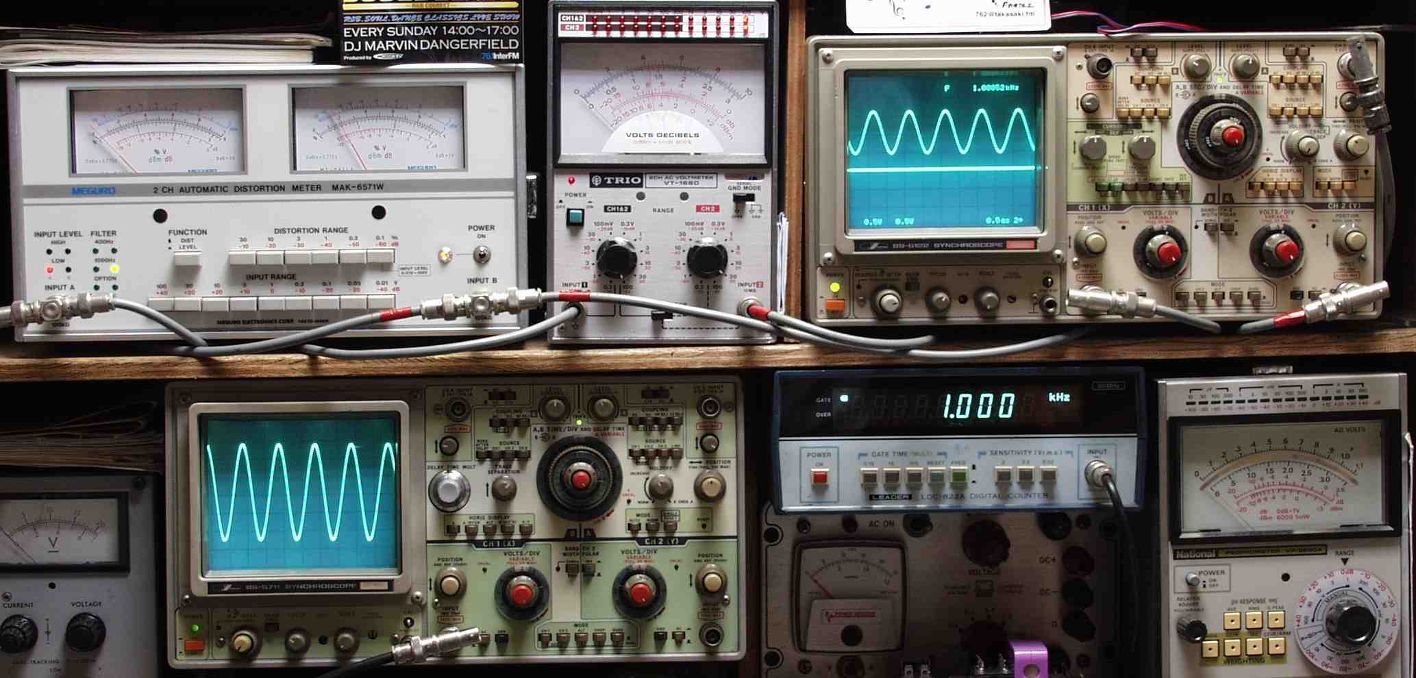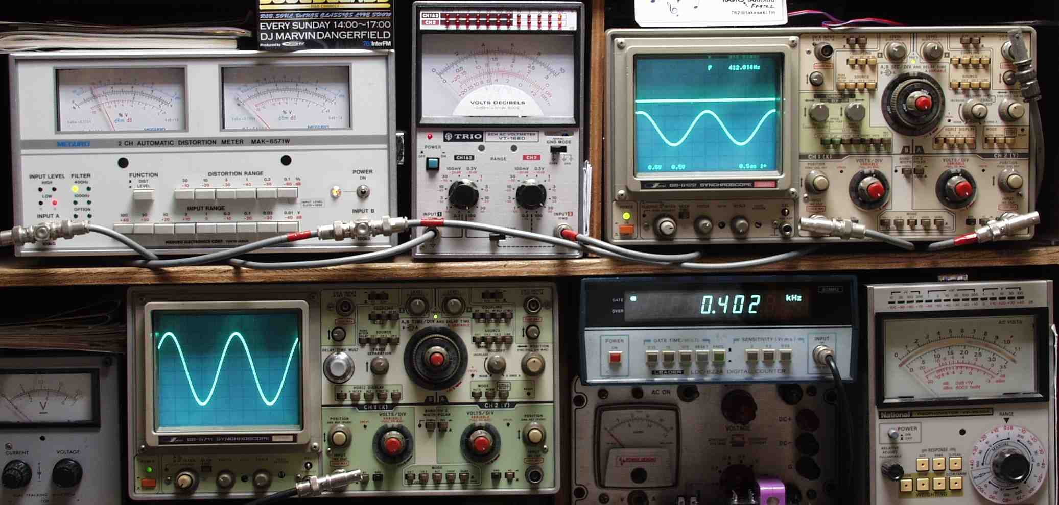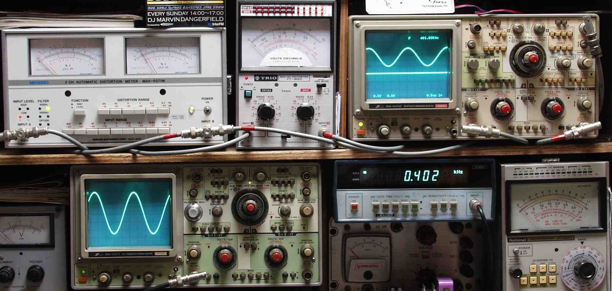 | E. 調整・測定 E0.出力/歪み率測定・調整 <見方> 下左オーデオ発振器より400HZ・1KHZの信号を出す(歪み率=約0.003%) 下中=入力波形(オーデオ発振器のTTLレベル) 下右=周波数計 上左=SP出力の歪み率測定 左メ−タ−=L出力、右メ−タ−=R出力 上中=SP出力電圧測定器、赤針=R出力、黒針=L出力 上右=SP出力波形オシロ 上=R出力、下=L出力(出力電圧測定器の出力) |