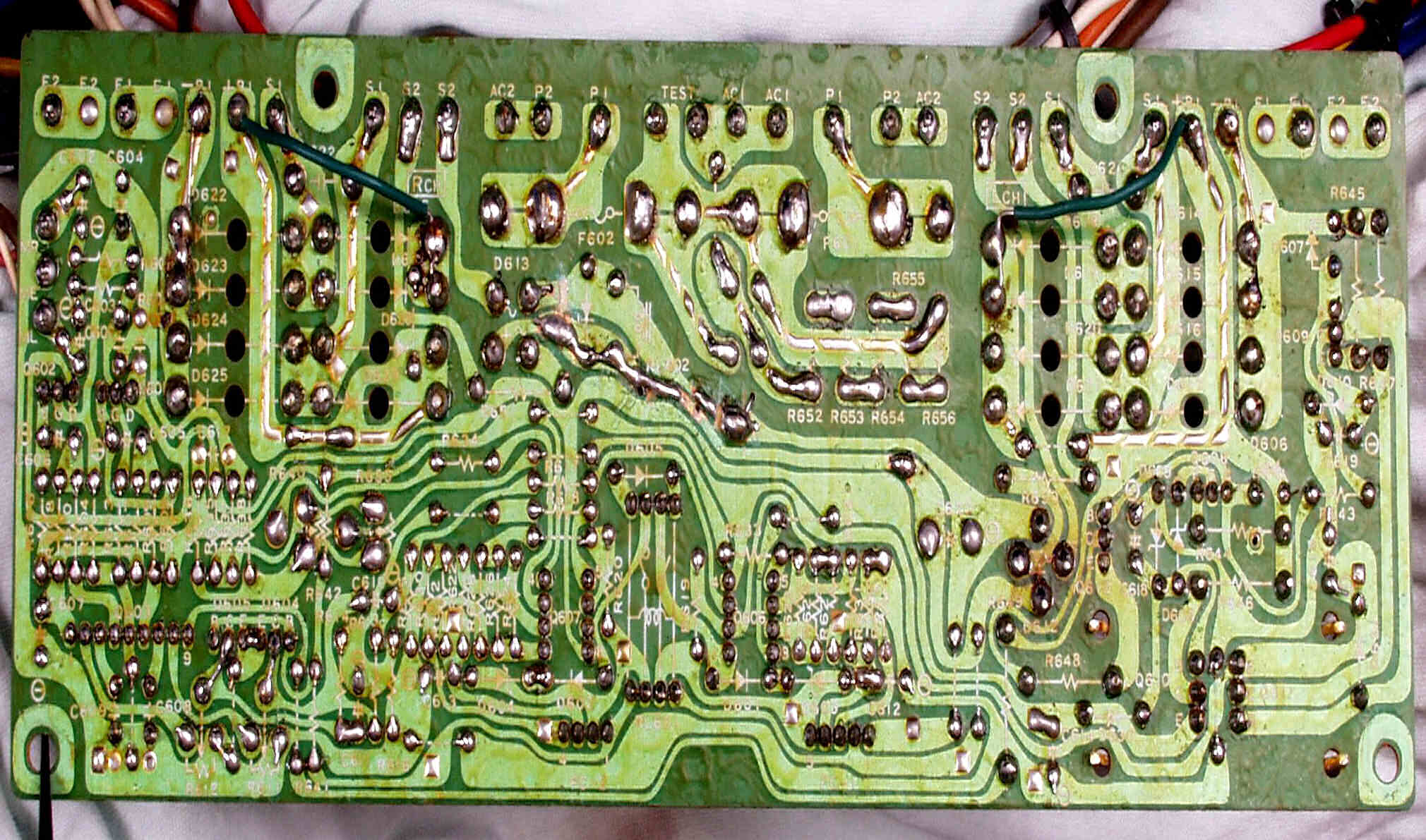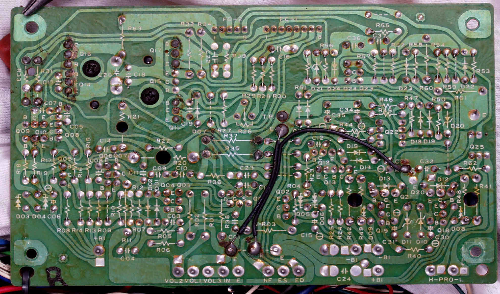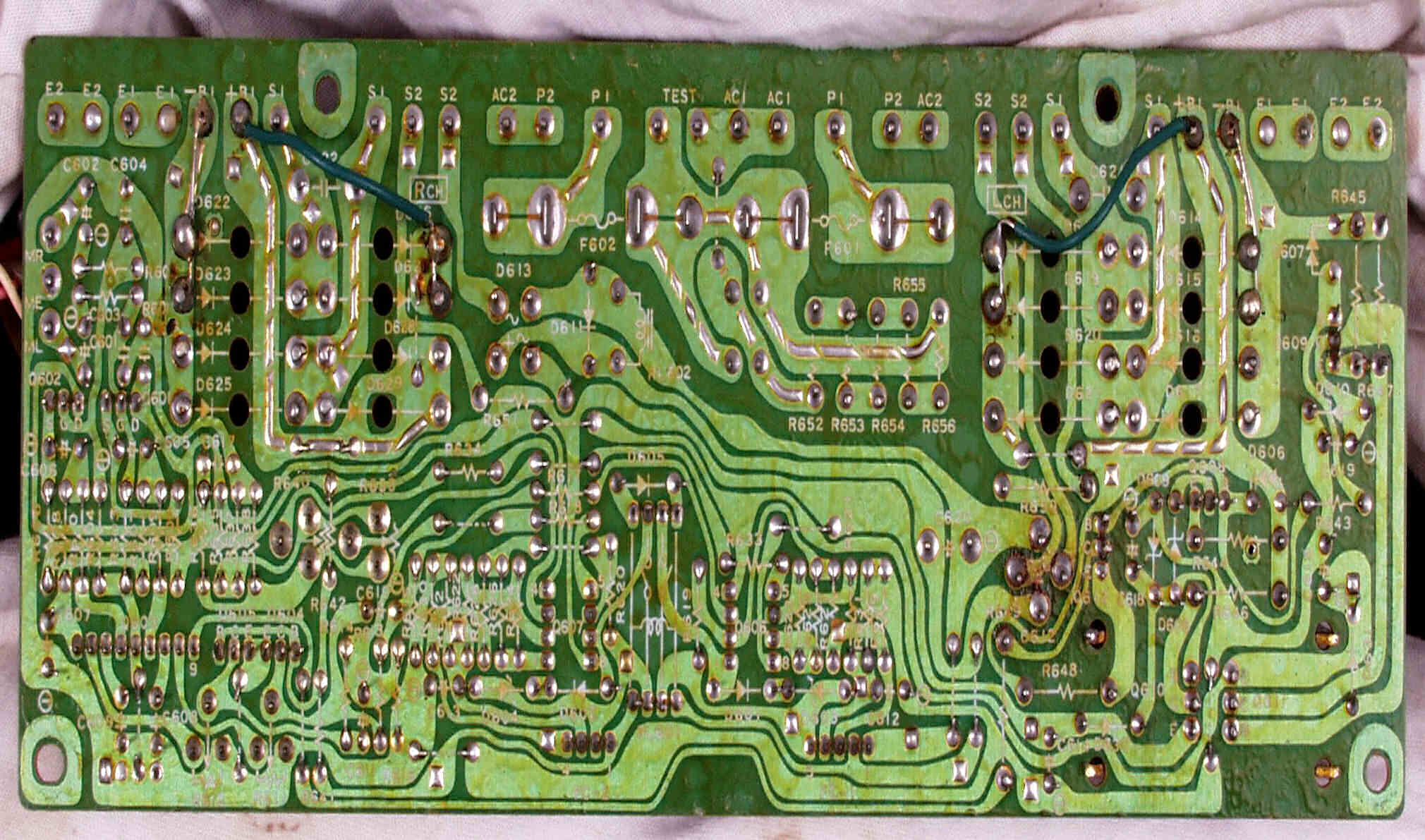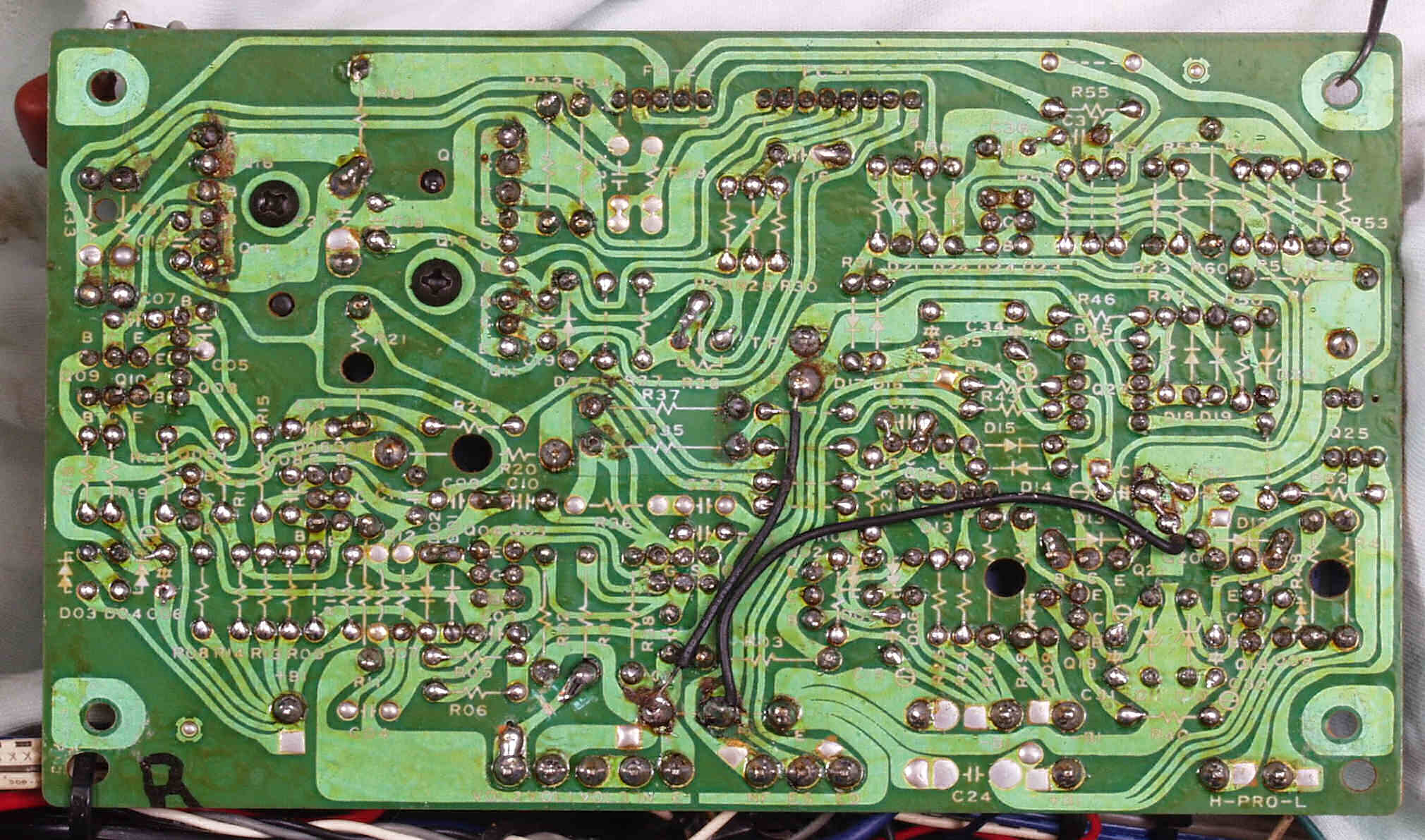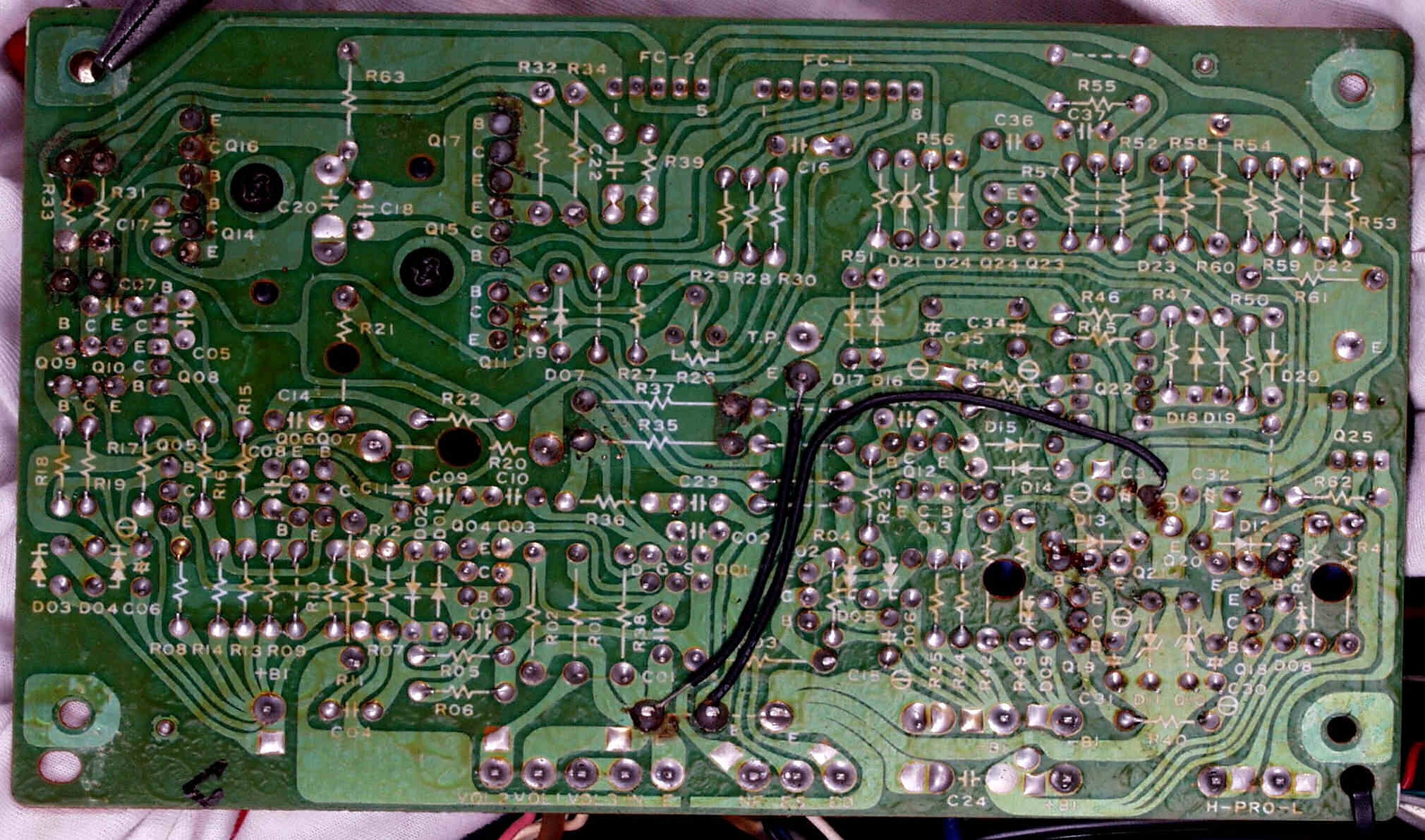 | C53. 修理前 整流・定電圧・VUアンプ基板裏。 | ||||||||||||||||||||||||||||||||||||||||||||||||||||||||||