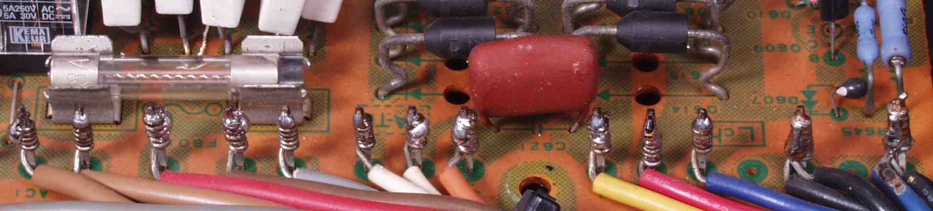| C21. 修理前 Lドライブ基板。 上の白いコネクターで終段TR(トランジスター)と接続する。 これが接続不良になると 終段TR(トランジスター)が死ぬ、W配線くらいの配慮が欲しい。 | ||||||||||||||||||||||||||||||||||||||||||||||||||||||||||