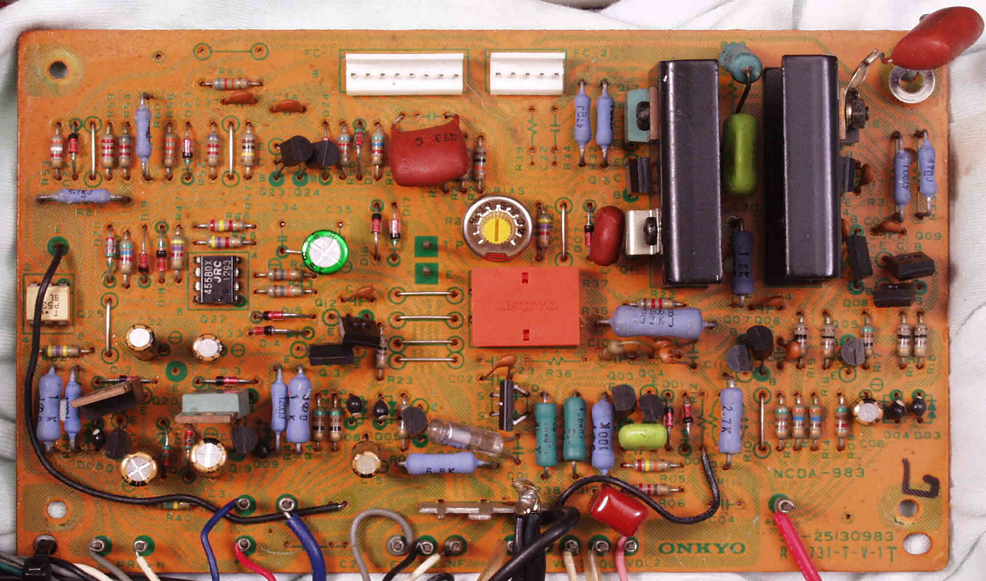 | C12. 修理後 Rドライブ基板。 初段FET、バイアス調整用半固定VR、電解コンデンサー7個交換。 DCカットフイルムコンデンサー追加。 |