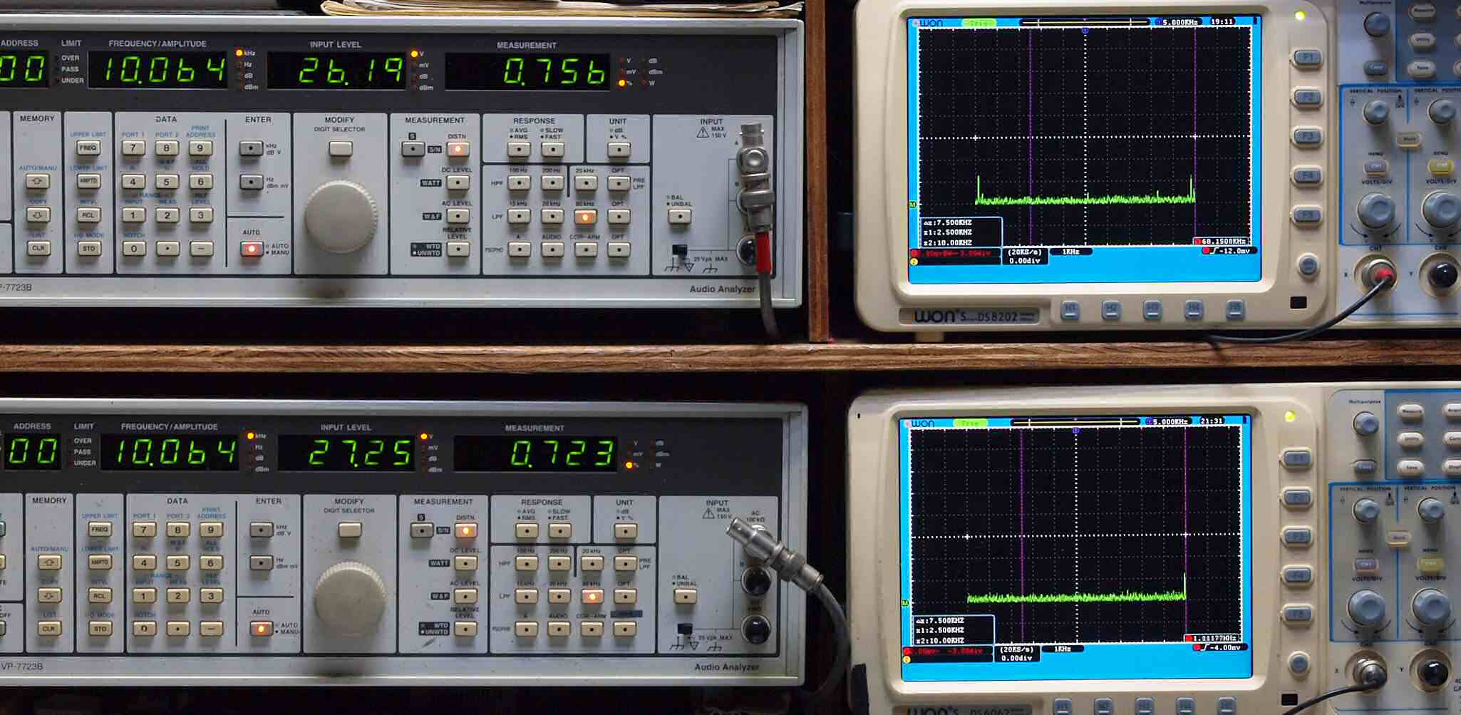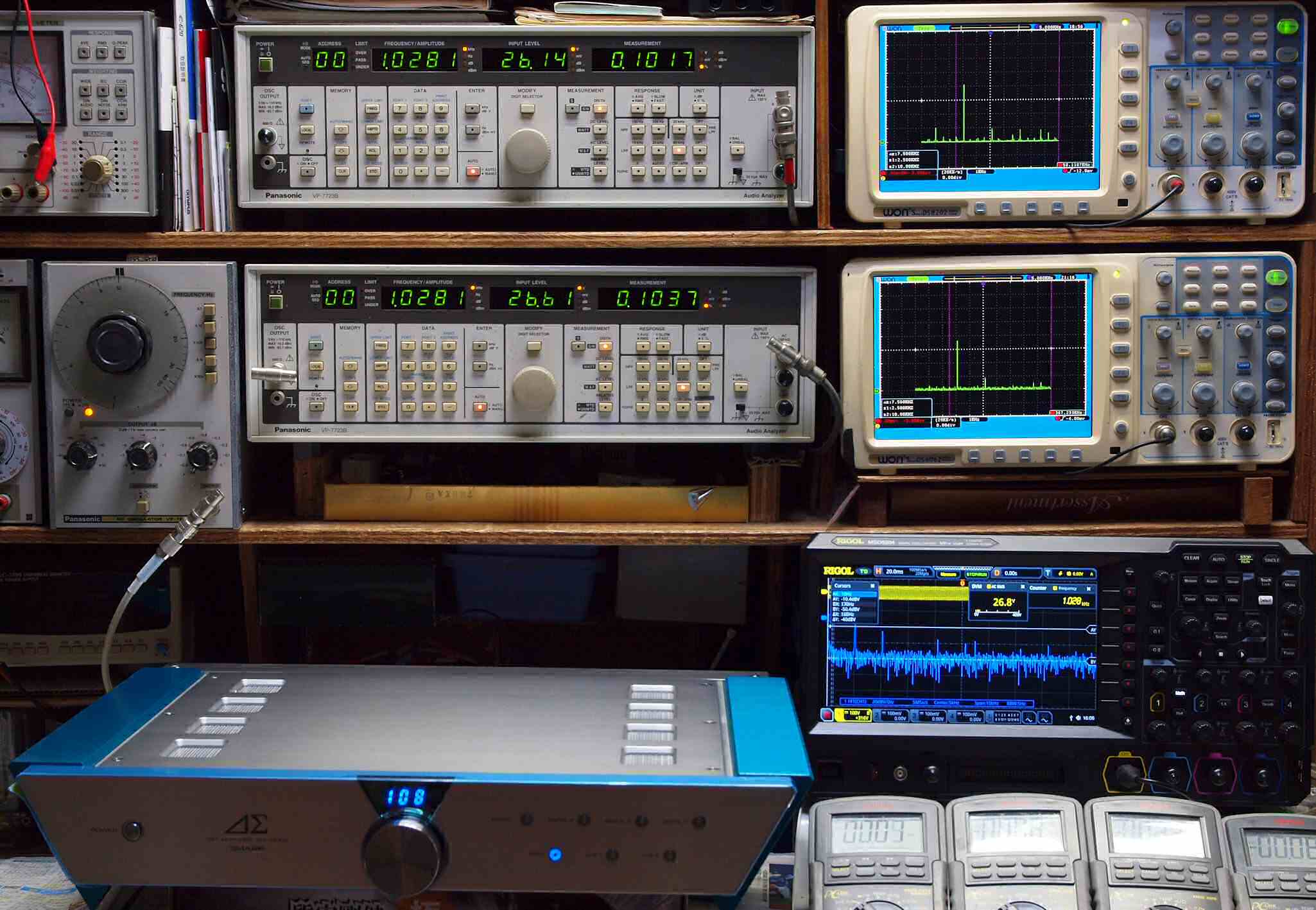 | E. 測定・調整。 画像をクリックすると、大きく(横幅2050ドット)表示されます。 E0. 出力・歪み率測定・調整 「見方」。 上段中 右側SP出力を「Audio Analyzer Panasonic VP−7723B」により測定。 表示LED、 左端=メモリーNo、 中左=周波数測定、 中右=出力電圧測定、 右端=歪み率測定。 上段右端 VP−7723Bの基本波除去出力を「owon SDS8202(200MHZ)」で「FFT分析」表示。 下段中 左側SP出力を「Audio Analyzer Panasonic VP−7723B」により測定。 表示LED、 左端=メモリーNo、 中左=周波数測定、 中右=出力電圧測定、 右端=歪み率測定。 下段右端 VP−7723Bの基本波除去出力を「owon SDS6062(200MHZ)」で「FFT分析」表示。 下段左端 オーディオ発振器 VP−7201A より50Hz〜100kHzの信号を出し(歪み率=約0.003%)、ATT+分配器を通し、AMPに入力。 よって、ダイアル設定出力レベルより低くなります。測定機器の仕様や整備の様子はこちら、「VP−7723B」「VP−7201A」。 FFT画面の見方はこちら。 入出力点検確認。 ライン1のアナログ入力、ライン2のバランス入力 、ライン出力点検確認済み。 デジタルNo1のST入力、デジタルNo2のBNCケーブル入力、デジタルNo3のRCAケーブル入力点検確認済み。 デジタルNo4の光ケーブル入力、デジタルNo5のSACD/1ビット入力(RCA入力)点検確認済み。 80kHz前後にクロック漏れが200mVPP(10mVrms)位あり、80kHzのローパスフイルターを挿入して測定。 仕様では、0.05%(1kHz、1W出力時) |
