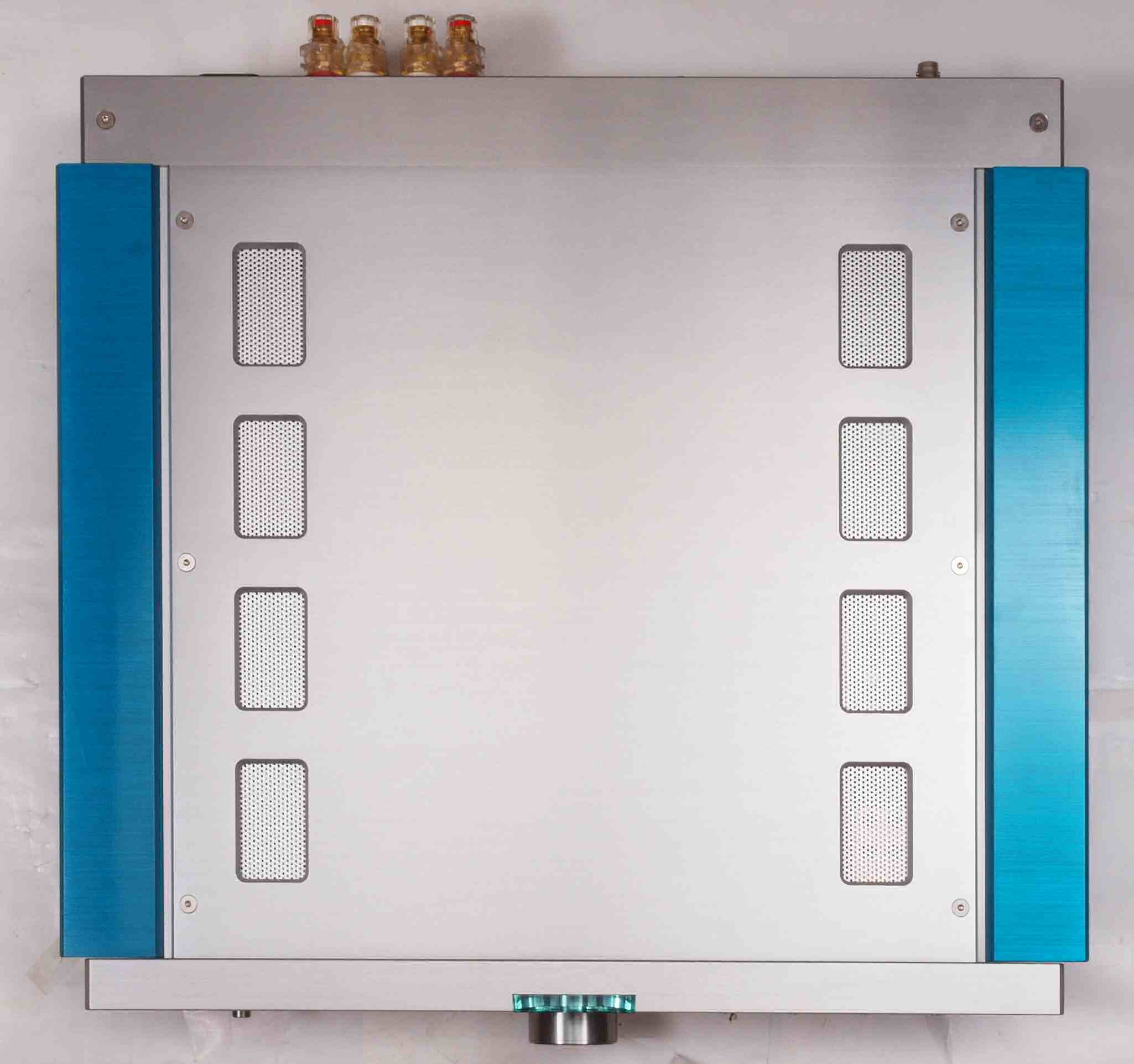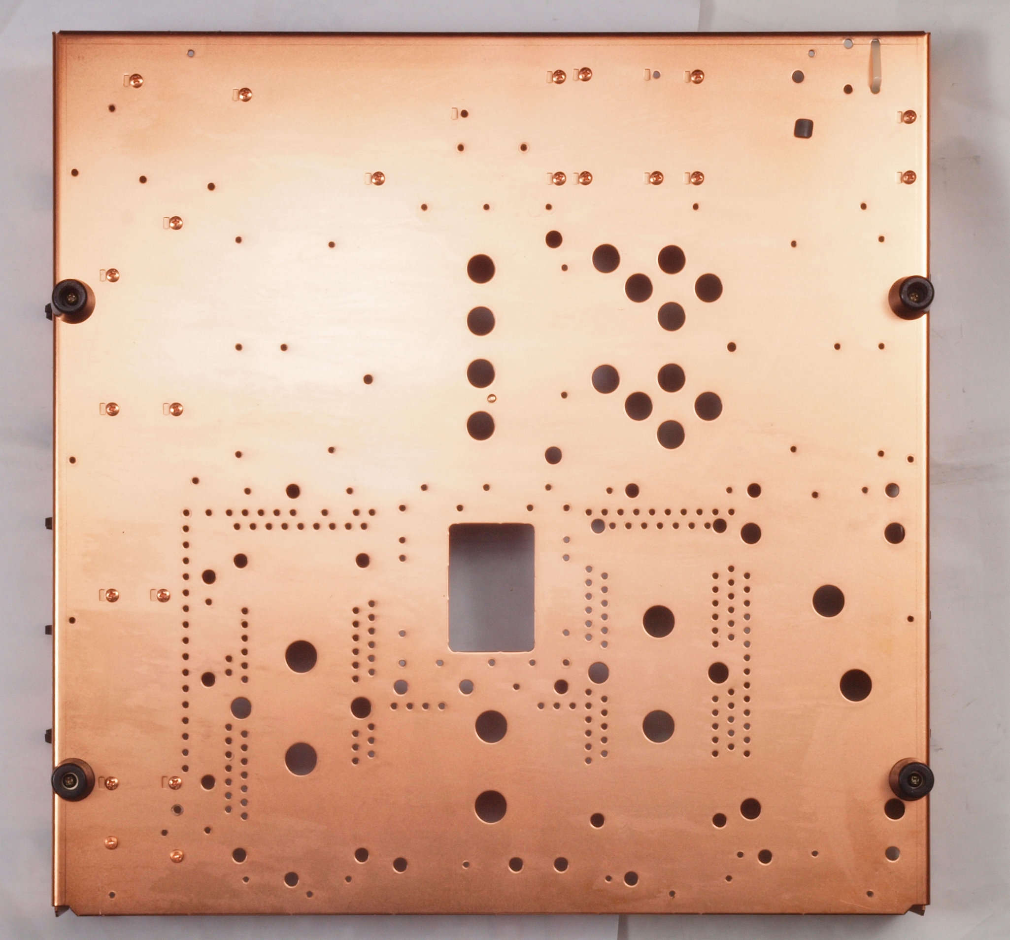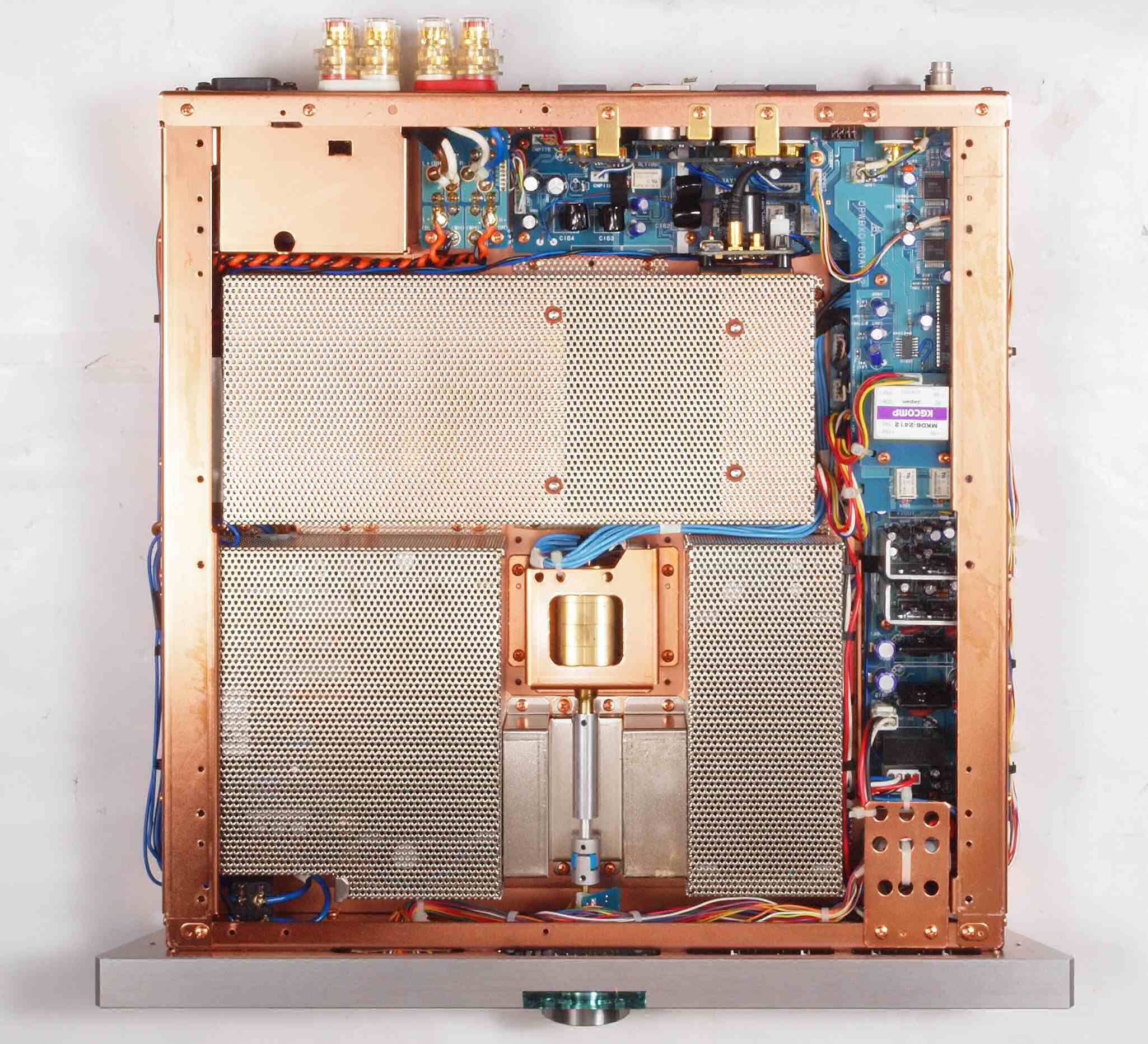 | A33. 点検中 左右横パネルと上下蓋を取り、上から見る。増設された外部クロック水晶発振器、LcAudio Lclock-XO3 STANDARD。 | ||||||||||||||||||||||||||||||||||