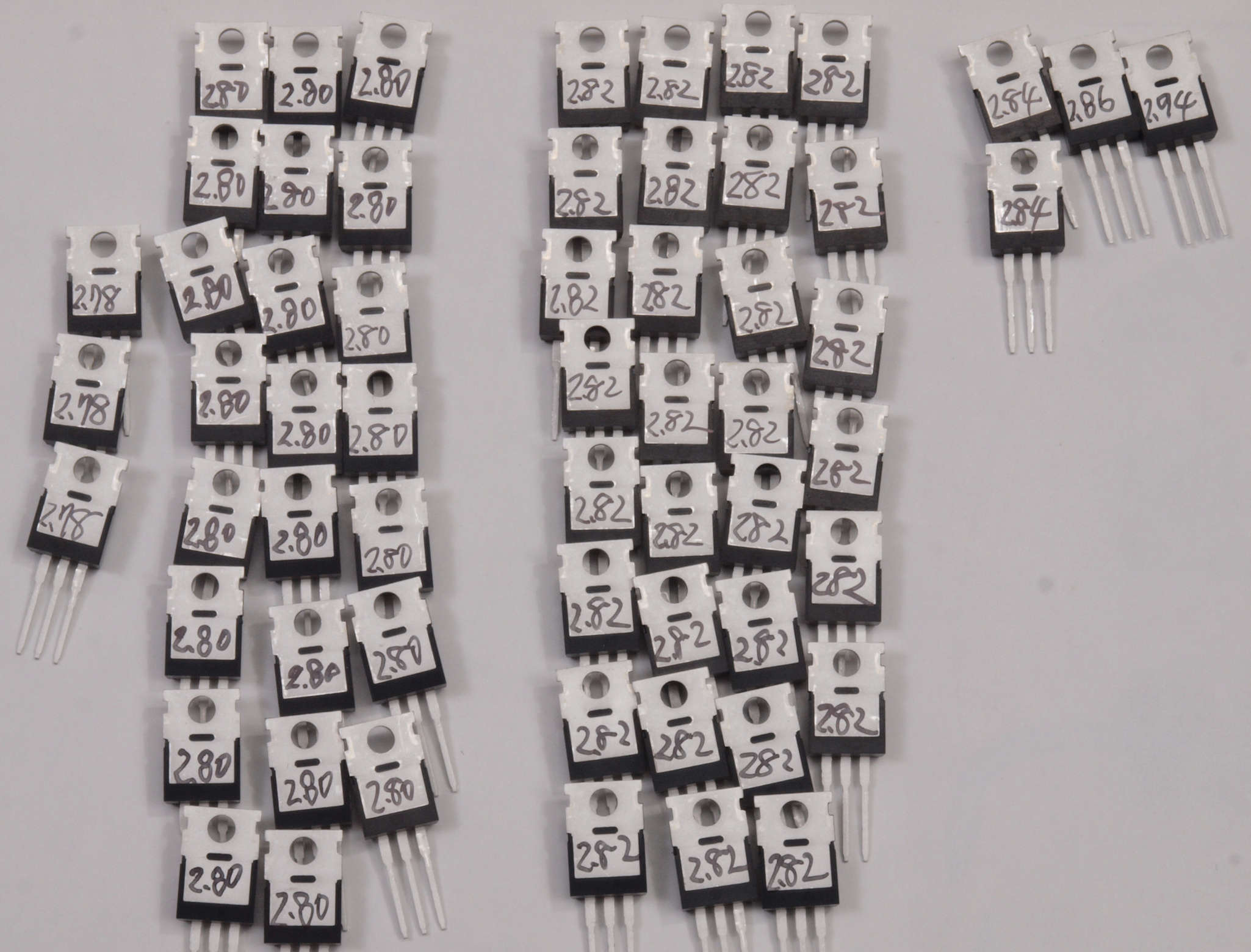 A41. 点検中 購入終段FET(電界効果トランジスター)。 Id=2.5mA時のVgs測定結果。工場出荷の1レーンを購入したので誤差が少ない。
