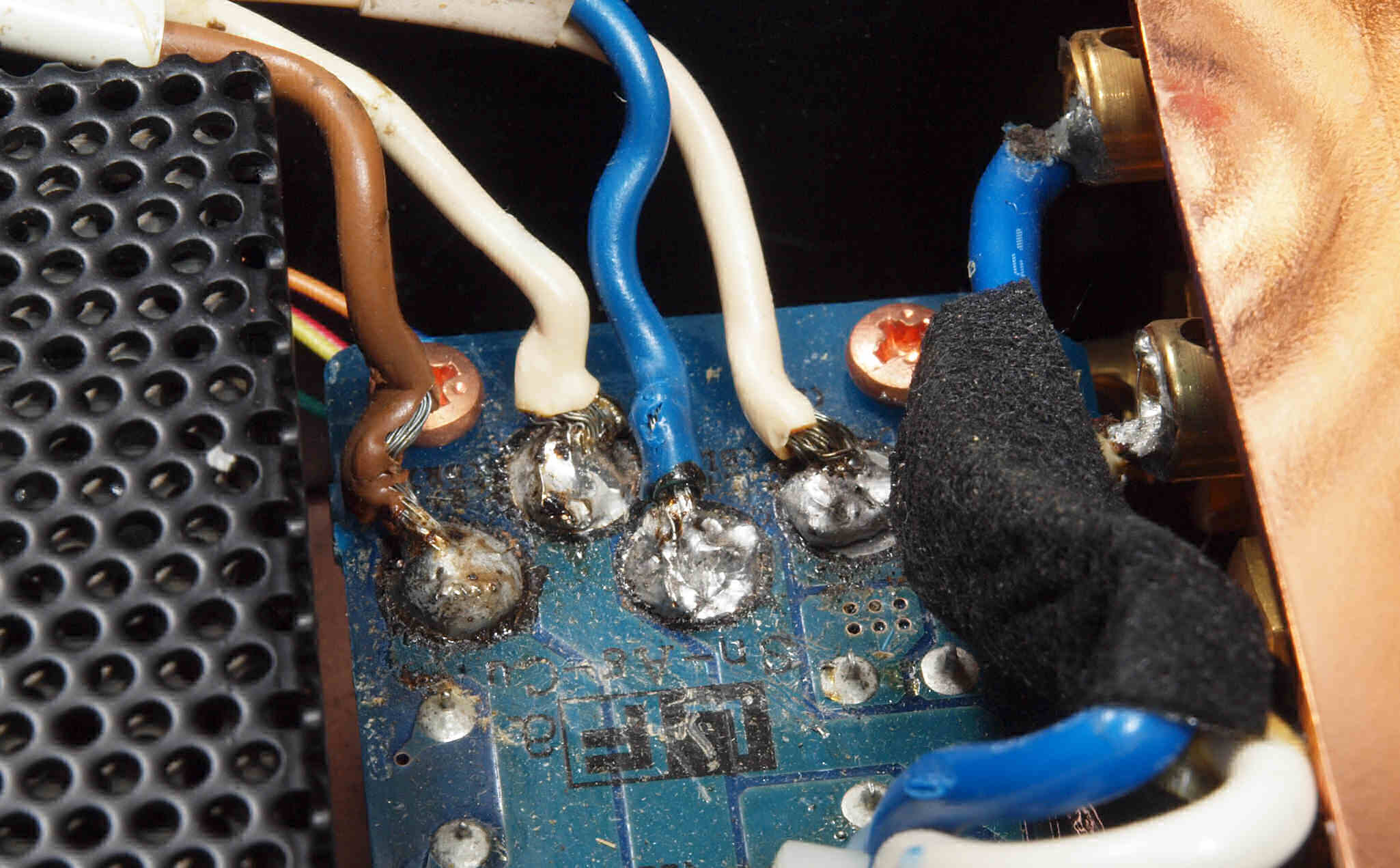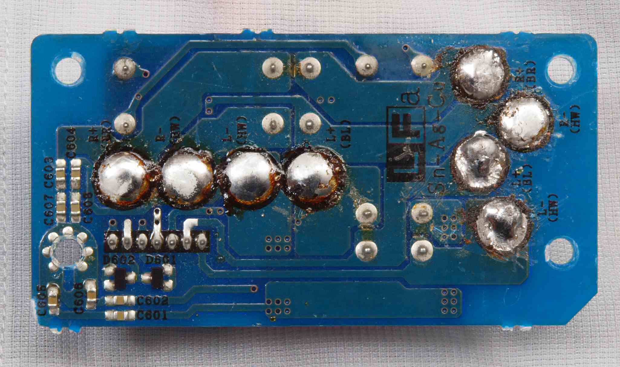 CA2. 修理中 3Pインレット、SP出力接続端子裏。SP接続端子に押され凹んでいる。