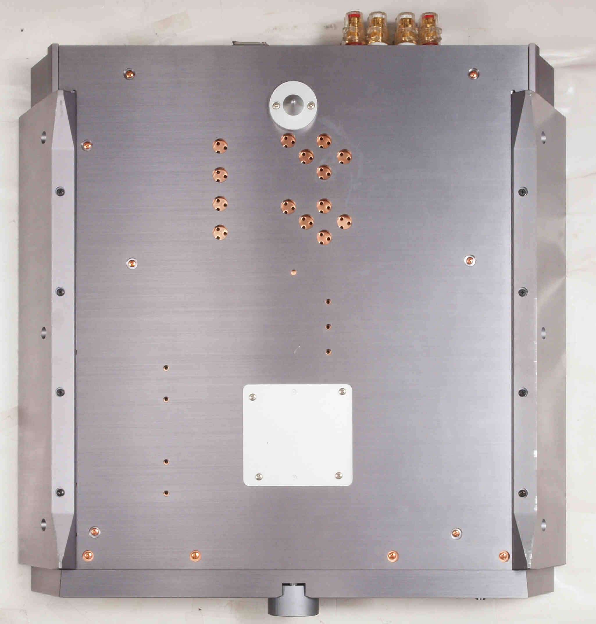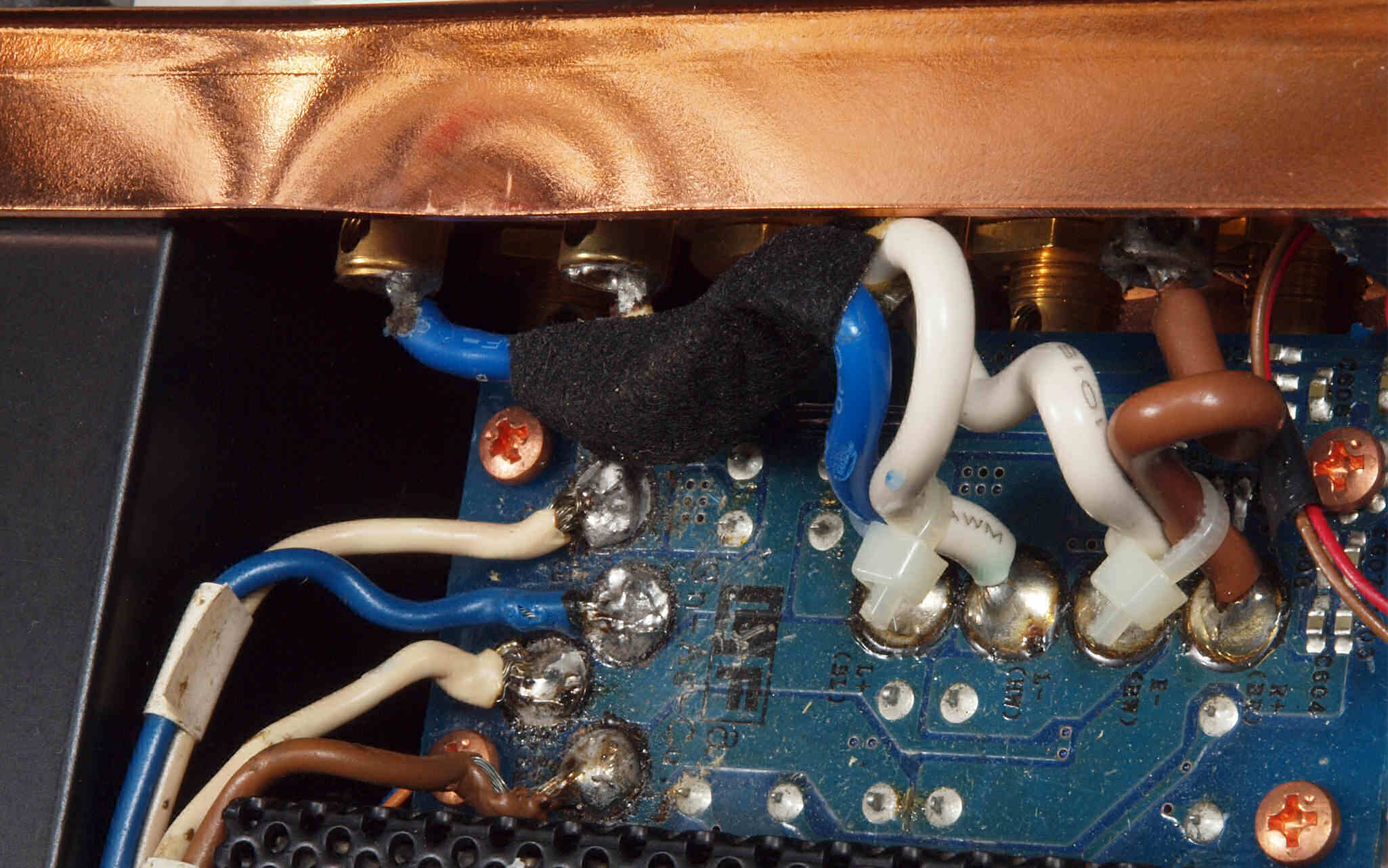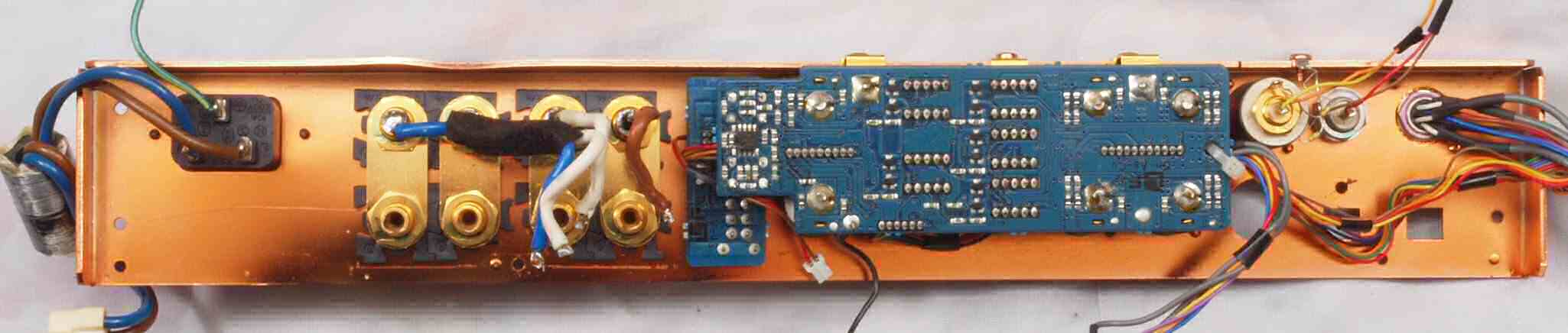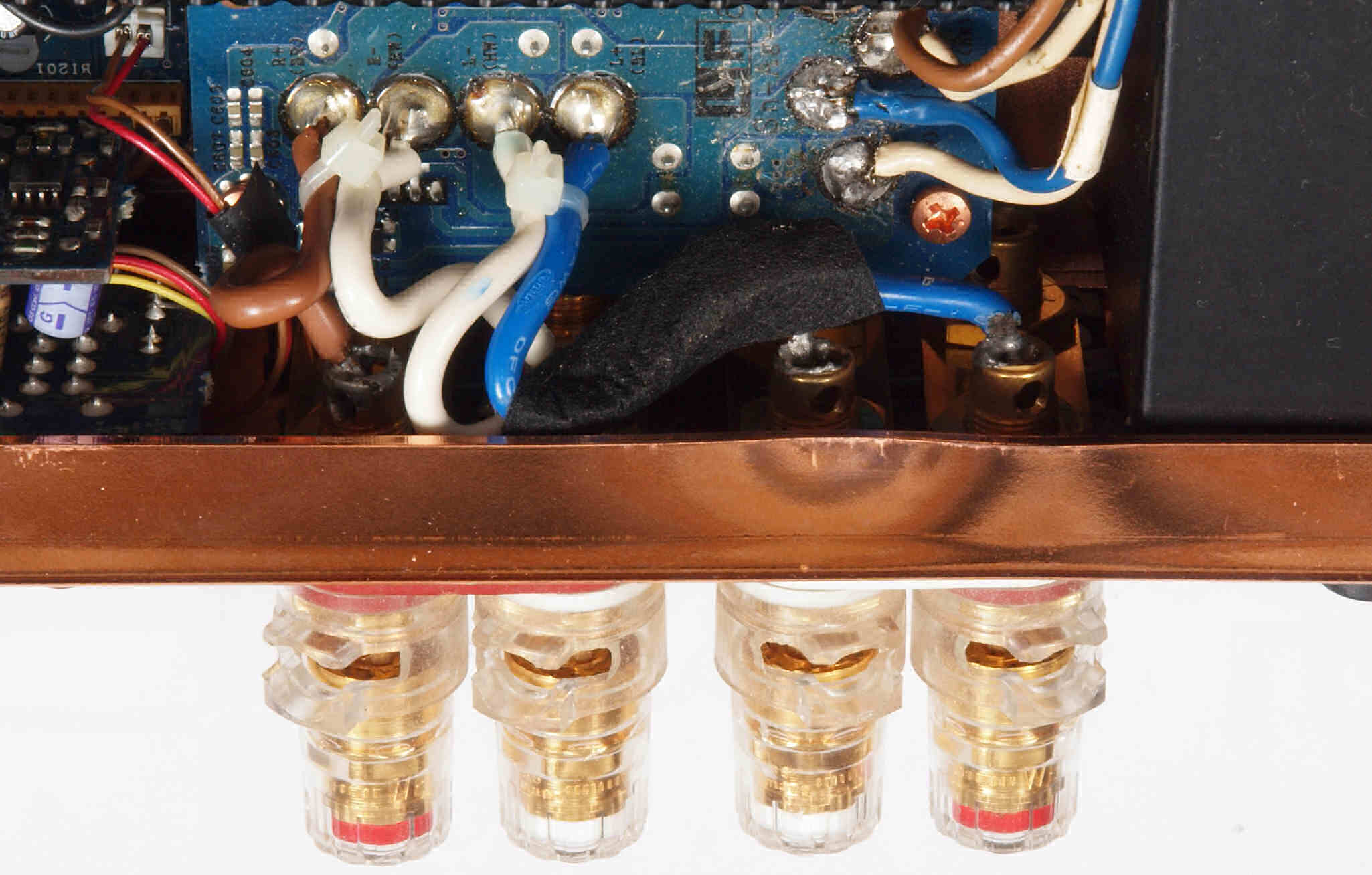 CA5. 修理中 後パネル裏SP出力接続取り付け部。SP接続端子に押され凹んでいる。