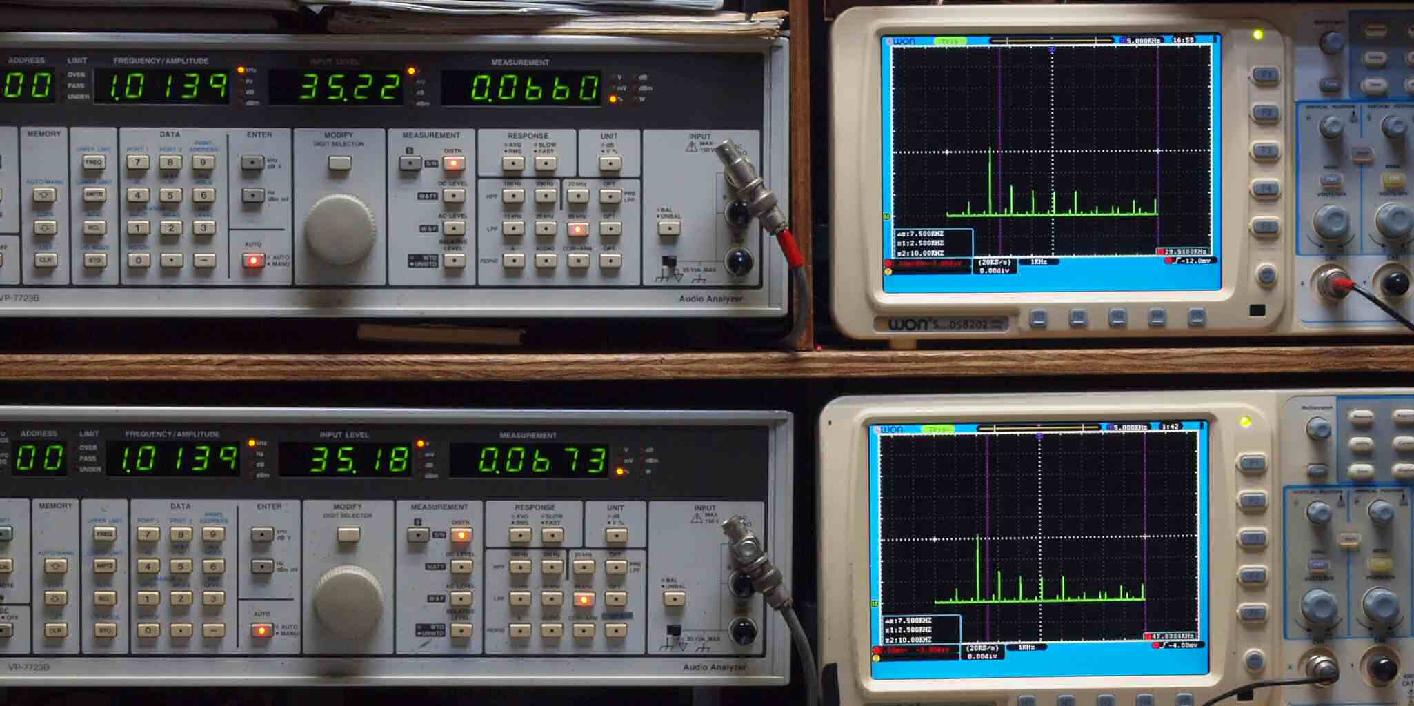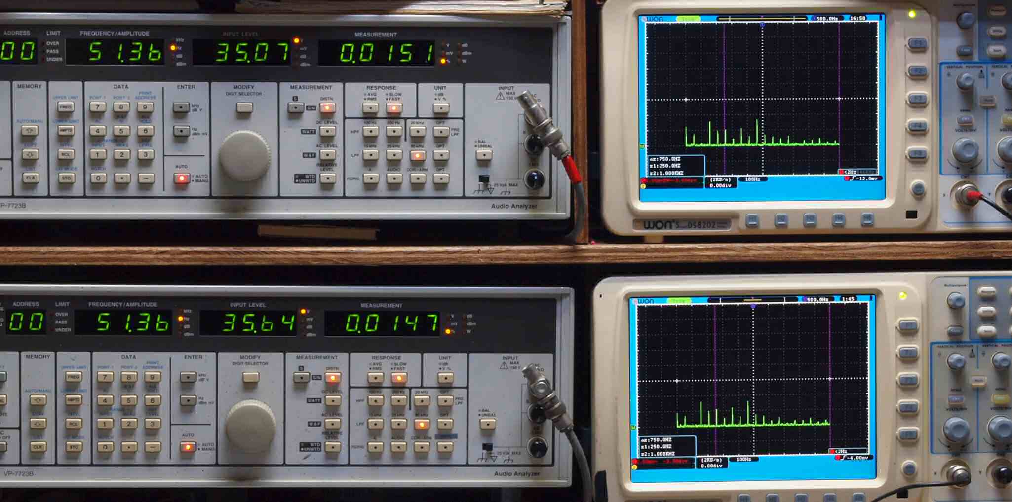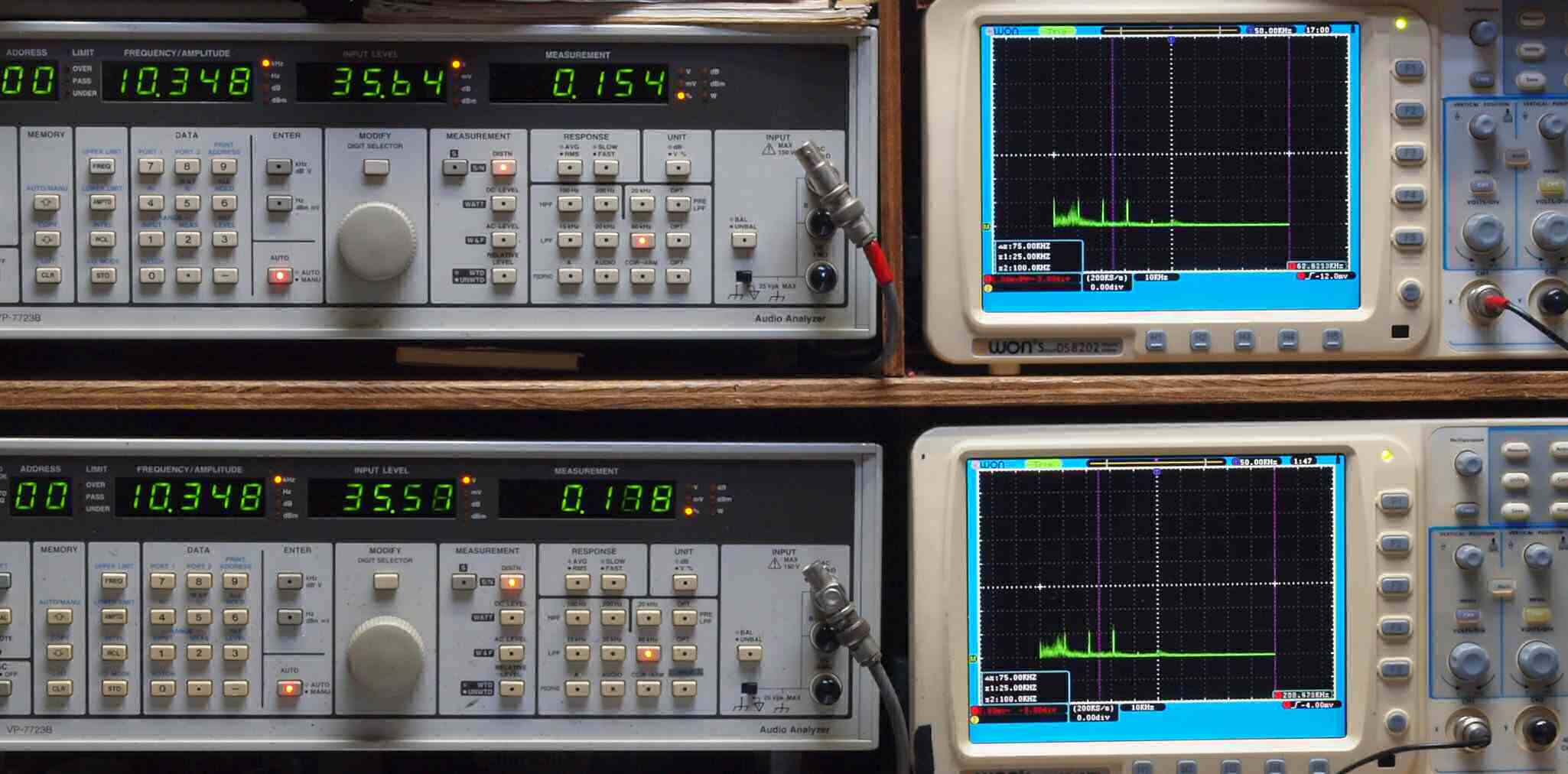 よって、ダイアル設定出力レベルより低くなります。測定機器の仕様や整備の様子はこちら、「VP−7723B」「VP−7201A」。 FFT画面の見方はこちら。