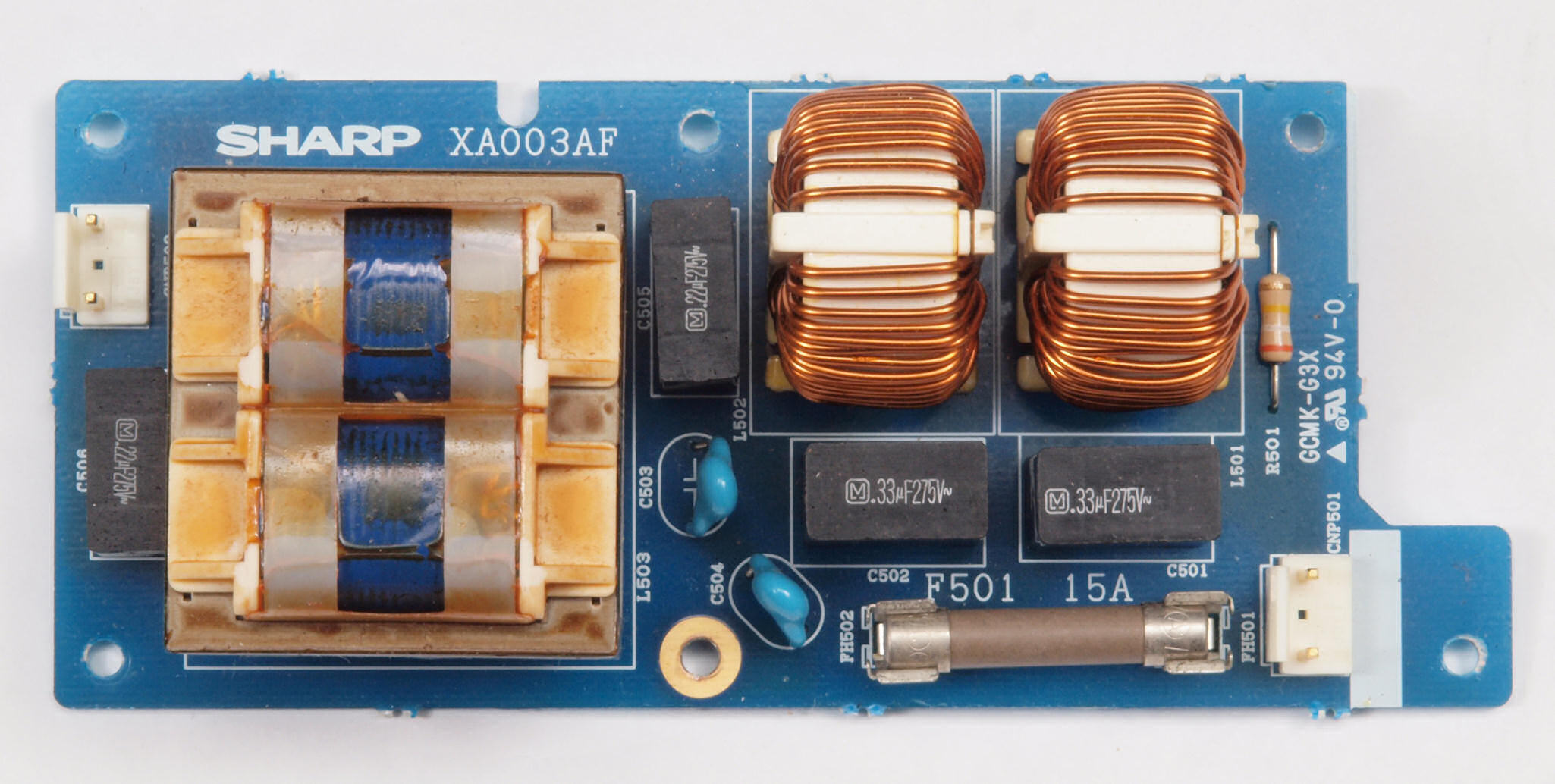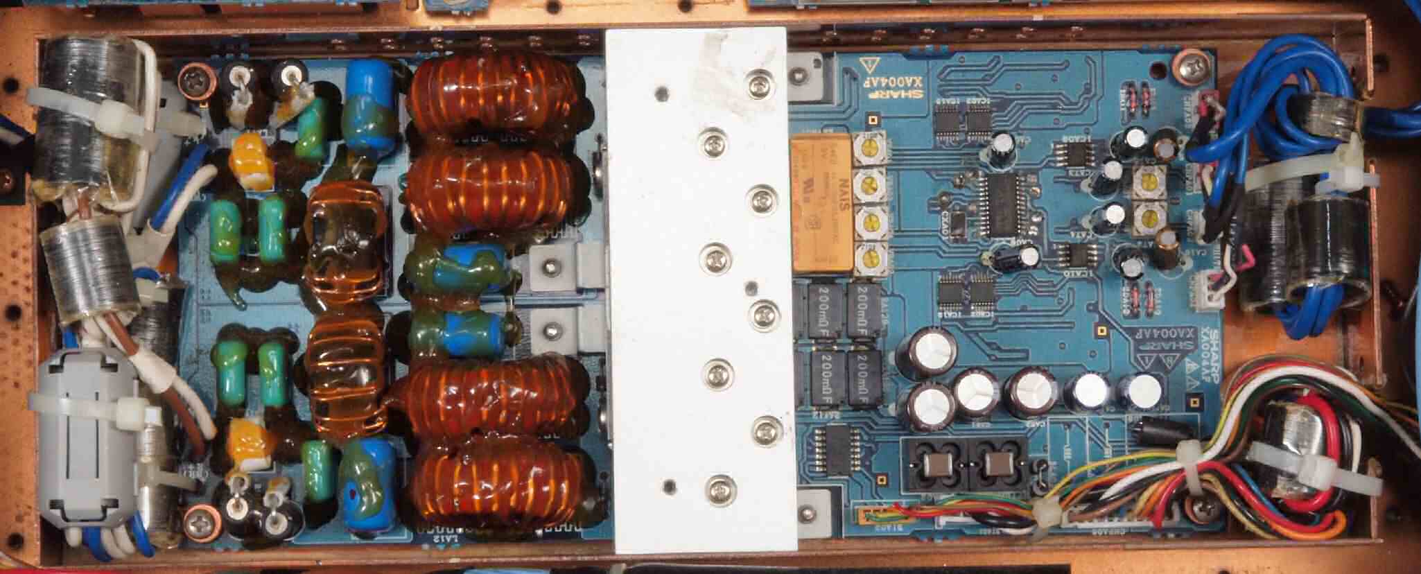 | C51. 修理中 電源フイルター基板。 電源ヒューズは15A、 100V×15A=1.5KVA。 |