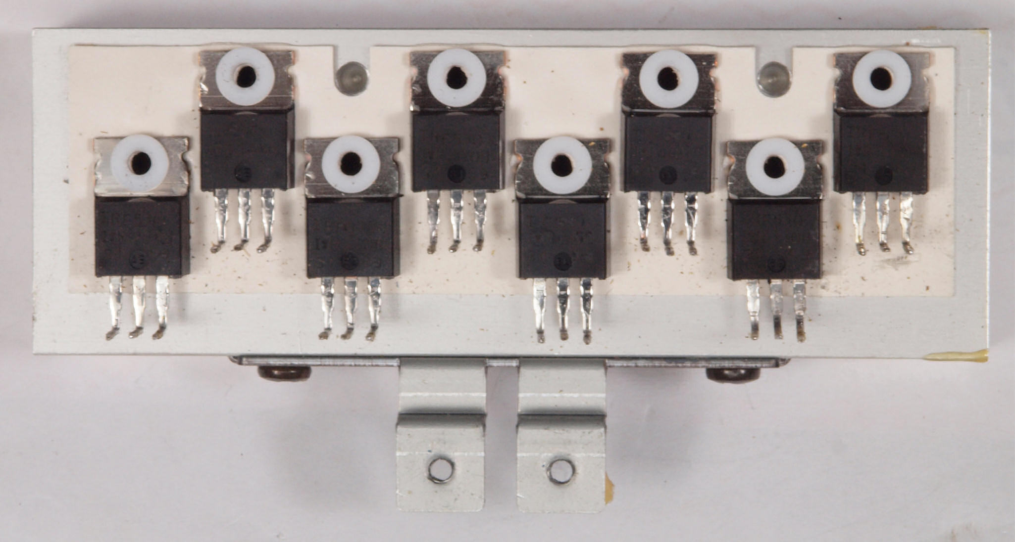 | A43. 点検中 さらにもう1レーン購入した終段FET(電界効果トランジスター)。上の小さい列はドライブIC。 中の黒いのは後発のFET(電界効果トランジスター)。 |