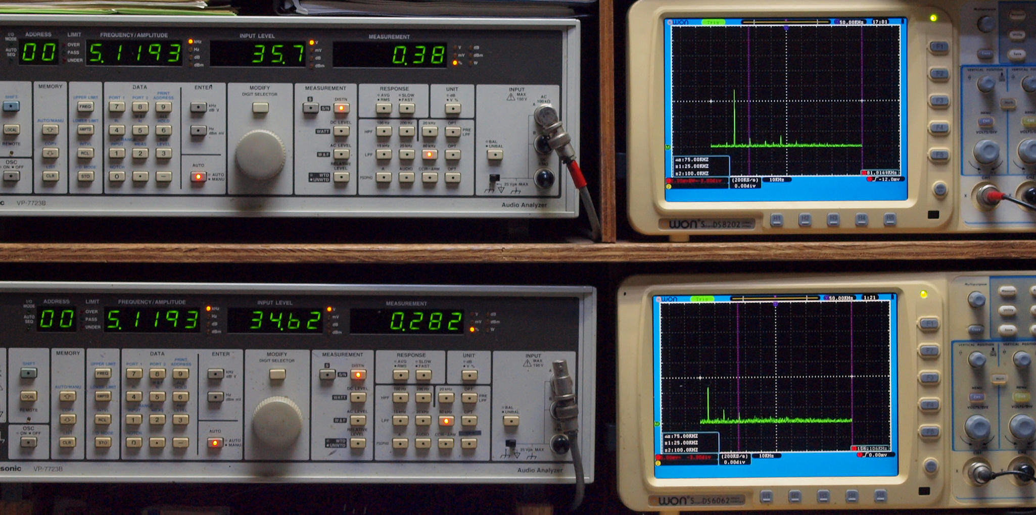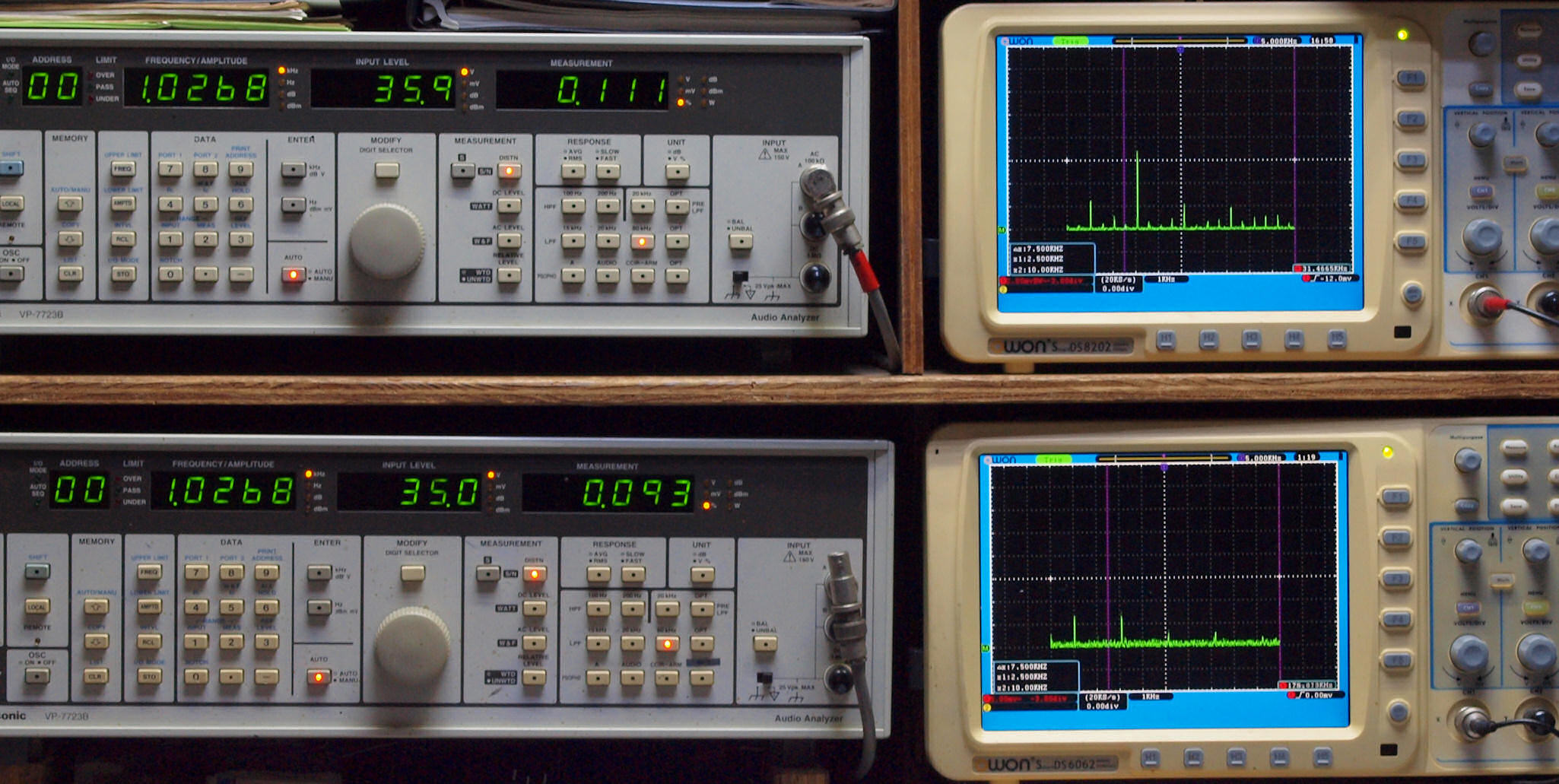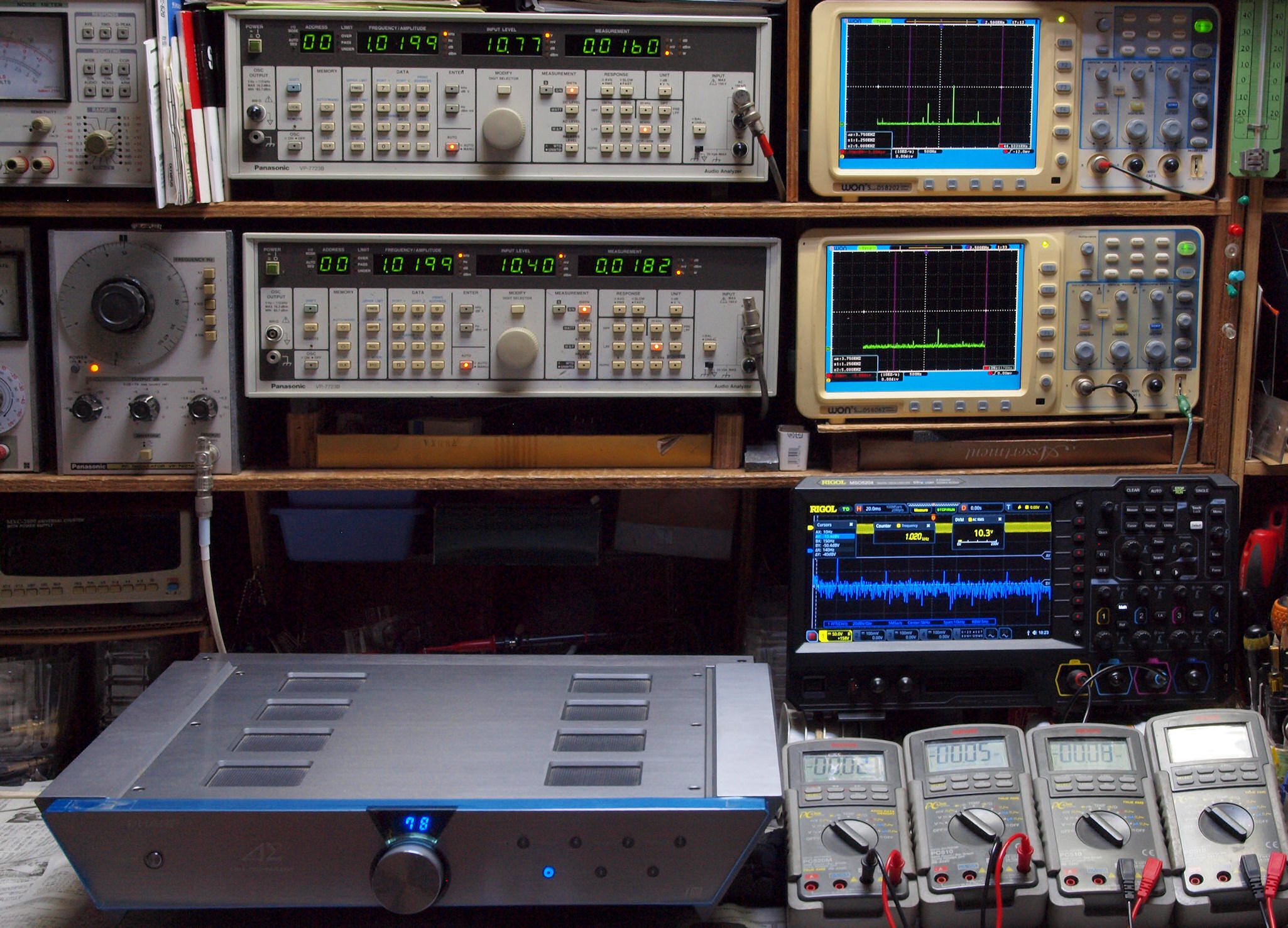 | E. 測定・調整。 画像をクリックすると、大きく(横幅2050ドット)表示されます。 E0. 出力・歪み率測定・調整 「見方」。 上段中 右側SP出力を「Audio Analyzer Panasonic VP−7723B」により測定。 表示LED、 左端=メモリーNo、 中左=周波数測定、 中右=出力電圧測定、 右端=歪み率測定。 上段右端 VP−7723Bの基本波除去出力を「owon SDS8202(200MHZ)」で「FFT分析」表示。 下段中 左側SP出力を「Audio Analyzer Panasonic VP−7723B」により測定。 表示LED、 左端=メモリーNo、 中左=周波数測定、 中右=出力電圧測定、 右端=歪み率測定。 下段右端 VP−7723Bの基本波除去出力を「owon SDS6062(200MHZ)」で「FFT分析」表示。 下段左端 オーディオ発振器 VP−7201A より50Hz〜100kHzの信号を出し(歪み率=約0.003%)、ATT+分配器を通し、AMPに入力。 よって、ダイアル設定出力レベルより低くなります。測定機器の仕様や整備の様子はこちら、「VP−7723B」「VP−7201A」。 FFT画面の見方はこちら。 入出力点検確認。 ライン1のアナログ入力、ライン2のバランス入力 、ライン出力点検確認済み。 デジタルNo1のST入力、デジタルNo2のBNCケーブル入力、デジタルNo3のRCAケーブル入力点検確認済み。 デジタルNo4の光ケーブル入力、デジタルNo5のSACD/1ビット入力(RCA入力)点検確認済み。 80kHz前後にクロック漏れが200mVPP(10mVrms)位あり、80kHzのローパスフイルターを挿入して測定。 仕様では、0.05%(1kHz、1W出力時) |