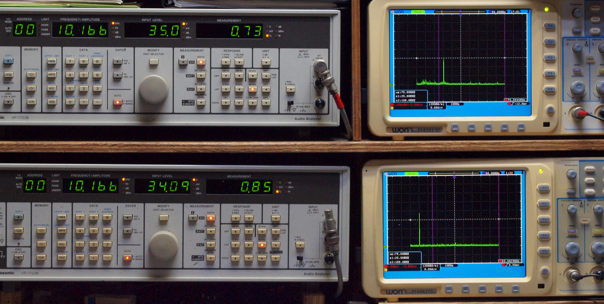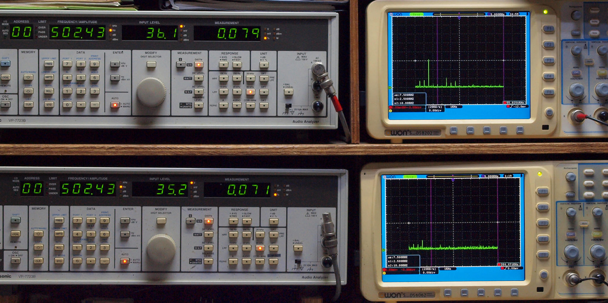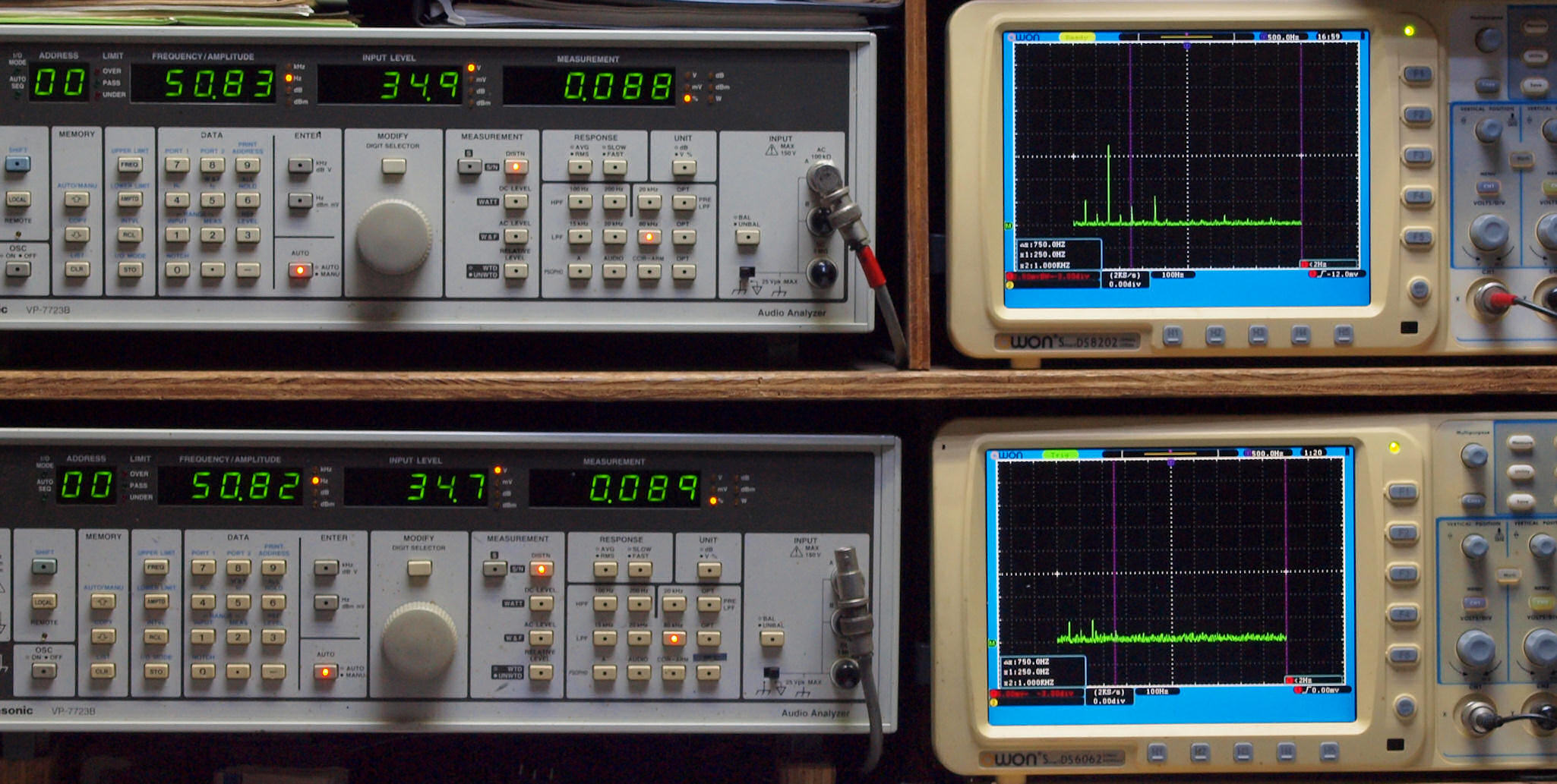 | E. 測定・調整。 画像をクリックすると、大きく(横幅2050ドット)表示されます。 E0. 出力・歪み率測定・調整 「見方」。 上段中 右側SP出力を「Audio Analyzer Panasonic VP−7723B」により測定。 表示LED、 左端=メモリーNo、 中左=周波数測定、 中右=出力電圧測定、 右端=歪み率測定。 上段右端 VP−7723Bの基本波除去出力を「owon SDS8202(200MHZ)」で「FFT分析」表示。 下段中 左側SP出力を「Audio Analyzer Panasonic VP−7723B」により測定。 表示LED、 左端=メモリーNo、 中左=周波数測定、 中右=出力電圧測定、 右端=歪み率測定。 下段右端 VP−7723Bの基本波除去出力を「owon SDS6062(200MHZ)」で「FFT分析」表示。 下段左端 オーディオ発振器 VP−7201A より50Hz〜100kHzの信号を出し(歪み率=約0.003%)、ATT+分配器を通し、AMPに入力。 よって、ダイアル設定出力レベルより低くなります。測定機器の仕様や整備の様子はこちら、「VP−7723B」「VP−7201A」。 FFT画面の見方はこちら。 入出力点検確認。 ライン1のアナログ入力、ライン2のバランス入力 、ライン出力点検確認済み。 デジタルNo1のST入力、デジタルNo2のBNCケーブル入力、デジタルNo3のRCAケーブル入力点検確認済み。 デジタルNo4の光ケーブル入力、デジタルNo5のSACD/1ビット入力(RCA入力)点検確認済み。 80kHz前後にクロック漏れが200mVPP(10mVrms)位あり、80kHzのローパスフイルターを挿入して測定。 仕様では、0.05%(1kHz、1W出力時) |
