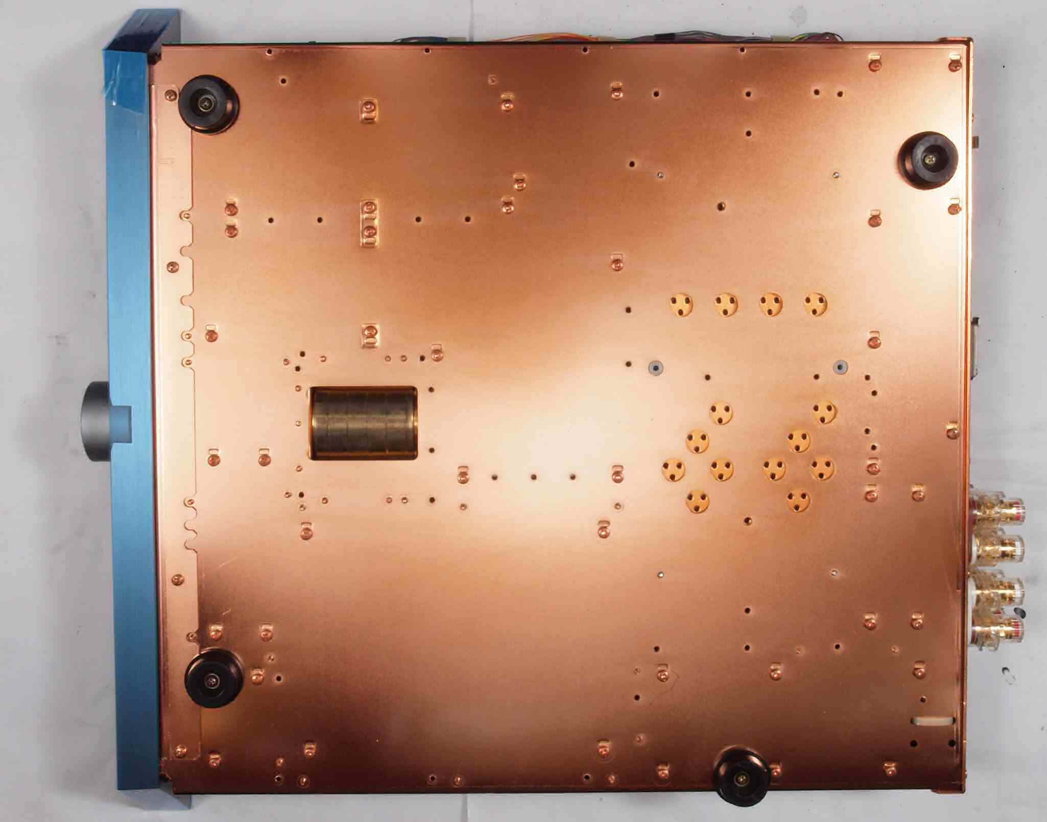 | C02. 修理中 部品・基板を取り去ったシャーシ裏。汚れが酷いので清掃後CRCで拭く。 |