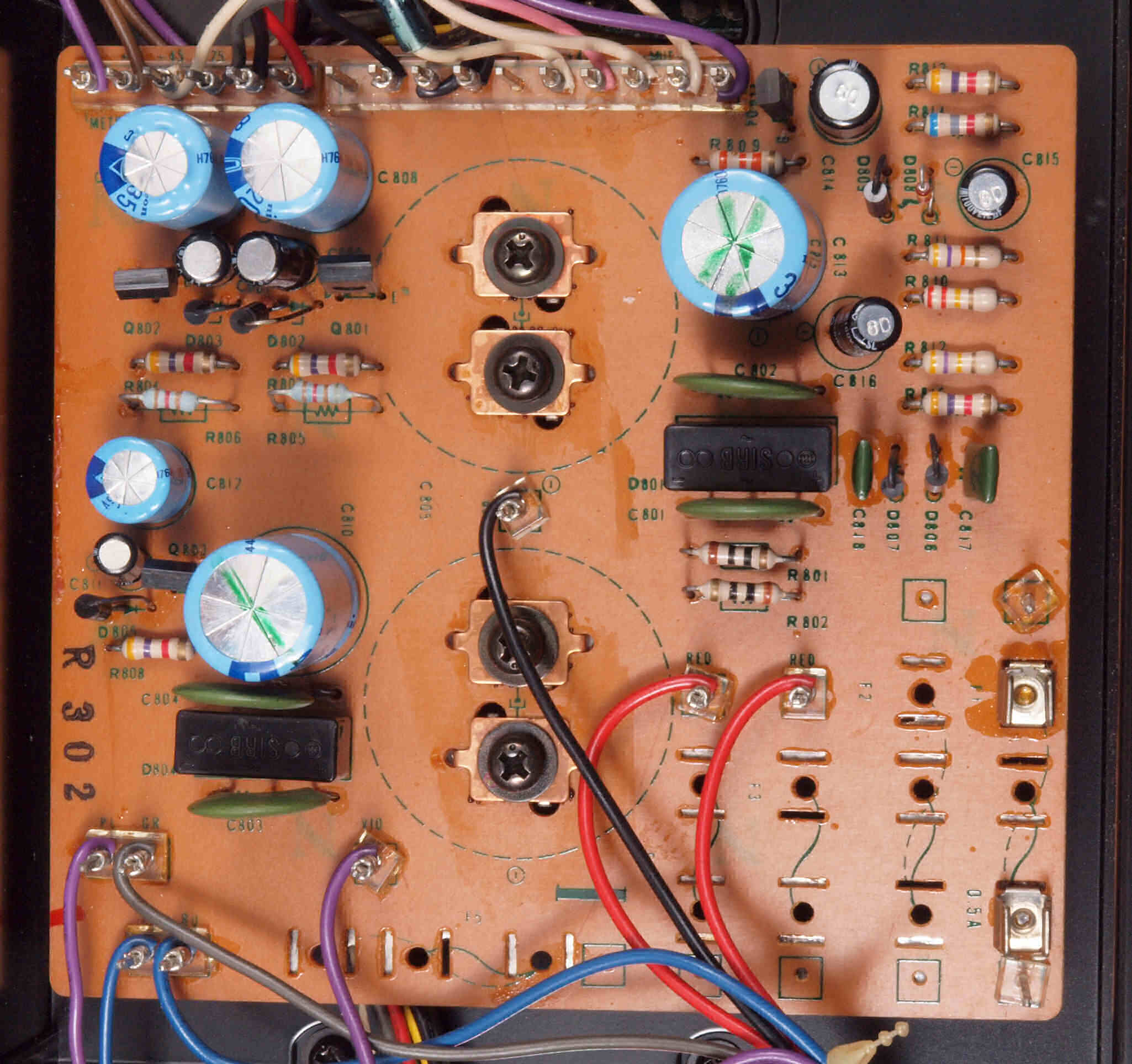 A53. 点検中 入出力RCA端子郡裏。 固定ナイロンピンが溶接固定されている。