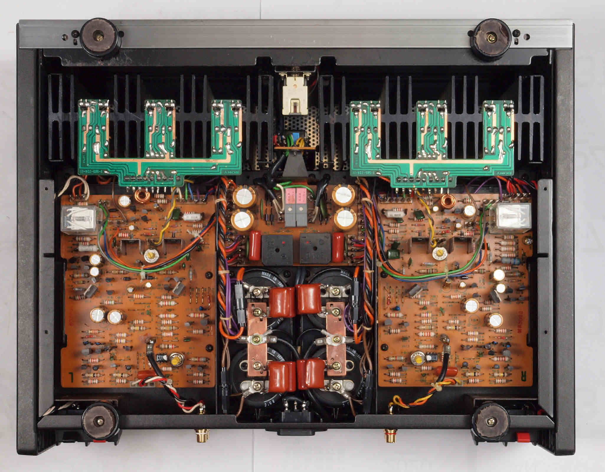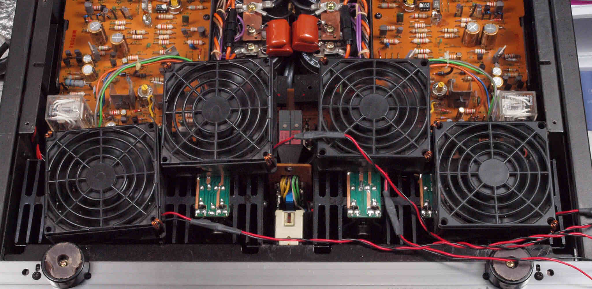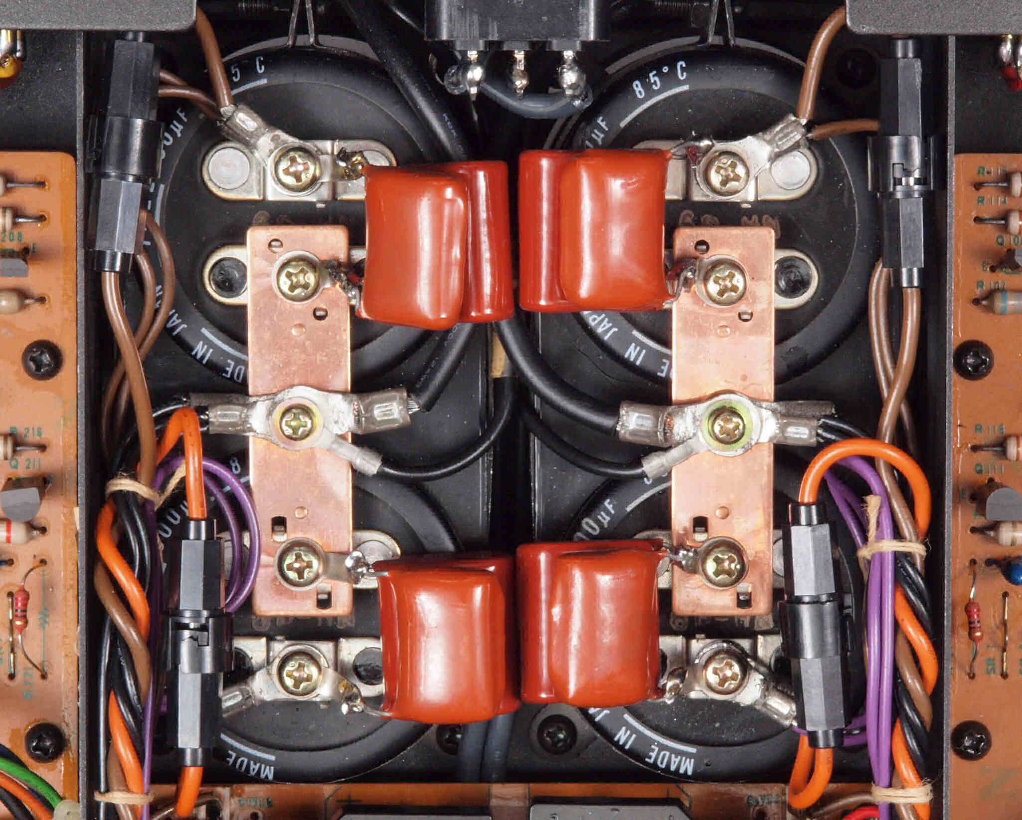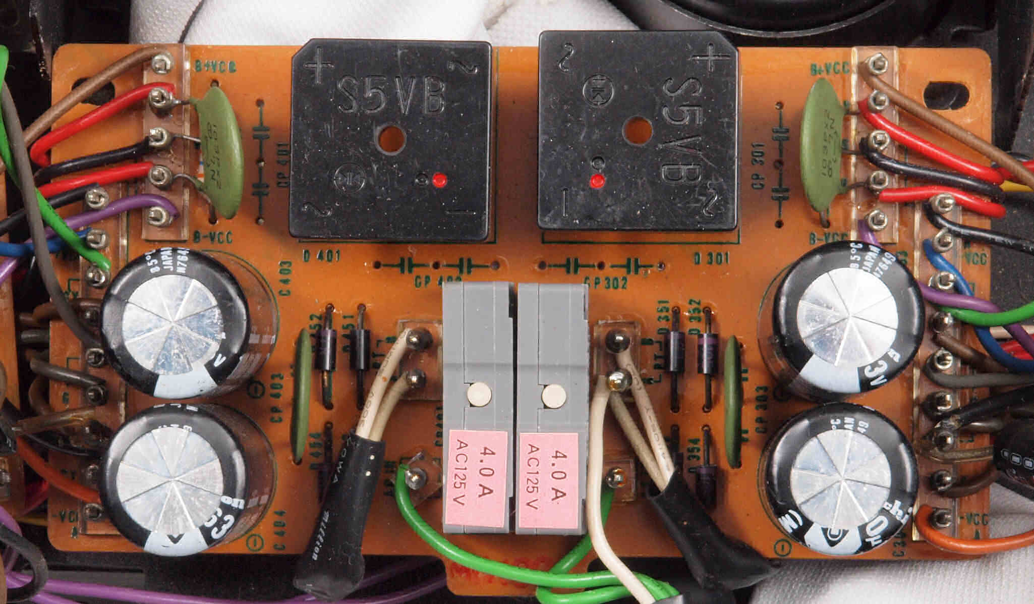 | C92. 修理後 電源ブロック電解コンデンサー下。 フイルムコンデンサー4個追加。終段V−FET(縦型電解効果トランジスター)保護ヒューズ4本挿入。 |