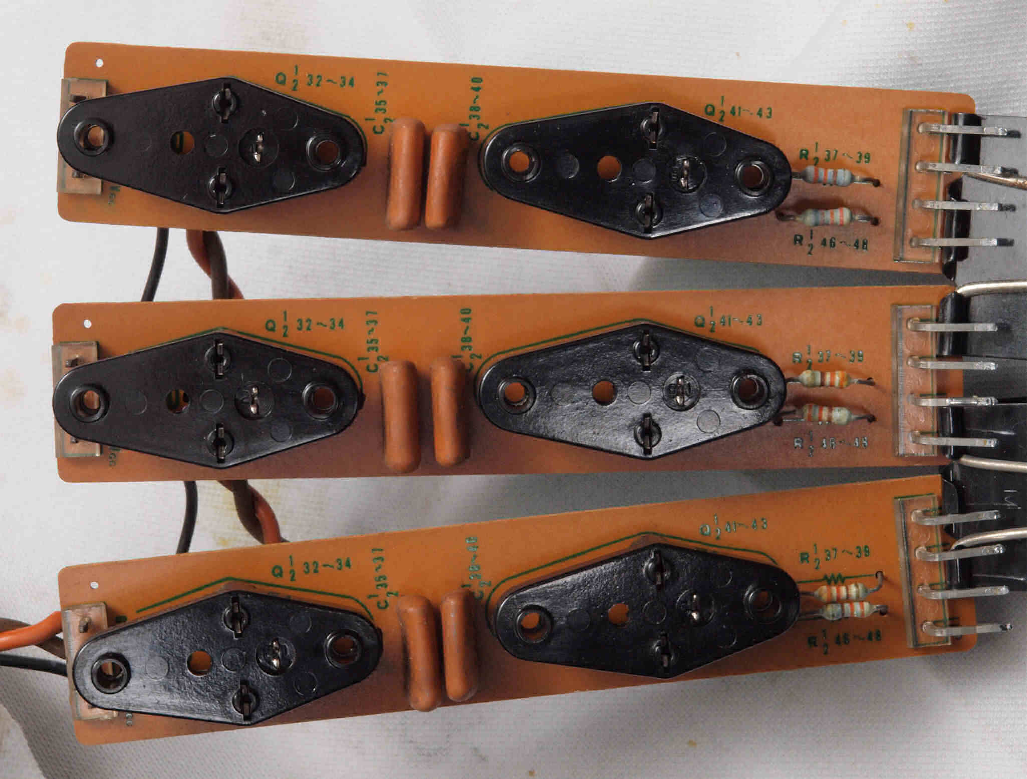| C55. 修理中 L側終段V-FET(縦型電解効果トランジスター)基板。 ヒューズ抵抗6本交換。 | ||||||||||||||||||||||||||||||||||