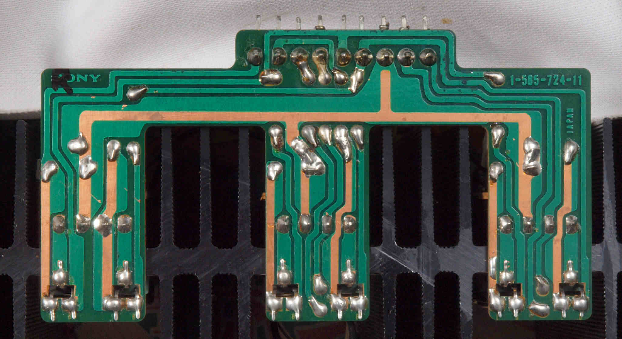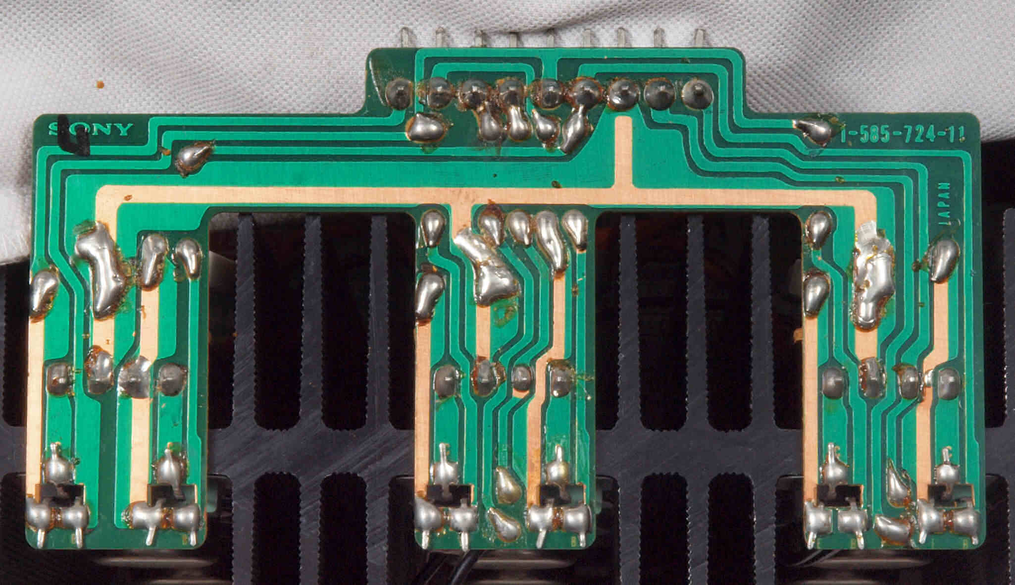 | C22. 修理(半田補正)後 R側終段V-FET(縦型電解効果トランジスター)基板裏 半田を全部やり直す。 | ||||||||||||||||||||||||||||||||||