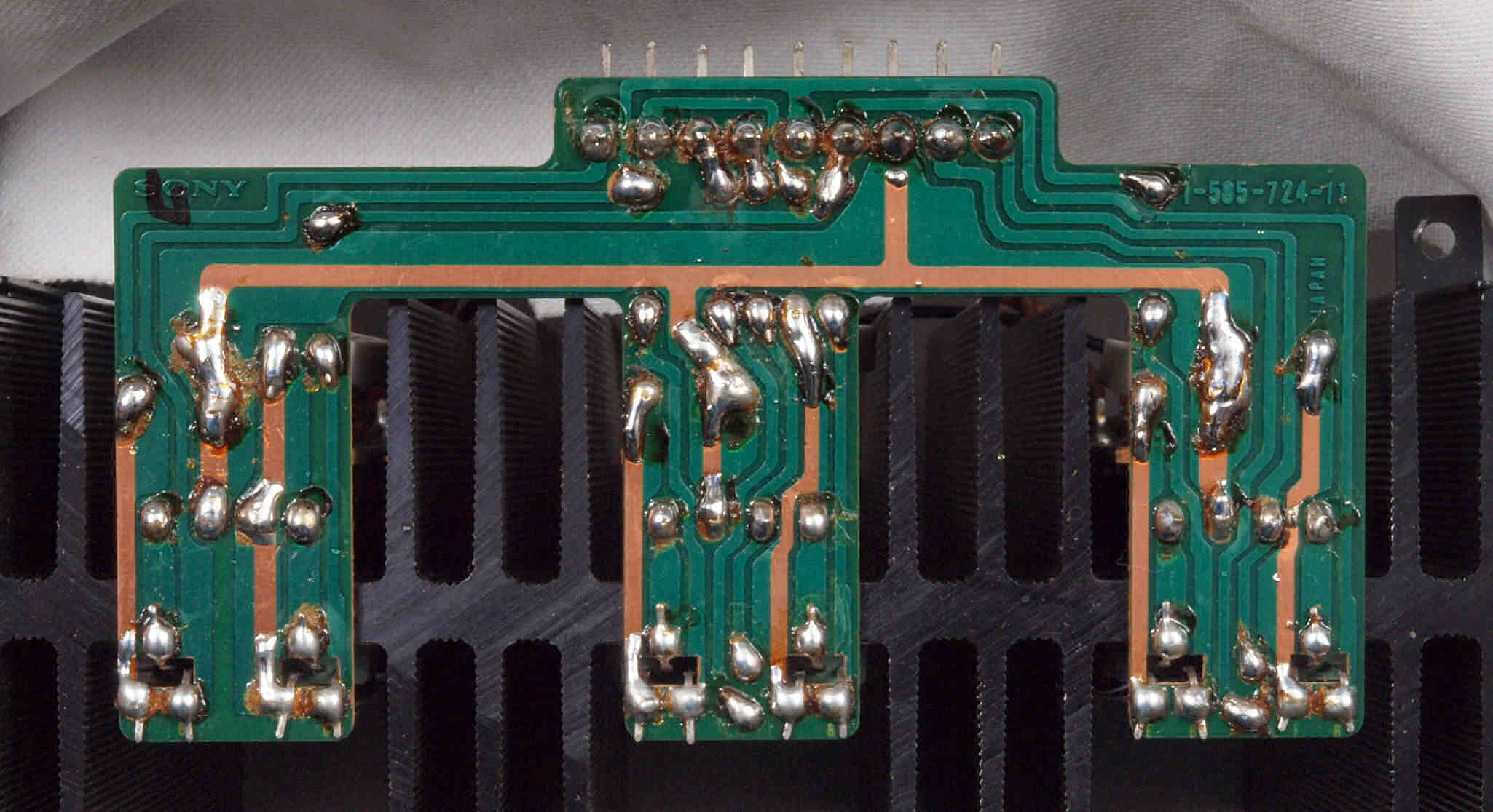 | C63. 修理(半田補正)後 L側終段V-FET(縦型電解効果トランジスター)基板2裏 半田を全部やり直す | ||||||||||||||||||||||||||||||||||