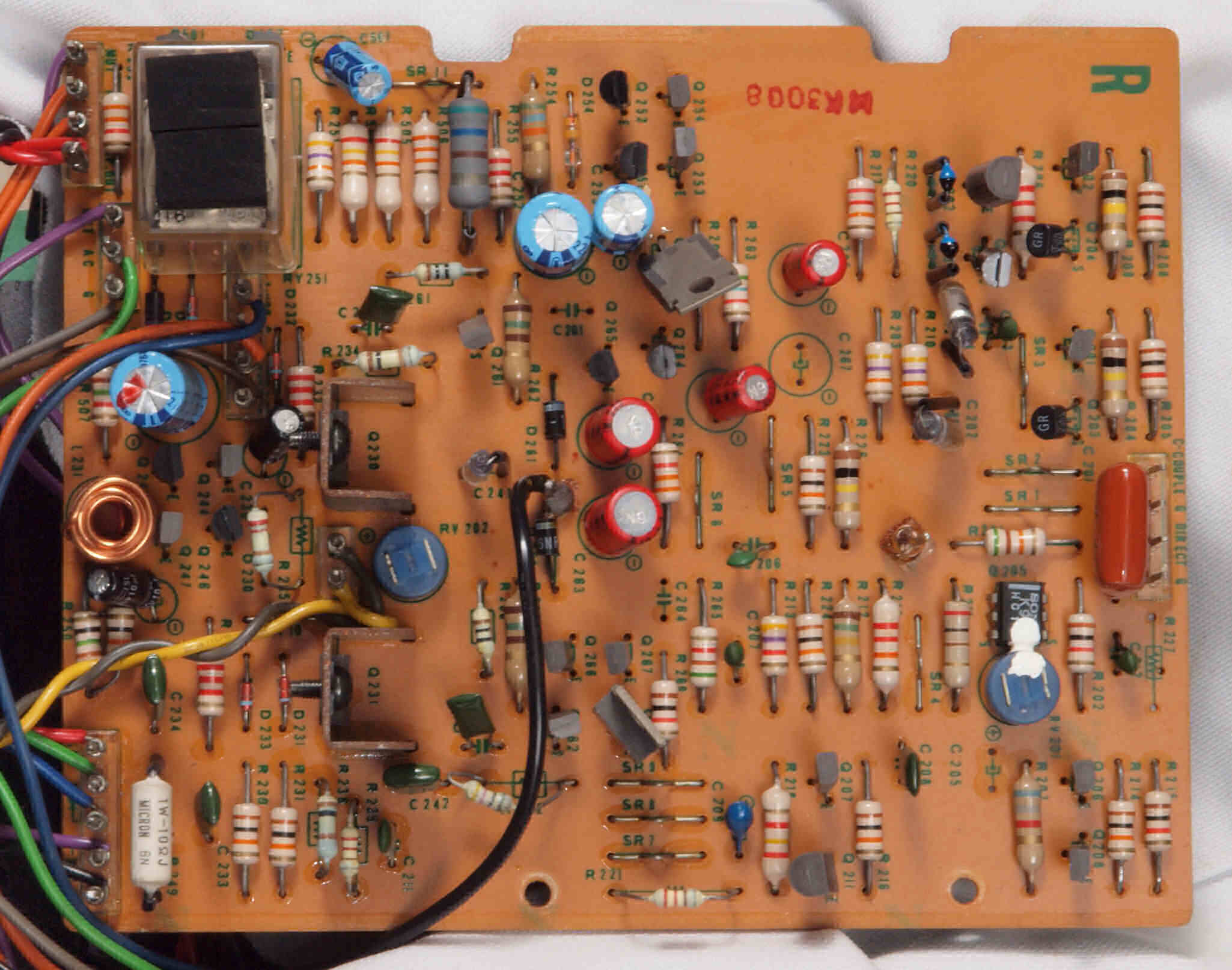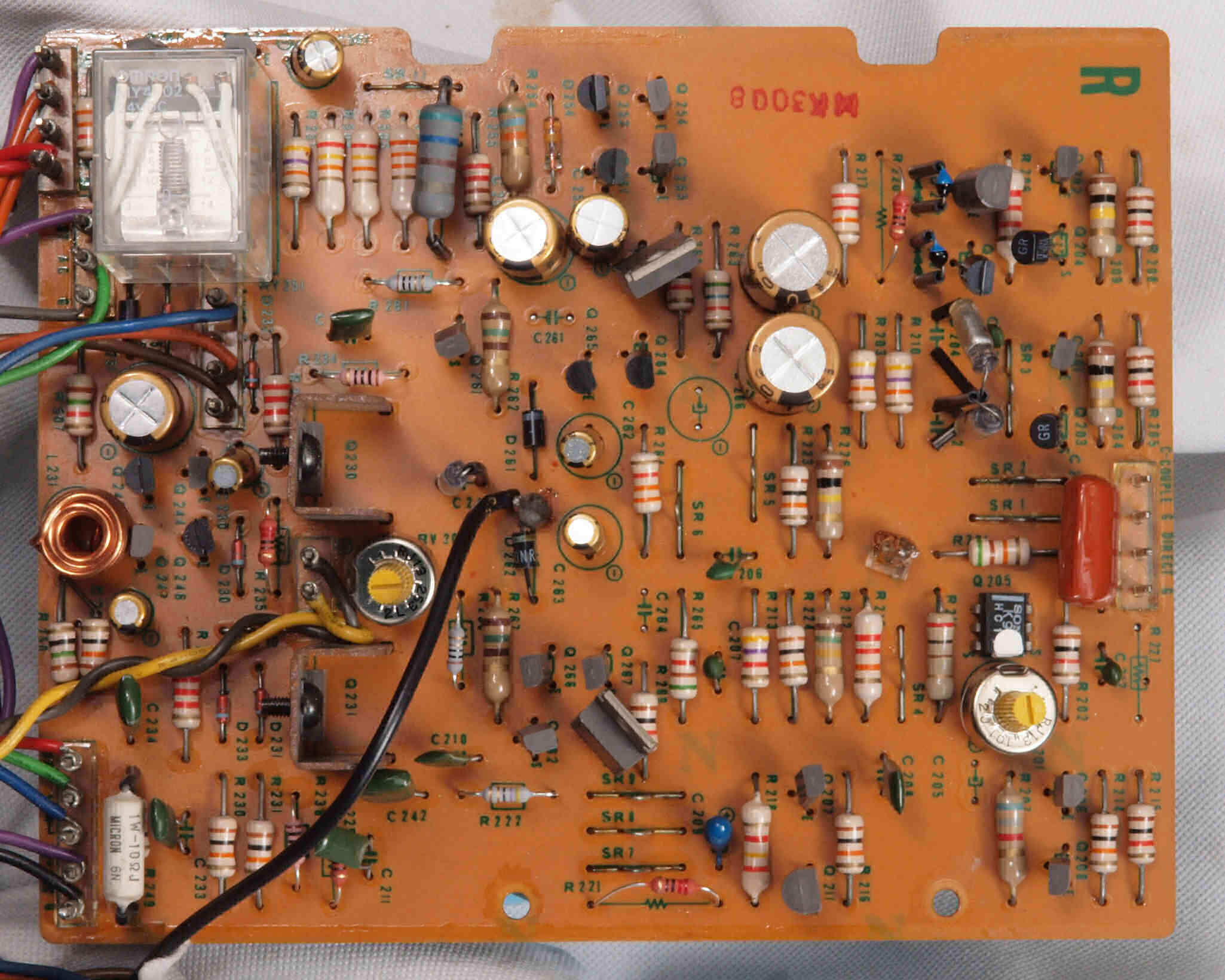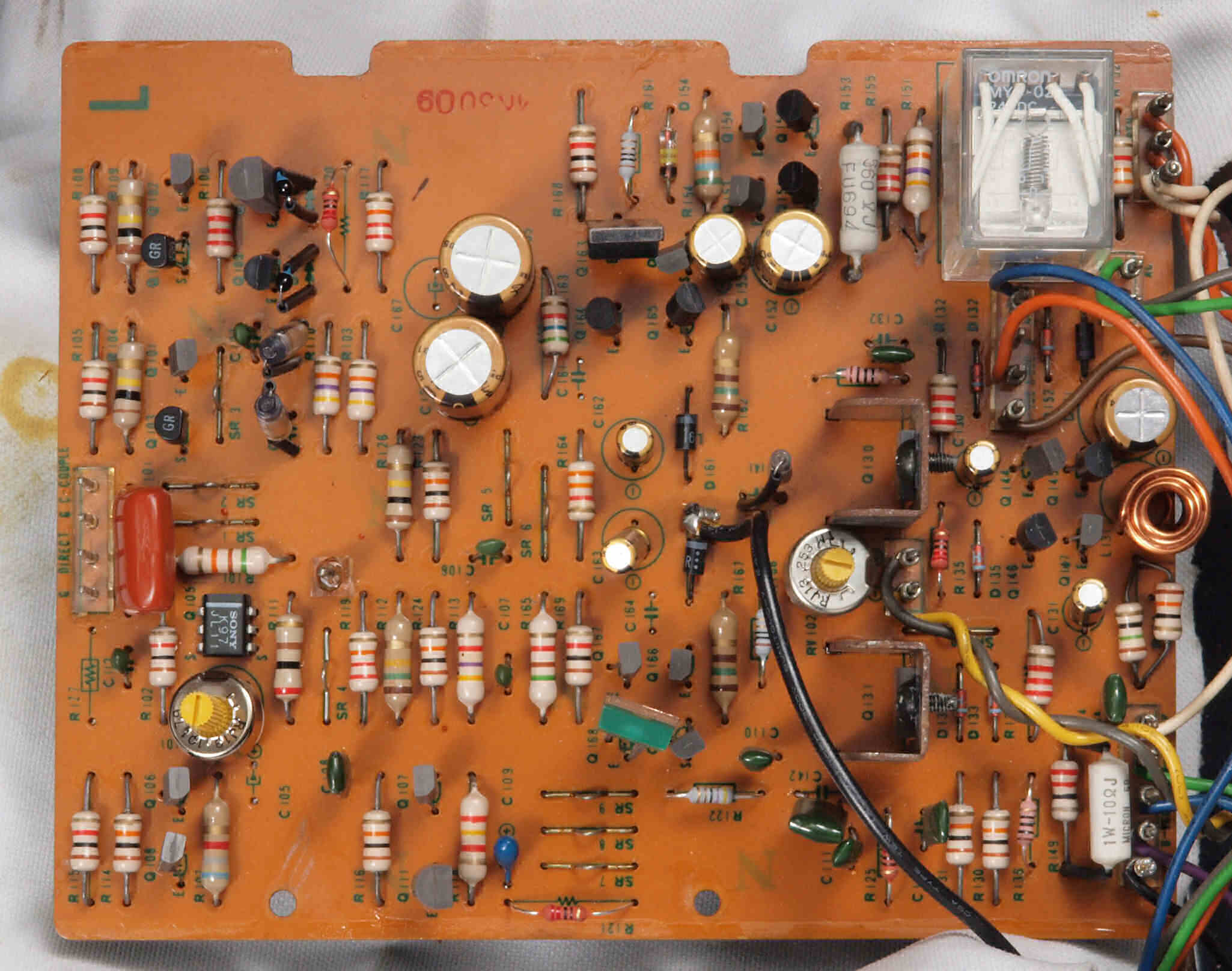 | C72. 修理後 R側アンプ基板。 リレー1個、TR(トランジスター)4個、半固定VR2個、電解コンデンサー10個交換。 | ||||||||||||||||||||||||||||||||||
