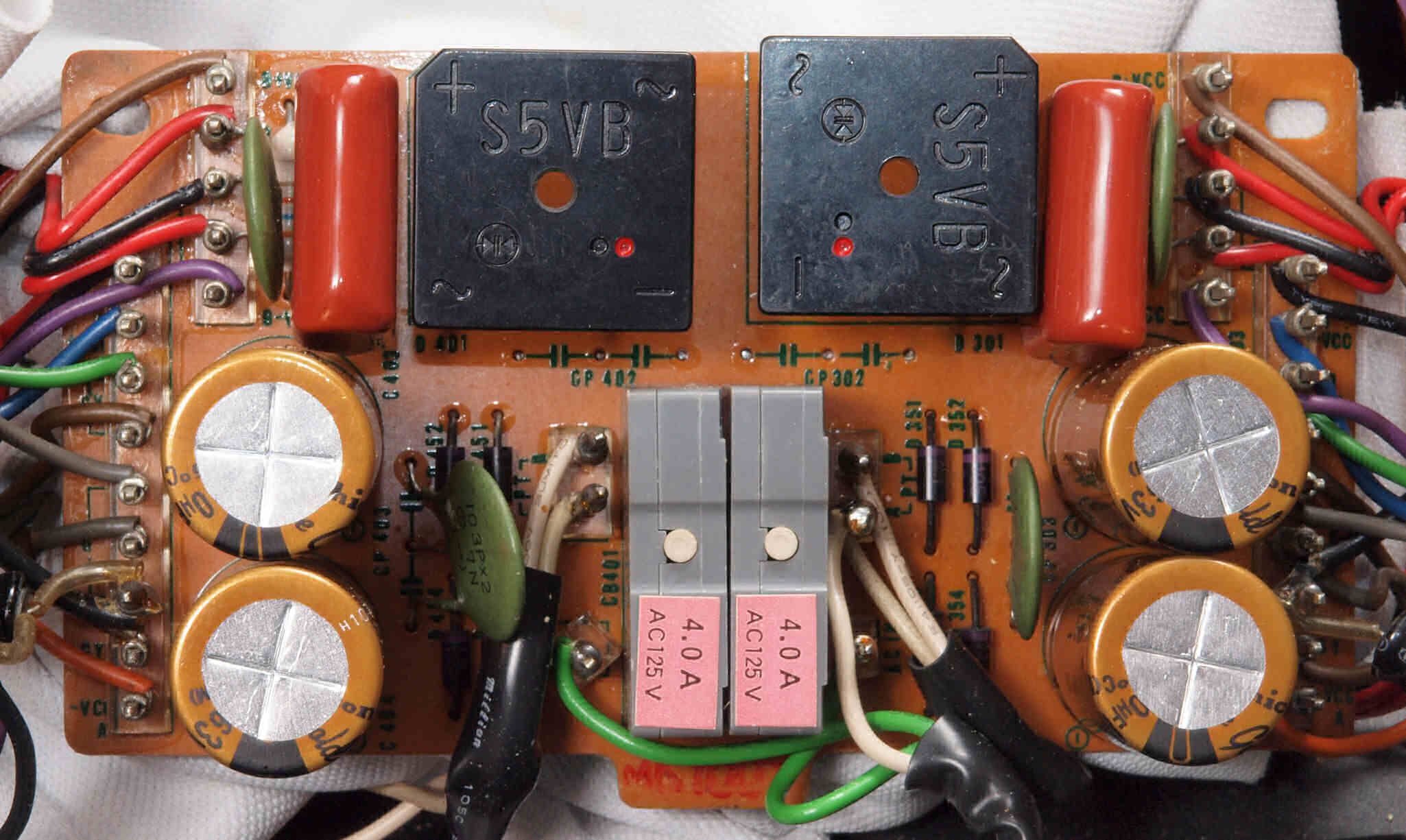 | CA2. 修理後 電源整流基板。 電解コンデンサー4個交換、 フイルムコンデンサー2個追加。 | ||||||||||||||||||||||||||||||||||