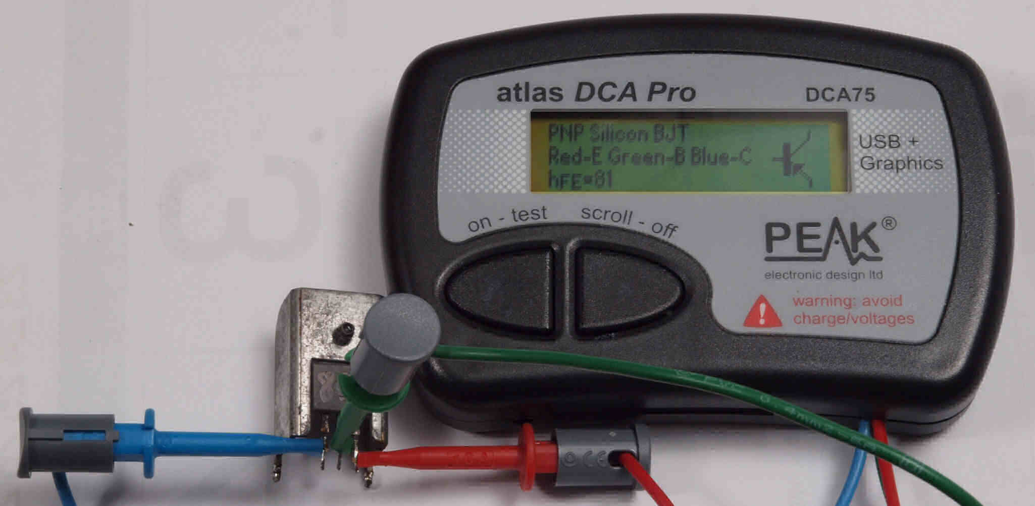 | T. ドライブTR(トランジスター) Sony 2SA835 を測定。 このTR(トランジスター)は現在の亥製品と足の並びが異なり、かつ放熱器付きなので、交換しにくい T1. 半導体アナライザ DCA75 Peak Electronic Design Limited. で測定。 hFE=81で問題無。 |