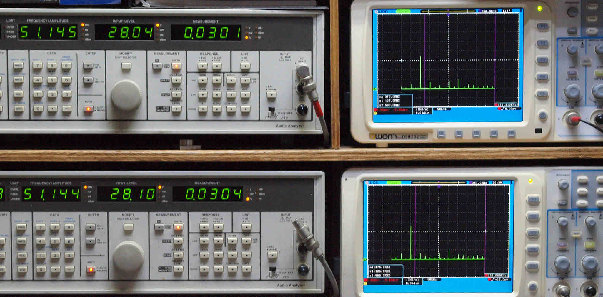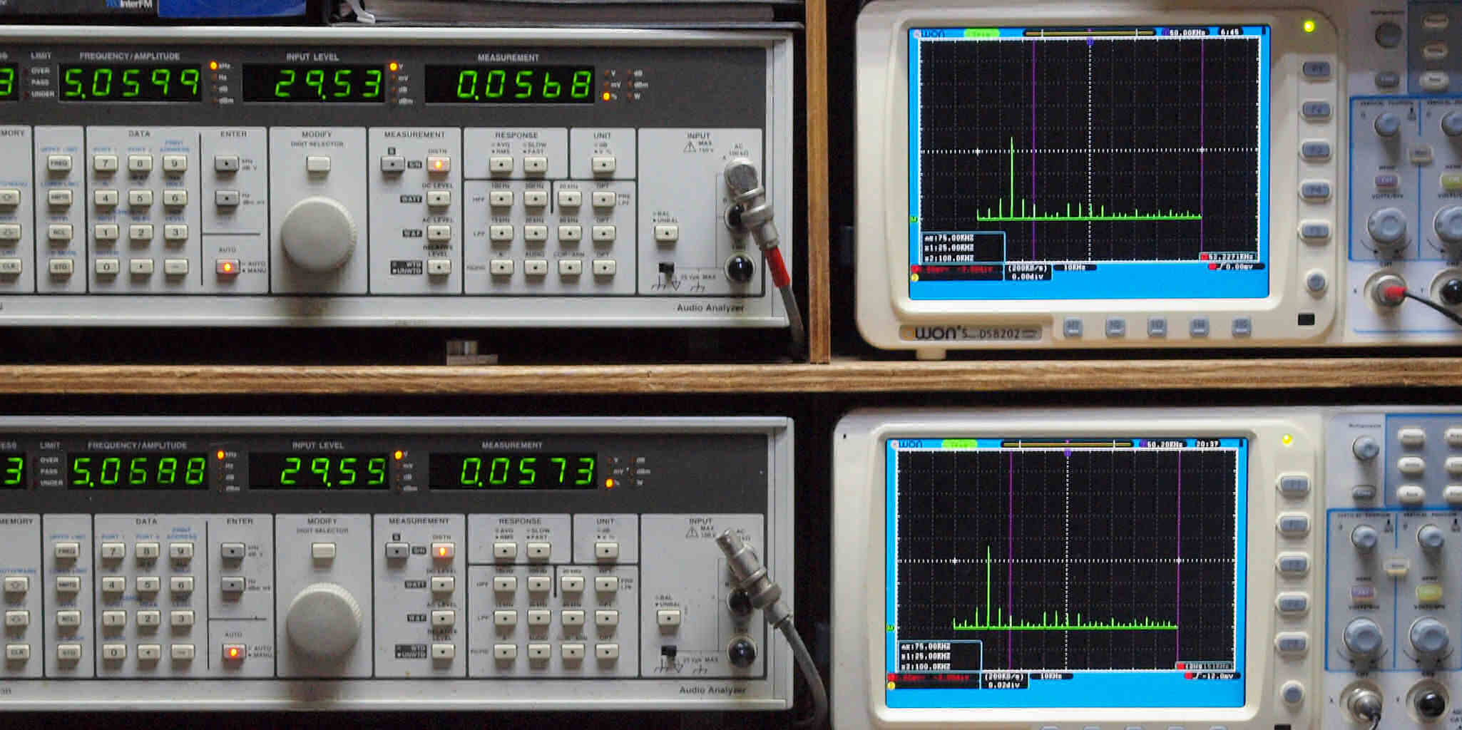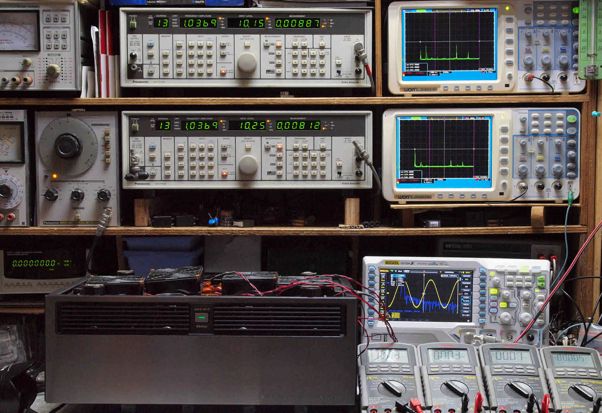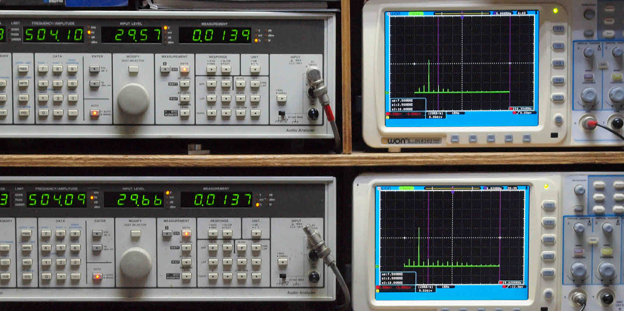 | E. 調整・測定。 画像をクリックすると、大きく(横幅2050ドット)表示されます。 E0. 出力・歪み率測定・調整 「見方」。 上段中 右側SP出力を「Audio Analyzer Panasonic VP−7723B」により測定。 表示LED、 左端=メモリーNo、 中左=周波数測定、 中右=出力電圧測定、 右端=歪み率測定。 上段右端 VP−7723Bの基本波除去出力を「owon SDS8202(200MHZ)」で「FFT分析」表示。 下段中 左側SP出力を「Audio Analyzer Panasonic VP−7723B」により測定。 表示LED、 左端=メモリーNo、 中左=周波数測定、 中右=出力電圧測定、 右端=歪み率測定。 下段右端 VP−7723Bの基本波除去出力を「owon SDS6062(200MHZ)」で「FFT分析」表示。 下段左端 オーディオ発振器 VP−7201A より50Hz〜100kHzの信号を出し(歪み率=約0.003%)、 ATT+分配器を通し、AMPに入力。 よって、ダイアル設定出力レベルより低くなります。測定機器の仕様や整備の様子はこちら、「VP−7723B」 「VP−7201A」。 FFT画面の見方はこちら。 |