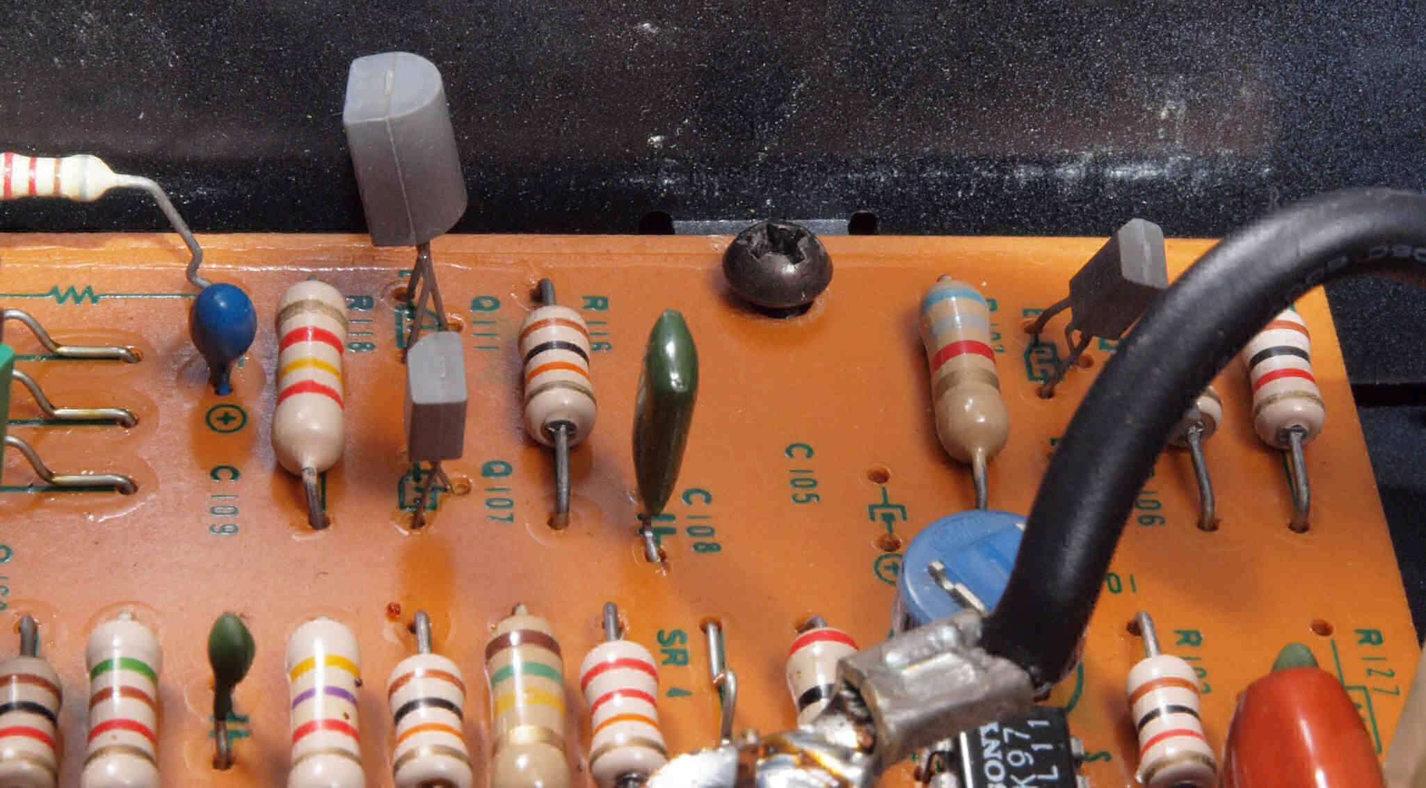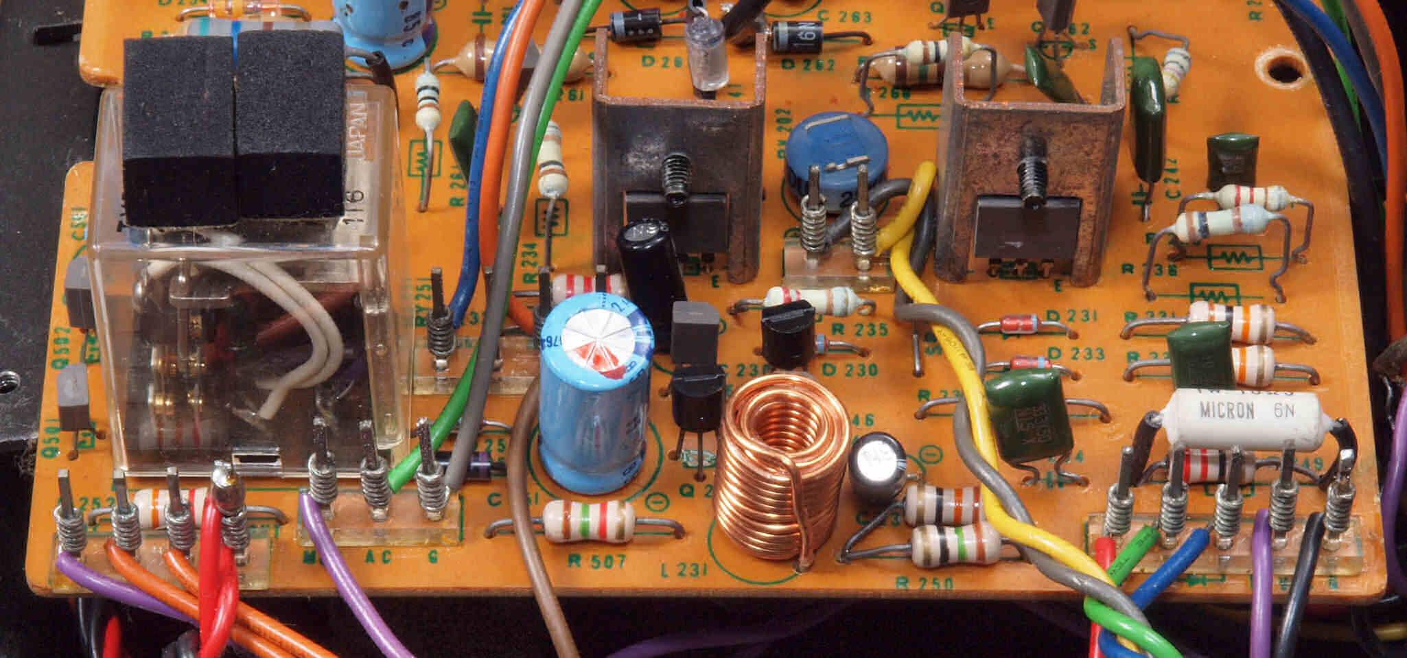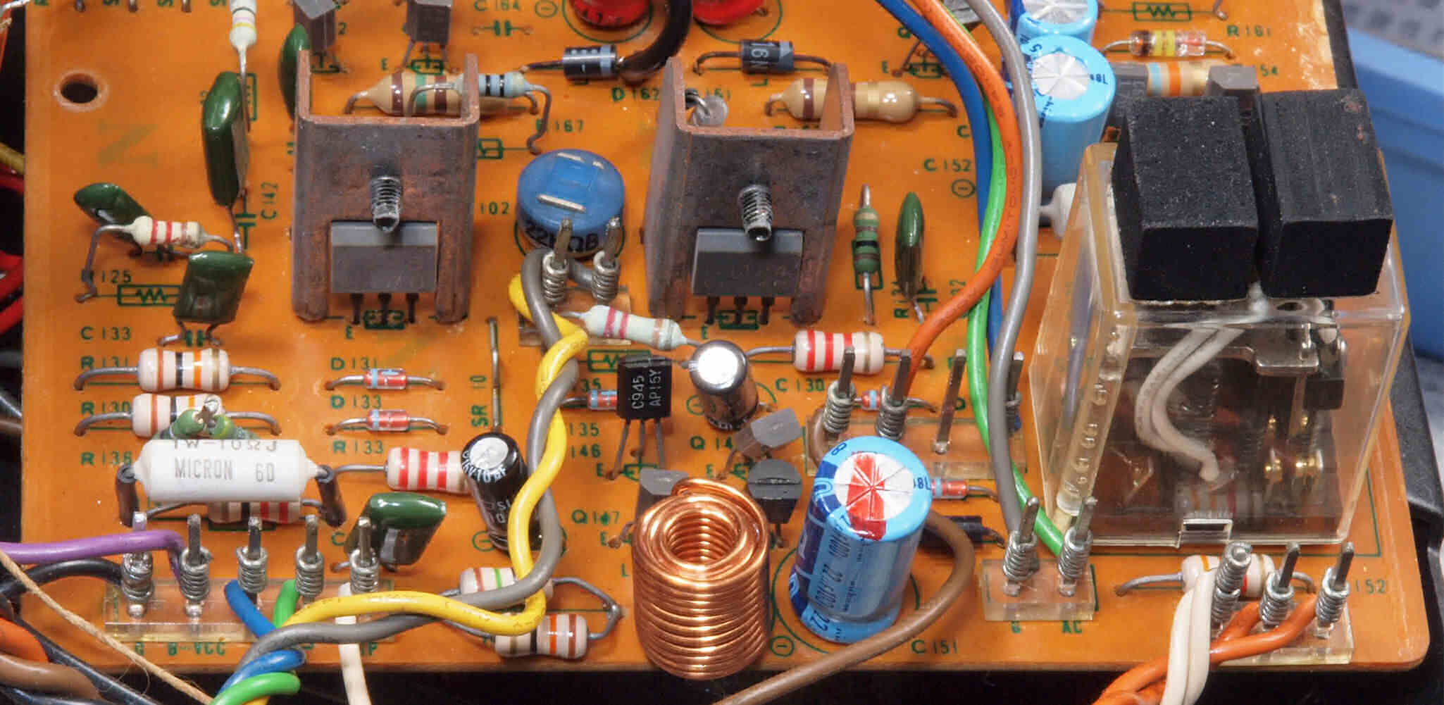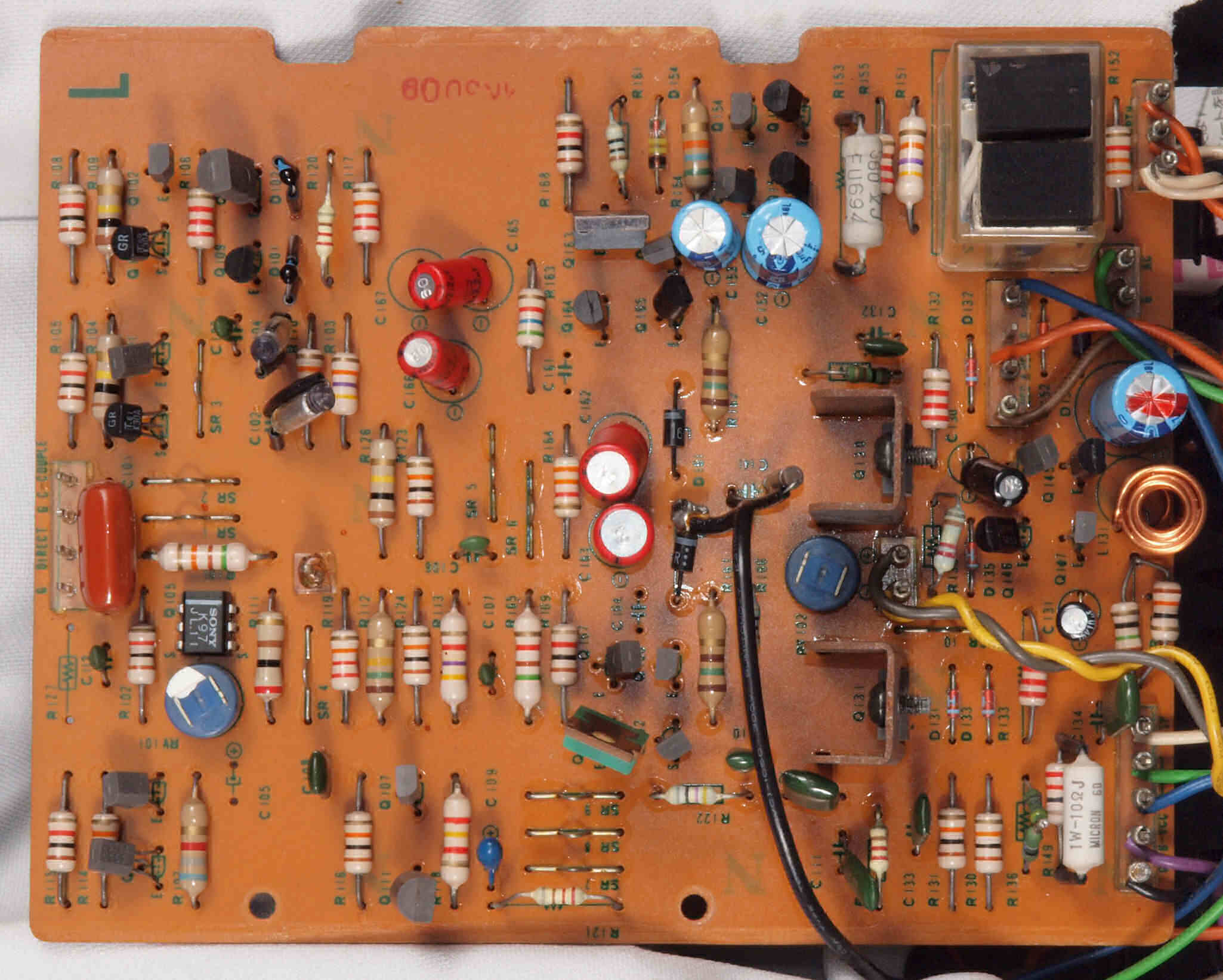 | C82. 修理後 L側アンプ基板。 リレー1個、TR(トランジスター)4個、半固定VR2個、電解コンデンサー10個交換。 | ||||||||||||||||||||||||||||||||||