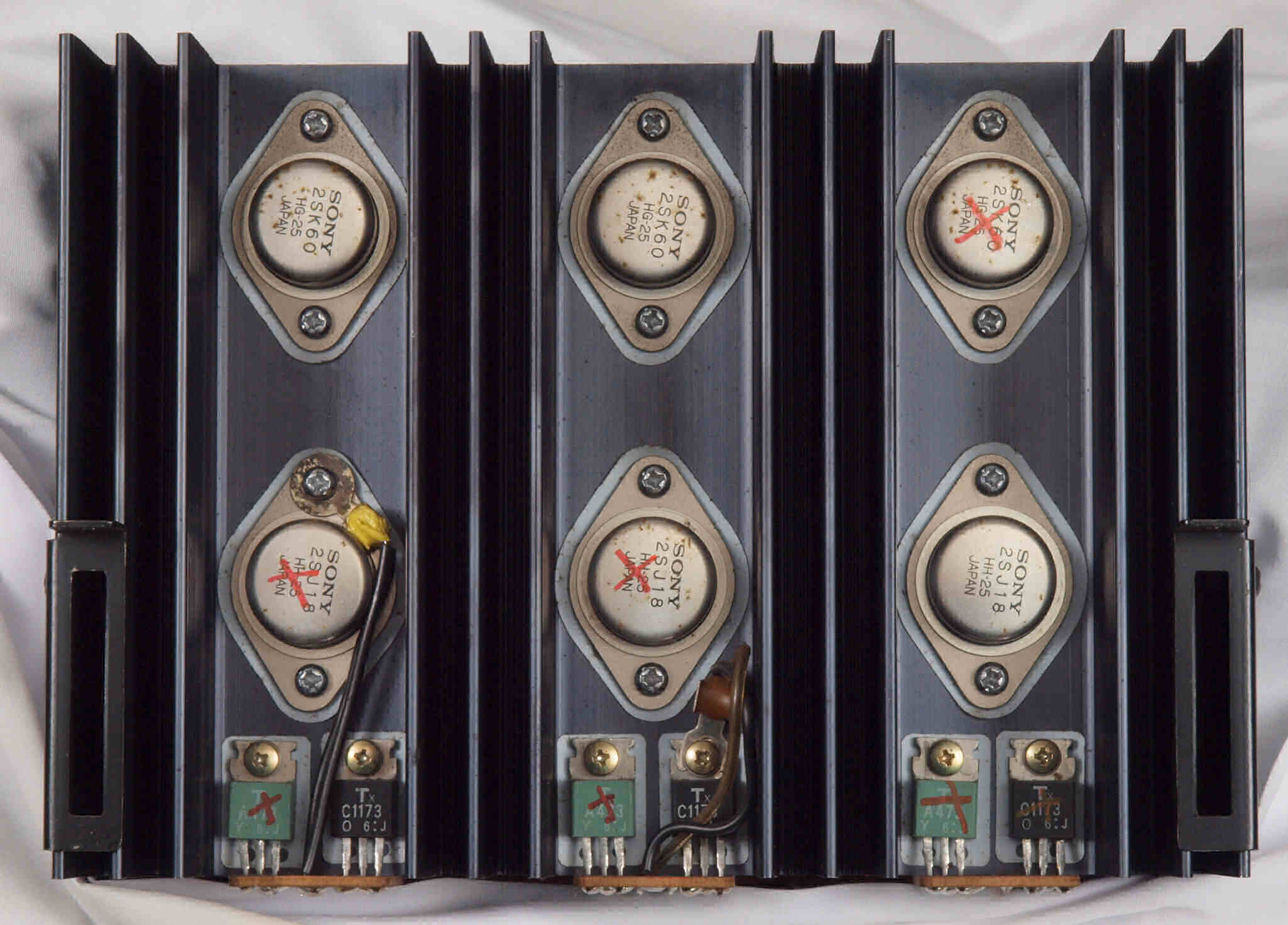 A41. 点検 L側終段V−FET。 ×印は測定器で使用不可の判定、無印でも実動作点検で不可の可能性あり。
