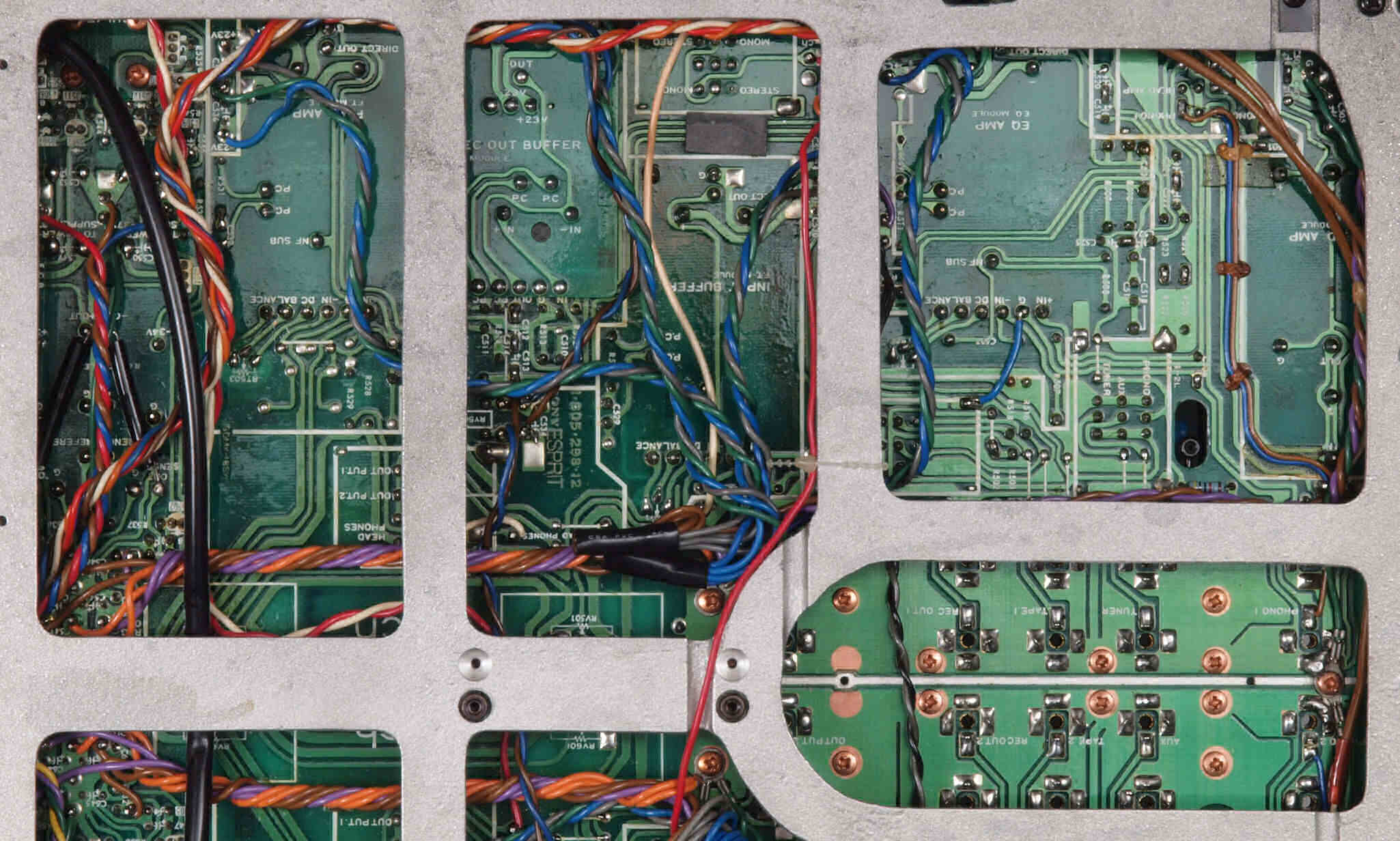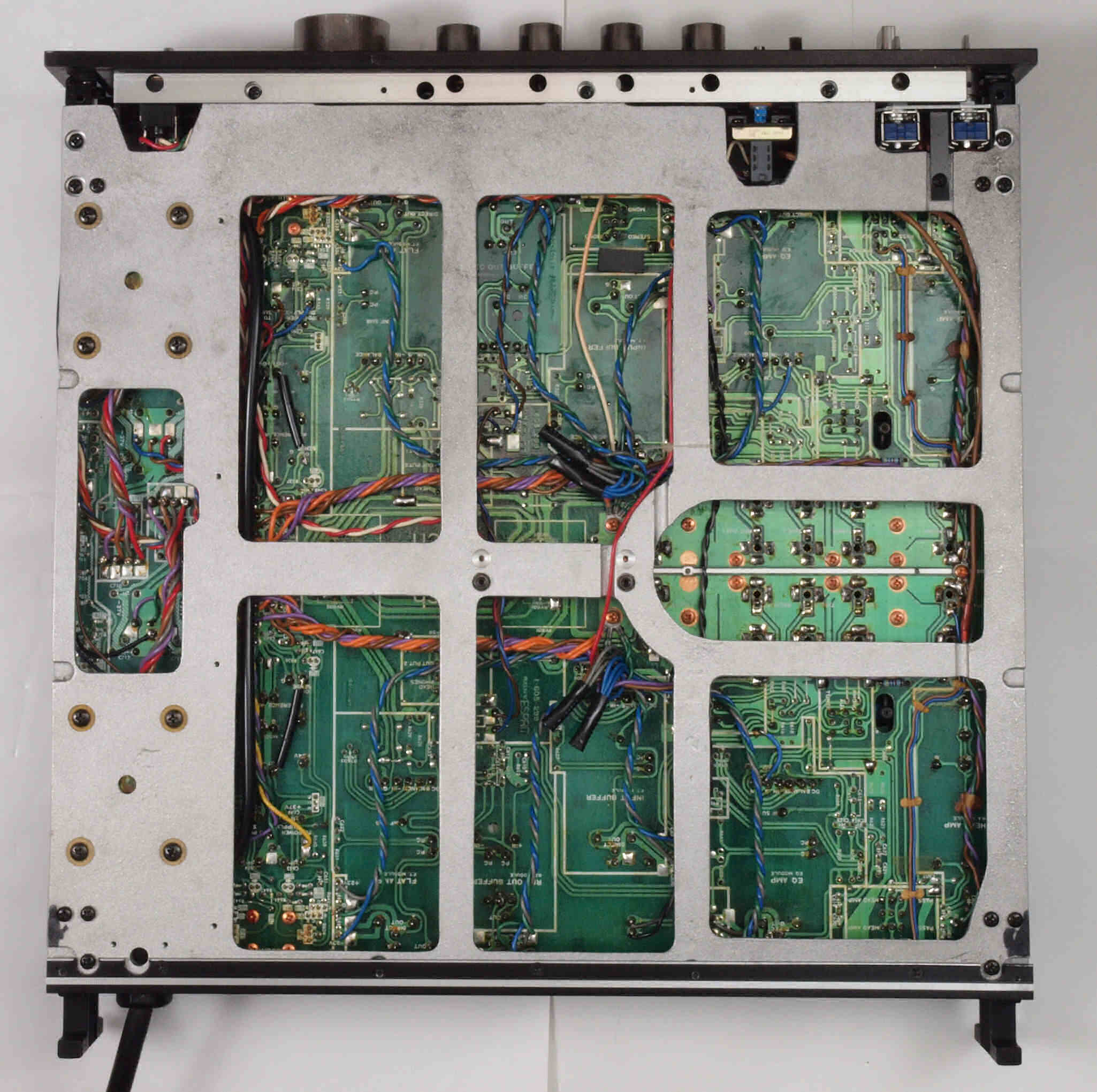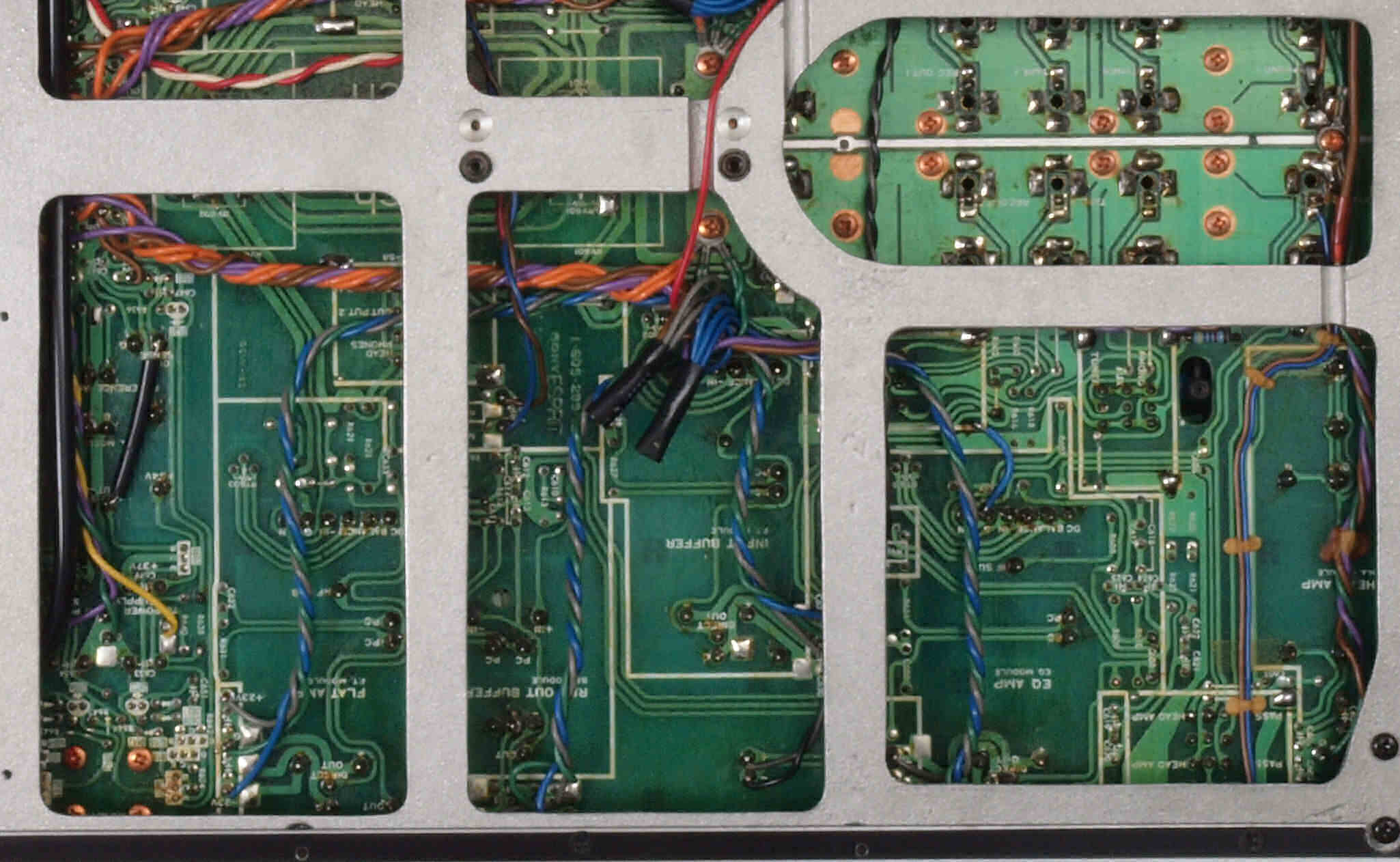 A32. 点検中 入出力RCA端子郡は基板に直付けされている。基板裏に回路があり、間隔も狭いので交換不可。