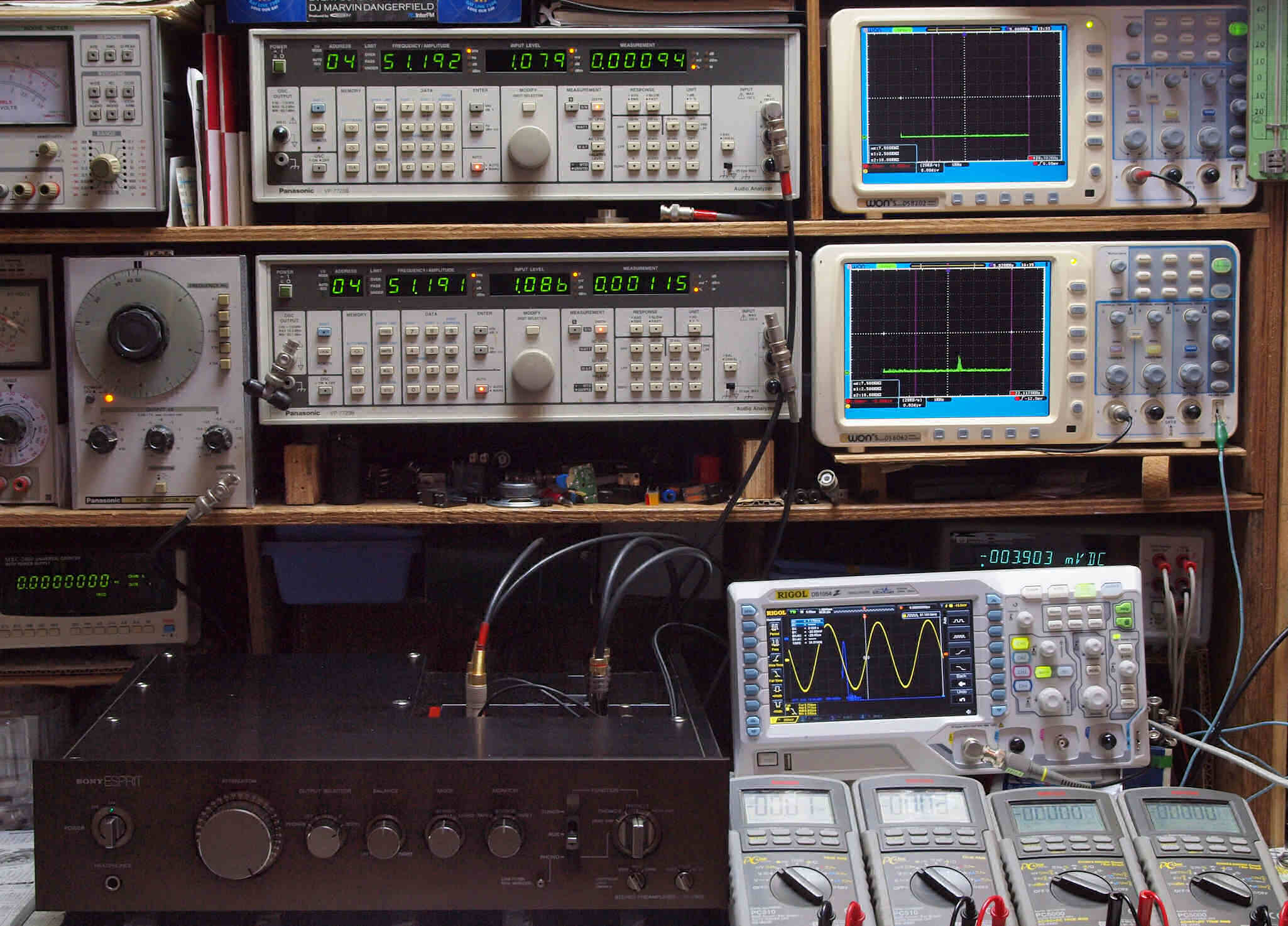 下段左端 オーディオ発振器 VP−7201A より50Hz〜100kHzの信号を出し(歪み率=約0.003%)、ATT+分配器を通し、AMPに入力。