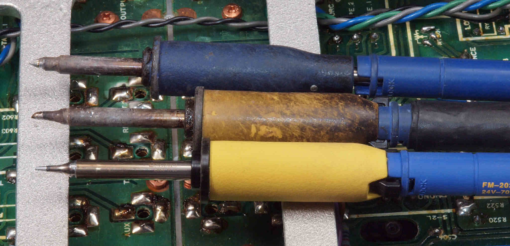 A61. 点検中 この基板は見た目より熱容量が大きく(銅箔が厚い)、又狭いので、下記の3種のコテが必要。